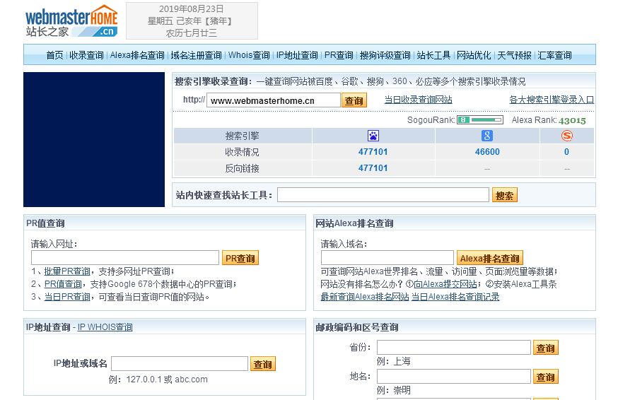 | 網站簡介: 站長之家提供網站綜合信息查詢,包括搜索引擎收錄查詢,反向鏈接查詢,Alexa排名查詢,PR查詢,IP地址查詢,WHOIS查詢,域名注冊查詢,過期域名查詢等站長工具。 |
