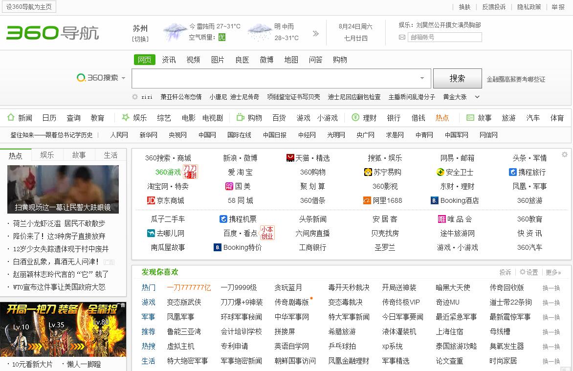 | 網(wǎng)站簡(jiǎn)介: 360導(dǎo)航--一個(gè)主頁(yè),整個(gè)世界,為用戶(hù)提供門(mén)戶(hù)、新聞、視頻、游戲、小說(shuō)等各種分類(lèi)的優(yōu)秀內(nèi)容和網(wǎng)站入口,提供簡(jiǎn)單便捷的上網(wǎng)導(dǎo)航服務(wù)。安全上網(wǎng),從360導(dǎo)航開(kāi)始。 |