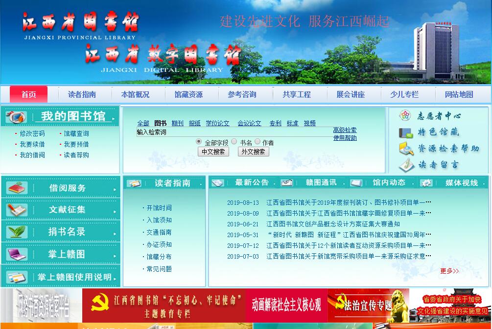 江西省圖書館創(chuàng)建于1920年,原館址南昌市中山路171號,新館位于南昌市洪都北大道198號,占地近百畝,大樓建筑面積2.5萬平方米,是江西省規(guī)模最大、藏書最多的綜合性公共圖書館,是全省文獻(xiàn)資料、圖書目錄、館際協(xié)作、圖書館學(xué)研究、信息交流和專業(yè)人才培訓(xùn)的中心。本館的使命是“傳承文明,服務(wù)社會”,其中讀者服務(wù)工作的使命是:“一切為讀者,為一切讀者”、閱讀推廣工作的使命是“傳播知識,推廣悅讀”;本館的愿景是“走科學(xué)發(fā)展之路,辦百姓喜愛之館”。本館采用主藏書樓與借閱服務(wù)樓兩部分功能區(qū)的布局結(jié)構(gòu),設(shè)有采編部、特藏部、借閱部、報刊部、少兒部、信息咨詢部、計算機(jī)技術(shù)部、研究輔導(dǎo)部、《圖書館研究》編輯部、財務(wù)科、人事科、保衛(wèi)科、辦公室、讀者服務(wù)中心14個部門,配有多種現(xiàn)代化設(shè)備,采用圖書館自動化集成系統(tǒng)(ILAS)進(jìn)行文獻(xiàn)和讀者服務(wù)管理。創(chuàng)辦了國內(nèi)外公開發(fā)行的學(xué)術(shù)刊物《圖書館研究》,2001年被文化部評為全國先進(jìn)文化單位,2004年被評為二級圖書館。作為有“物華天寶、人杰地靈”美譽(yù)的文化大省的省級館,本館現(xiàn)有藏書310余萬冊,其中中文線裝書50萬余冊。在收藏的圖書、報紙、期刊、微縮品、視聽文獻(xiàn)和電子文獻(xiàn)中,以珍貴的古籍珍善本和豐富的地方文獻(xiàn)等特色藏書著稱。中文線裝書中已整理的珍善本有2089種,地方文獻(xiàn)3500余部,地方志1200部。古籍中,南宋吉州周必大刻《歐陽文忠公集》裝幀考究、刻印精良,堪為宋代江西刻書的代表作;明崇禎間宋應(yīng)星自刻《宋應(yīng)星(談天·論氣·野議·思憐詩)四種》系海內(nèi)外孤本,極具科學(xué)價值;明嘉靖刻《江西通志》為現(xiàn)存江西通志最早最完善的版本之一,極具史料價值;明代經(jīng)折裝瓷青紙金粉寫本《太上洞玄靈寶無量度人上品妙經(jīng)》則是集裝幀、書法、繪畫藝術(shù)為一體的絕妙珍品。地方文獻(xiàn)中的《江西民國日報》、《江西省政府公報》、《江西地方教育》等 則以其收藏完整、獨具史料價值而為學(xué)人矚目。江西省圖書館設(shè)立了社科、自科、文學(xué)、外文、中文現(xiàn)刊現(xiàn)報閱覽室、中文過刊過報借閱室、少兒圖書借閱室、特藏文獻(xiàn)閱覽室、康復(fù)閱覽室、電子閱覽室、自學(xué)閱覽室、文獻(xiàn)資料復(fù)印室、數(shù)字圖書館體驗中心、總服務(wù)臺等十多個讀者服務(wù)窗口,閱覽座位1200余個,年接待讀者達(dá)100萬人次。江西省圖書館建立了自己的網(wǎng)站(域名為www.jxlibrary.net),讀者可在本館(或通過網(wǎng)站)檢索館藏中文圖書的書目數(shù)據(jù)。本館注重加強(qiáng)圖書館的社會教育職能,依托讀者服務(wù)部門和“讀者之家”,廣泛利用社會資源,配合黨和政府的中心工作,面向廣大讀者,全面開展讀書及宣傳服務(wù)活動。圖書館服務(wù)宣傳周、全民讀書月、全省讀書演講大賽、科普宣傳日、送書下鄉(xiāng)等讀者活動聲勢浩大,影響廣泛。本館創(chuàng)立的“贛圖大講堂”“贛圖展覽”“蘭蘭姐姐故事會”“貝貝樂園”“少兒‘雙有’教育公益影視展播”“中華民族傳統(tǒng)文化藝術(shù)鑒賞”“一日圖書管理員”等品牌服務(wù)項目以及各種知識競賽、讀書演講、英語沙龍等常年開展的系列讀書活動,豐富了讀者的閱讀生活,拓展了圖書館的社會功能。本館開辟的分館和圖書流通站(點)遍布社區(qū)、鄉(xiāng)鎮(zhèn)、學(xué)校、部隊、監(jiān)獄,是本館延伸服務(wù)領(lǐng)域所做得重要工作。位于本館的全國文化信息資源共享工程江西分中心已初具規(guī)模,中心配置了高性能服務(wù)器、存儲設(shè)備、防火墻和數(shù)字資源加工制作設(shè)備等,數(shù)字資源建設(shè)頗具地方特色、數(shù)字資源服務(wù)系統(tǒng)和技術(shù)支持體系能有效服務(wù)于全省各級分中心和基層點,可提供遠(yuǎn)程數(shù)字化信息服務(wù),豐富了廣大人民群眾的精神文化生活。
