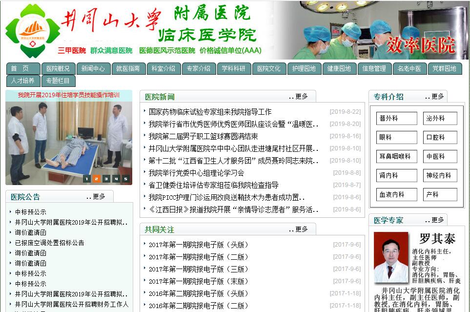 井岡山大學附屬醫(yī)院是一所集醫(yī)療、急救、教學、科研、預防保健、康復等功能為一體的三級甲等綜合性省直醫(yī)院。始建于1974年,醫(yī)院位于井岡山革命搖籃所在地——江西省吉安市中心城區(qū),醫(yī)院占地面積近16畝,醫(yī)療業(yè)務用房建筑面積3.2萬㎡,固定資產1.27億元,編制病床位1510張,醫(yī)院內設急診科、骨傷康復科、兒科、眼科、口腔科、耳鼻喉科、腎內科、內分泌科、呼吸內科、心胸外科、神經內科、神經外科、介入室、消化內科、心血管內科、骨科、血液腫瘤科、泌尿外科、普外科、婦產科、ICU、麻醉科、疼痛科、中醫(yī)科、皮膚科、肛腸科、手外科、輔助生殖科等28個臨床科室和11個醫(yī)技科室、22個職能科室??谇豢啤⒀劭?、中醫(yī)科被確定為吉安市領先學科,耳鼻咽喉科為吉安市重點學科。16層的現代化住院大樓內,擁有中心供氧、中心負吸引、中央傳呼等優(yōu)良的服務設施,寬敞明亮的病房內均配有衛(wèi)生間,壁柜、涼臺、空調等,完全能滿足不同患者的需求。醫(yī)院注重科技領先,不斷加強醫(yī)院內涵建設,醫(yī)院始終把發(fā)展重心放在提高核心競爭力方面,有計劃地引進一些精尖設備和開展技術攻關。目前,醫(yī)院擁有 3.0T核磁共振、64排128層CT、進口飛利浦四維彩超、DR數字化X光機、高壓氧艙、血液透析機、陀螺刀、美國鈥激光系統、經皮腎鏡氣壓彈道碎石系統、等離子電切鏡、超聲聯合氣壓彈道吸負碎石系統、膀胱結石大力鉗碎石系統和世界上最先進的TCD、1518K型全數字化腦電圖機、肌電圖儀、動態(tài)心電圖儀、DSA介入治療系統以及各種內窺鏡等,還擁有比較先進的康復醫(yī)療設備 。醫(yī)院能開展全腦血管造影術、腦血管手術、腦腫瘤手術、冠狀動脈成型術、支架植入冠狀動脈造影術、腫瘤放療技術、人工輔助生殖技術、腹腔鏡下胃大部分切除術、經尿道前列腺腔內剜除術、逆行胰膽管造影、人工髖關節(jié)置換等高難度手術。醫(yī)院堅持走人才強院、科技興院之路,通過外部引進和內部挖潛,打造了一支素質高、能力強、技術硬的專業(yè)技術人才隊伍,現有職工830人,其中專業(yè)技術人員780人,高級職稱人員150余人,博士后、博士、碩士等高學歷人才120人; 現有贛鄱“555”英才1名;江西省衛(wèi)生系統學術和技術帶頭人培養(yǎng)對象9人;江西省名中醫(yī)5人,江西省名中醫(yī)培養(yǎng)對象2人。吉安市新世紀學術和技術帶頭人3人;吉安市衛(wèi)生系統學術與技術帶頭人11人;吉安市衛(wèi)生系統高層次學術技術帶頭人4人,占全市4/9。 人才匯聚為醫(yī)院的發(fā)展提供了強大的智力支持。醫(yī)院堅持以學科建設為龍頭, 承擔了醫(yī)學教育3個層次、7個專業(yè),40多門必修課程、10多門選修課程的臨床教學任務 ;循證醫(yī)學科被江西省衛(wèi)計委授予“江西省醫(yī)學學科領先學科”稱號;內科、外科、耳鼻喉科等10個學科成為省級住院醫(yī)師規(guī)范化培訓基地; 全國名老中醫(yī)藥專家傳承工作室1個;承擔了國家自然基金課題6項,省級市級課題多項,在公開期刊上發(fā)表論文300余篇。血液腫瘤科被授予江西省首批癌痛規(guī)范化治療示范病房,疼痛科為全省首批“癌痛規(guī)范化治療示范病房”培育單位。牽頭成立吉安市口腔醫(yī)學會、吉安市醫(yī)學會普外專業(yè)委員會、腎內科學專業(yè)委員會、病理專業(yè)委員會等醫(yī)學類專業(yè)委員會,擴大了醫(yī)院影響力。努力構建和諧醫(yī)院,積極推行人性化服務。醫(yī)院非常注重醫(yī)德醫(yī)風建設,堅持實施人性化服務,以醫(yī)療護理規(guī)范化、服務流程系統化、就醫(yī)環(huán)境舒適化,一切以病人為中心、以病人至上為根本,使醫(yī)療質量、服務水平不斷提高,醫(yī)院先后榮獲全國綜合醫(yī)院中醫(yī)藥示范單位; 全省教育系統群眾滿意窗口單位;全省衛(wèi)生系統創(chuàng)先爭優(yōu)先進集體; 全省優(yōu)質護理服務先進病房;全省衛(wèi)生系統糾風工作先進單位;省級青年文明號;全省尿毒癥免費血透救治工作先進單位。8次在全省臨床技能大比武中榮獲優(yōu)勝單位二、三等獎。在國家衛(wèi)計委、省衛(wèi)計委、省教育廳、省總工會、共青團省委、江西省教育工會等各類先進表彰中,榮獲先進單位表彰27項,68人次獲得先進個人或各類比賽獎。發(fā)展中的井岡山大學附屬醫(yī)院將繼續(xù)堅持“以人為本,以病人為中心”的服務理念,秉承“救死扶傷,服務社會”的服務宗旨,竭誠為人民群眾提供優(yōu)質、高效、安全和便捷的醫(yī)療服務。