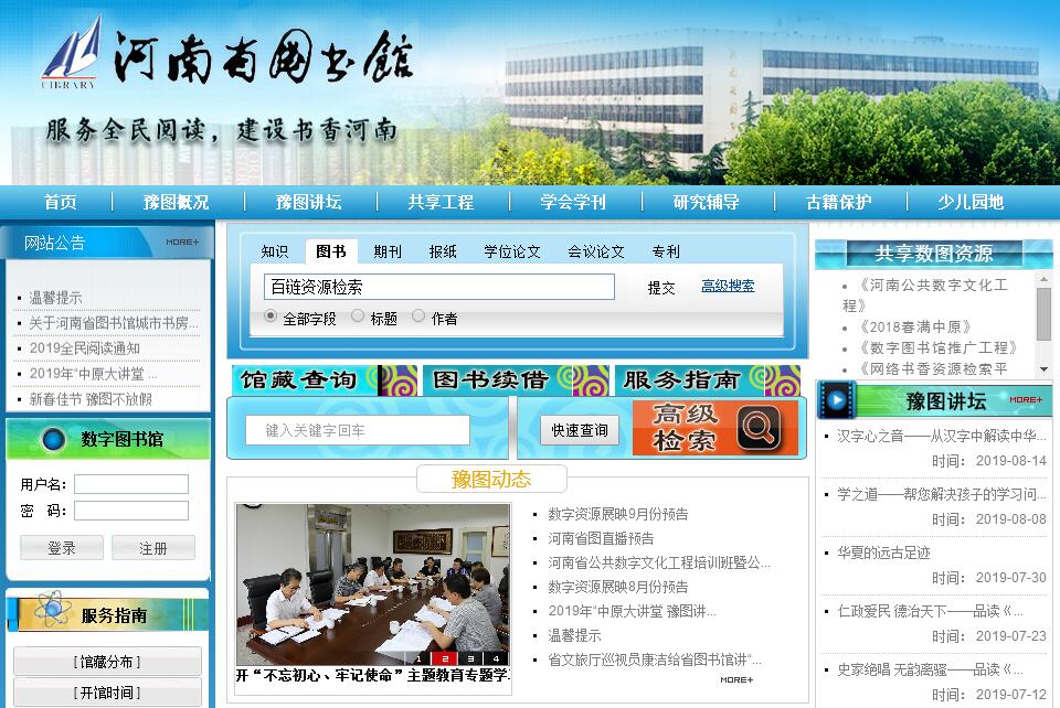 河南省圖書館是我國建館最早的公共圖書館之一。1908年7月6日,河南提學使孔祥霖呈奏撫院請創(chuàng)建“河南圖書館”,7月13日獲準。孔祥霖自任總理(館長),搜羅大梁、明道書院及學務公所舊藏共計1600種,43000余卷,以開封龍湖南岸二曾祠側之許公祠為館址,于1909年2月27(宣統(tǒng)元年農歷2月初8日)開館,定名為“河南圖書館”。1915年,以教育部“圖書館令”改為河南省立圖書館。1928年,奉省政府令改為河南省圖書館。抗日戰(zhàn)爭期間河南省圖書館遷至南陽、析川等地,1946年遷回開封。1949年3月,河南省圖書館臨時歸并到中原大學(即河南大學)圖書館,1950年元月,恢復建制,同年10月,改名為“河南省立圖書館”。1953年,又改名為“河南省圖書館”。 1957年5月20日,河南省圖書館由開封遷往省會鄭州緯二路省人民委員會禮堂。同年10月在優(yōu)勝北路建設新館舍,次年7月建成遷入,建筑面積5000余平方米。1985年在嵩山南路與伊河路交叉口西北選址建設新館, 1989年建成并交付使用,新館總建筑面積2.95萬平方米。河南省圖書館經歷了百年風雨滄桑,幾多反復,曲折發(fā)展。新中國成立后,特別是改革開放以來,河南省圖書館得到了快速發(fā)展,已初步建成為綜合性、多功能的現(xiàn)代化圖書館。河南省圖書館始終稟承“讀者至上 服務第一”的辦館宗旨,積極開展豐富多彩的讀者活動和培訓活動。館內設有17個對外服務窗口,閱覽座席1200多個,設有河南省圖書館網站和電子閱覽室,年到館讀者達百萬人次。還在全省開設30余處外借點,進行圖書流通服務。隨著遠程訪問系統(tǒng)的開通,全省各市、縣(市、區(qū))圖書館均可共享省館數(shù)字化資源。2002年全國文化信息資源共享工程起步建設,9月建成河南省分中心平臺,擁有數(shù)字化資源15TB,以IPTV傳輸、接收模式為主,服務范圍覆蓋全省4.8萬個行政村,形成了基層文化信息資源服務網絡。業(yè)務窗口實行365天開放。積極開發(fā)館藏資源,先后創(chuàng)辦了《港澳臺報刊文摘》、《經濟文摘》、《決策參考》、《省長專遞》等二三次文獻。邀請國內、省內著名專家、學者舉辦“世紀論壇”公益講座報告會。 2011年5月,河南省圖書館將公益講座制度化,更名為“豫圖講壇”,在每周周日上午定期舉辦。截止到2013年底,“豫圖講壇”已連續(xù)舉辦153期。多種延伸服務活動深入開展,公共文化服務能力與水平不斷提高。注重自身業(yè)務研究和隊伍建設,學術成果不斷涌現(xiàn)?!逗幽蠄D書館學刊》已編輯出版160多期,成為國內圖書館學術交流的重要陣地。從2002年開始,先后編纂出版了“圖書館治學文集”等系列叢書。2009年是河南省圖書館建館100周年,編纂出版了《河南省圖書館志》、《河南省圖書館百年》、《河南省圖書館同仁文集》、《河南省市、縣圖書館古籍善本聯(lián)合目錄》、《河南省圖書館古籍善本書目》、《舊時河南縣級圖書館尋蹤》、《文獻遺產保護技術理論與實踐》、《加拿大國家圖書檔案館珍藏》等。積極參與文明單位創(chuàng)建活動,先后被上級部門授予“社科聯(lián)系統(tǒng)先進單位”、“‘三樹一講’活動先進單位”、“社會科學知識普及活動周先進組織單位”、“五好黨總支”、“先進基層工會”和“讀者喜愛的圖書館”、“鄭州市文明單位標兵”等。2004年、2009年兩次被文化部評為一級圖書館。2008年3月被國務院公布為全國古籍重點保護單位。2009年,被河南省文化強省建設和文化體制改革工作領導小組評為文化事業(yè)發(fā)展先進單位。2013年8月,被評為“全國人文社會科學普及基地”和首批 “河南省社會科學普及基地”。截止2013年底,河南省圖書館累計藏書總量達到329多萬冊(件),其中古籍50萬多冊。設有借閱部、報刊部、古籍部等10個業(yè)務部門,以及綜合辦公室等5個職能部門。