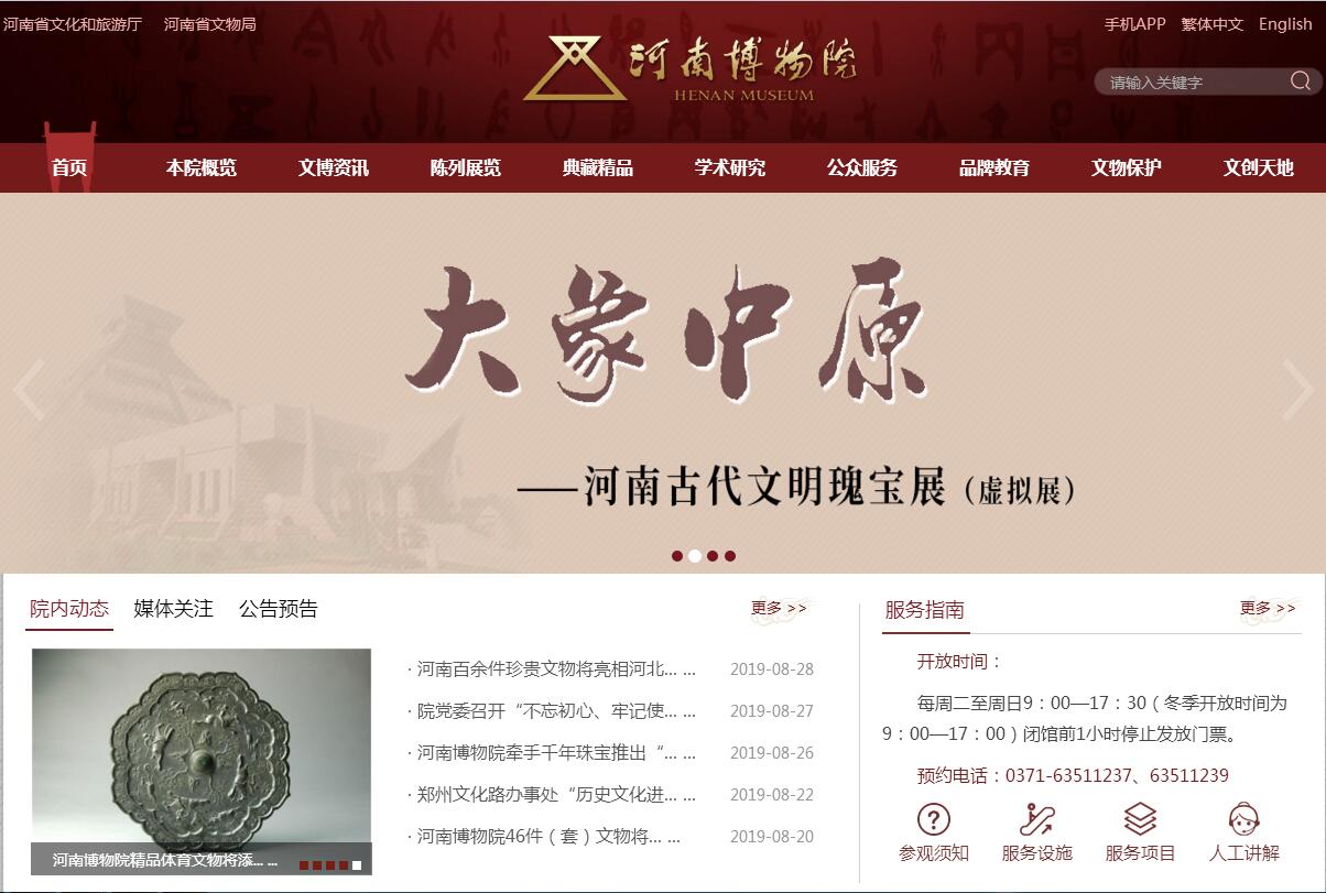 河南博物院1927年創(chuàng)建于開封,1961年隨省會遷至鄭州,1994年新館開工建設(shè),1998年5月1日正式對外開放。院區(qū)占地面積126畝,建筑面積5.5萬平方米,建筑群取“九鼎定中原”之寓意,體現(xiàn)中原文化源遠流長、博大精深的特征。2009年入選首批中央地方共建國家級博物館 。河南博物院現(xiàn)有藏品17萬余件/套,大多數(shù)為珍貴文物,其中以青銅器、玉石器、陶瓷器、石刻造像等最具特色,是見證和展示 華夏文明起源形成與發(fā)展脈絡(luò)的文化藝術(shù)殿堂 。原開放有基本陳列“中原古代文明之光”,專題陳列“河南古代石刻藝術(shù)館”“河南古代玉器館”“楚國青銅藝術(shù)館”“明清工藝珍寶館”等?,F(xiàn)主展館閉館進行功能提升,于西配樓推出“大象中原——河南古代文明瑰寶展” 等臨時展覽。河南博物院以“發(fā)揚固有文化、提倡學(xué)術(shù)研究、增長民眾知識、促進社會文明”為建院宗旨,以建設(shè)“國內(nèi)領(lǐng)先、世界 一流”博物館為目標(biāo),不斷提高公共文化服務(wù)水平,精心打造公益文化服務(wù)品牌,是領(lǐng)略中原文化魅力的重要窗口,增進文化交流合作的重要橋梁 。