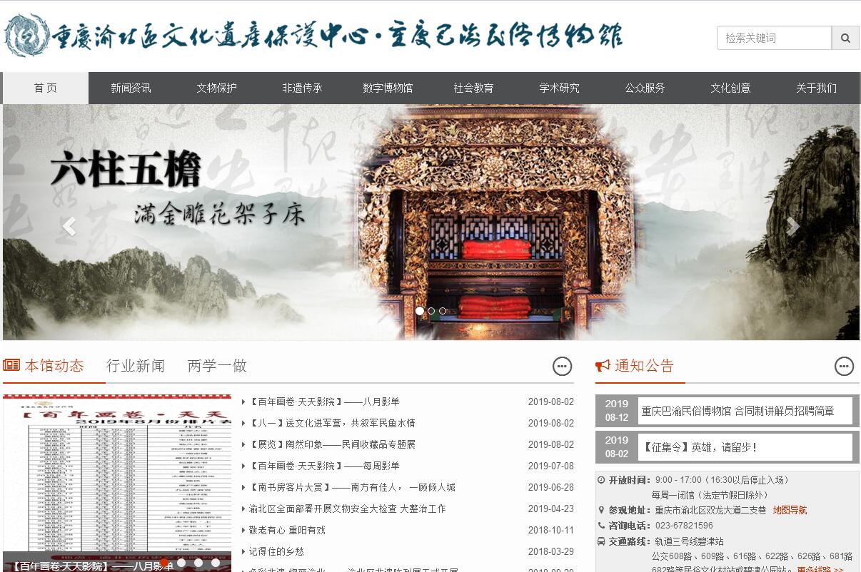 重慶市渝北區(qū)文化遺產(chǎn)保護(hù)中心,加掛重慶巴渝民俗博物館,位于渝北區(qū)雙龍大道二支巷碧津公園內(nèi),是為適應(yīng)文化遺產(chǎn)保護(hù)發(fā)展需要,于2016年在原區(qū)文物管理所基礎(chǔ)上成立的集文物保護(hù)、非遺傳承與博物館免費(fèi)開放為一體的文化遺產(chǎn)保護(hù)、研究與宣傳教育機(jī)構(gòu)。中心以保護(hù)利用文化遺產(chǎn)、弘揚(yáng)民族文化為宗旨,依法承擔(dān)全區(qū)文物保護(hù)管理、文物研究利用、非物質(zhì)文化遺產(chǎn)收集整理與保護(hù)、文化遺產(chǎn)保護(hù)相關(guān)業(yè)務(wù)培訓(xùn)等職責(zé)。重慶巴渝民俗博物館,建立于1994年,為國(guó)家三級(jí)博物館,面向社會(huì)免費(fèi)開放。2015年改陳后設(shè)有民俗館和古床館,民俗館以“民俗”為主題,展示傳統(tǒng)農(nóng)耕生產(chǎn)、物質(zhì)生活、婚俗禮儀和民間信仰等巴渝民俗事項(xiàng);古床館在博物館婚禮院的基礎(chǔ)上改建而成,以“古床”為主題,展示清代中晚期至民國(guó)時(shí)期巴渝地區(qū)各式特色古床等精品木雕家具。重慶巴渝民俗博物館以精致的展覽和濃厚的地域文化特色,成為展示渝北形象、宣傳巴渝文化的重要窗口。