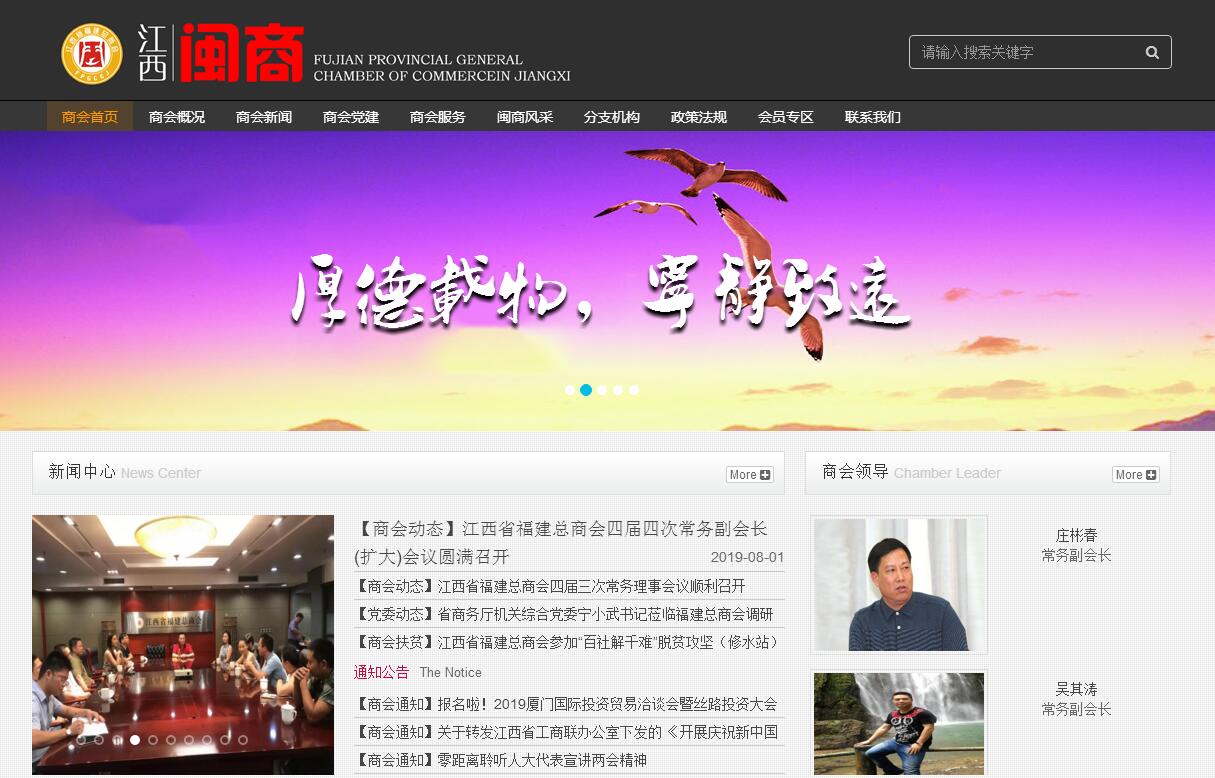 江西省福建總商會2002年11月23日成立,是經(jīng)原江西省對外經(jīng)濟(jì)技術(shù)合作辦公室批準(zhǔn)、江西省民政廳登記的具有獨(dú)立法人地位的省級異地商會,由在贛較強(qiáng)實(shí)力的閩籍企業(yè)組成。第一屆和第二屆會長由江西巨成實(shí)業(yè)有限公司董事長黃祖淵擔(dān)任,第三屆、第四屆會長由東方宏利集團(tuán)董事長韓世忠擔(dān)任。我會2013年建立了黨組織, 2015年7月經(jīng)江西省商務(wù)廳商務(wù)行業(yè)社會組織黨委批準(zhǔn),成立中共江西省福建總商會委員會,是江西省省級異地商會第一個成立黨委的商會。我會在吉安、宜春、上饒、新余、鷹潭、撫州、贛州、景德鎮(zhèn)、萍鄉(xiāng)等設(shè)區(qū)市均設(shè)有團(tuán)體會員機(jī)構(gòu),會員分布全省各地,會員企業(yè)5500多家,在贛投資總約8000億元。涉及股權(quán)投資、房地產(chǎn)投資、公路橋梁建設(shè)、機(jī)械設(shè)備制造、采礦冶煉、建材生產(chǎn)與銷售、醫(yī)療健康、酒店管理、商貿(mào)物流、現(xiàn)代農(nóng)業(yè)、新能源、環(huán)??萍肌⒅閷氂衿?、建材家居、計(jì)算機(jī)技術(shù)等眾多領(lǐng)域,為江西引入資金8000多億元,安排就業(yè)近800萬人次。閩商愛心永恒,真誠回報社會,我會成立十六年來,據(jù)不完全統(tǒng)計(jì)商會及會員捐款捐物2億多元。在贛鄱大地描繪了一幅建設(shè)江西造福于民的氣勢恢宏多彩畫卷。目前,我會有68名會員擔(dān)任閩贛兩省各級人大、政協(xié)、工商聯(lián)121個職務(wù),代表江西閩商參政議政、獻(xiàn)言獻(xiàn)策、反映訴求,閩商既以點(diǎn)石成金的經(jīng)商才能參與物質(zhì)文明建設(shè),又以充盈的政治智慧參與社會文明建設(shè),為祖國科學(xué)發(fā)展、和諧發(fā)展暢述金玉良言,奉獻(xiàn)錦囊妙計(jì)。我會依法辦會,不斷創(chuàng)新,成績斐然。連續(xù)兩次被國家民政部評為全國先進(jìn)社會組織;連續(xù)四次被江西省民政廳評為全省先進(jìn)社會組織;連續(xù)六次被江西省工商聯(lián)評為全省工商聯(lián)系統(tǒng)“先進(jìn)商會”;2014年被中國社會組織評定為“4A級商會”。2017年被中共江西省社會組織委員會評為全省性社會組織“黨建工作示范點(diǎn)”。2017-2018年度被全國工商聯(lián)評委全國“四好”商會。江西省領(lǐng)導(dǎo)表揚(yáng)閩商為江西經(jīng)濟(jì)社會的發(fā)展作出了貢獻(xiàn),福建省黨政主要領(lǐng)導(dǎo)夸獎我們干得好,為閩商爭了光。