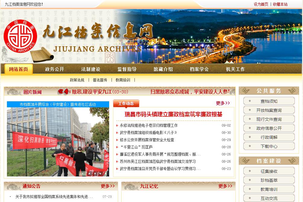 九江市檔案局是市委、市政府管理全市檔案事業(yè)的工作部門,內設機構為辦公室、業(yè)務指導科、法制教育科、檔案信息管理科(履行原檔案館工作職能)4個職能科室,其主要職能是貫徹執(zhí)行檔案工作的法律、法規(guī)和方針、政策;組織、指導、檢查、監(jiān)督,協(xié)調全市檔案工作;負責接收、收集、整理、保管和提供利用本行政區(qū)域內各個歷史時期的檔案史料;負責全市的檔案編研、信息開發(fā)、利用與管理,推進檔案信息網絡建設,充分發(fā)揮檔案信息資源作用,向社會提供檔案服務。九江市檔案局新館位于八里湖新區(qū)166號行政服務中心西樓。2015年5月投入使用,建筑面積7000平方米,其中庫房3000平方米,是集中統(tǒng)一保管市直機關、團體、企事業(yè)單位檔案資料的國家二級綜合性檔案館。館內設有查閱大廳、展覽廳、珍藏室、檔案庫房、檔案目錄數(shù)據中心和數(shù)字檔案加工室及各類檔案保護技術用房等。己初步建成為黨和國家重要檔案的安全保管基地、利用檔案開展愛國主義教育基地、政府信息公開中心、檔案利用服務中心和電子文件管理中心的“五位一體”的綜合性檔案館。