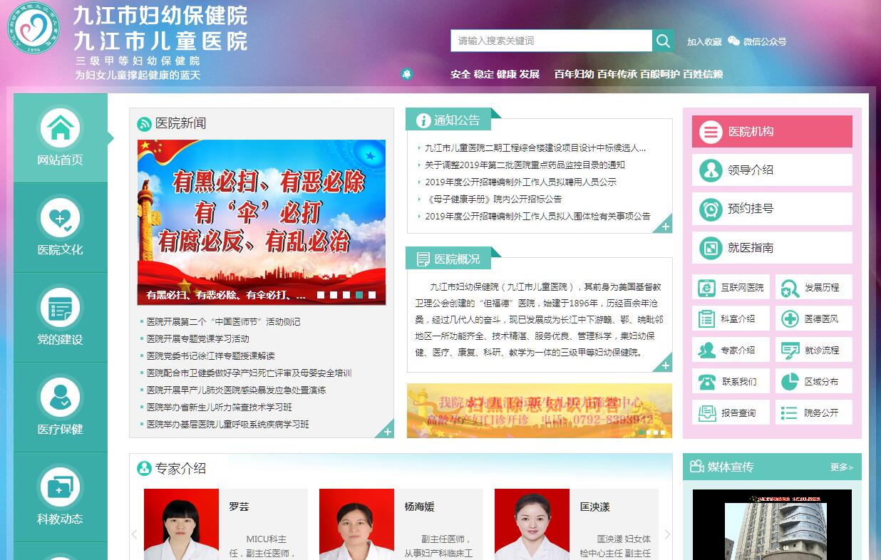 九江市婦幼保健院&九江市兒童醫(yī)院始建于1896年,其前身為美國基督教衛(wèi)理公會創(chuàng)建的“但福德”醫(yī)院,1901年創(chuàng)辦了但福德附屬護(hù)士學(xué)校,是贛北地區(qū)護(hù)士學(xué)校的發(fā)源地?,F(xiàn)已發(fā)展成為長江中下游贛、鄂、皖毗鄰地區(qū)唯一一所集婦幼保健、醫(yī)療、康復(fù)、科研、教學(xué)為一體的三級甲等婦幼保健院。2012年增冠“九江市兒童醫(yī)院”、2017年12月與市計生站合并為九江市婦幼健康計劃生育服務(wù)中心。醫(yī)院設(shè)本部、西院、保健康復(fù)大樓和計生大樓,形成了“三院四地”的發(fā)展格局。本部位于九江市潯陽區(qū)甘棠南路61號,占地面積約24畝,業(yè)務(wù)用房面積5.1萬平方米,固定資產(chǎn)4.2億元。編制床位1100張,在職職工1425人(在編人員721人),其中醫(yī)師386人、護(hù)士611人、技師91人、藥師55人、幼教11人、行政后勤271人;其中高級職稱135人、中級職稱409人;其中博士1人、碩士77人。為全國“健苗工程”新生兒遺傳代謝病救治項目醫(yī)院、全國高通量基因測序產(chǎn)前篩查與診斷服務(wù)試點資質(zhì)的醫(yī)院、全國先天性結(jié)構(gòu)畸形救助項目定點救助醫(yī)院、全國乙肝母嬰傳播零阻斷工程項目首批試點單位、中國婦女盆底功能障礙性疾病防治中心、國家自然科學(xué)基金依托單位(A類)、中國婦幼保健協(xié)會兒童眼保健示范單位、江西省殘疾兒童肢體矯治手術(shù)救助康復(fù)定點醫(yī)院、江西省兒童自閉癥救助康復(fù)定點機構(gòu)、江西省兒童“兩病”免費救治初診定點醫(yī)院、江西省農(nóng)村貧困家庭婦女“兩癌”免費手術(shù)治療定點醫(yī)院、九江市新生兒遺傳代謝性疾病篩查分中心、九江市新生兒聽力篩查中心、九江市產(chǎn)科急救中心、九江市婦女兒童急救站等。西院位于九江八里湖新區(qū),占地面積100畝,建筑面積9.8萬平方米,一期投資約3.8億元,2018年5月28日開診試運行,6月29日正式開業(yè),致力打造為“創(chuàng)新型醫(yī)院、效能型醫(yī)院、智慧型醫(yī)院、服務(wù)型醫(yī)院”。開設(shè)兒科普通門診、急診、專家門診、發(fā)熱門診、腸道門診、感染病區(qū)和兒科住院病區(qū)。擁有主任醫(yī)師3人,副主任醫(yī)師3人,大兒科主任胡列普長期在西院工作。投入資金開展“互聯(lián)網(wǎng)+醫(yī)療”的建設(shè),開通“輕支付”(微信、支付寶), 實現(xiàn)全自助掛號、診間繳費、繳納住院保證金等功能。醫(yī)院擁有1個省市共建醫(yī)學(xué)先進(jìn)學(xué)科(婦科腫瘤科),8個省市共建學(xué)科(新生兒科、婦科腫瘤科、婦產(chǎn)科微創(chuàng)、小兒呼吸內(nèi)科、產(chǎn)科、兒童骨科、小兒普通外科、小兒神經(jīng)內(nèi)科),2個市級重點??疲ㄐ律鷥嚎?、輔助生殖科),2個省級住院醫(yī)師規(guī)范化培訓(xùn)基地(婦產(chǎn)科、兒科),1個省級專科護(hù)士實習(xí)基地(產(chǎn)科),為九江市級產(chǎn)科、兒科、婦科質(zhì)量控制中心。開展了胎兒醫(yī)學(xué)門診、母體醫(yī)學(xué)門診、產(chǎn)科危重癥科、妊娠糖尿病等??啤ICU、婦科盆底重建???、內(nèi)分泌婦科、腫瘤婦科、宮頸疾病科、婦女皮膚科,兒童保健部(新生兒疾病篩查科、兒童康復(fù)科、兒童眼保健科、兒童耳鼻喉保健科、兒外科、 NICU(足月兒、早產(chǎn)兒病區(qū))、兒童呼吸專科、兒童內(nèi)分泌專科、兒童心血管???、兒童血液??啤和瘜??、兒童腎病???、兒童神經(jīng)??啤和L(fēng)濕免疫???、兒童重癥監(jiān)護(hù)科、兒童感染性疾病科等特色學(xué)科。近年來,開展了試管嬰兒、放射介入治療、盆底功能診治、聽力及眼病篩查、夫精人工授精、宮腹腔鏡、聚焦超聲腫瘤無創(chuàng)治療、陰式全子宮切除術(shù)、產(chǎn)前診斷、分娩鎮(zhèn)痛、新生兒換血、亞低溫治療新生兒缺血缺氧性腦病、呼吸機治療早產(chǎn)兒呼吸窘迫綜合癥、極低體重兒治療與護(hù)理等等多項先進(jìn)技術(shù)。我院試管嬰兒技術(shù)成功率穩(wěn)定在60%以上,各項指標(biāo)處于全國先進(jìn)水平,首例試管嬰兒(龍鳳胎)于2014年11月24日出生,目前已成功完成900余例手術(shù)。2016年啟動等級醫(yī)院復(fù)審工作,以創(chuàng)“三甲”為抓手,進(jìn)一步加強醫(yī)院內(nèi)涵建設(shè),提高醫(yī)院管理水平和服務(wù)效率。2017年3月份醫(yī)院牽頭成立了九江區(qū)域婦幼醫(yī)療保健聯(lián)盟,落實牽頭醫(yī)院責(zé)任,開展分級診療工作,醫(yī)院購置了奔馳新生兒及孕產(chǎn)婦轉(zhuǎn)運救護(hù)車開展了區(qū)域性危重癥新生兒及孕產(chǎn)婦轉(zhuǎn)運,自2014年轉(zhuǎn)運危重癥新生兒1839人次。2017年1月至2018年8月基層醫(yī)療機構(gòu)轉(zhuǎn)入危重癥孕產(chǎn)婦及新生兒1682人次。婦幼醫(yī)療聯(lián)盟的開展確保了母嬰安全。突出一級、二級預(yù)防與主動服務(wù)的理念,落實婦幼安康工程及轄區(qū)“兩綱”年度目標(biāo)。履行市級婦幼保健院的職能,開展婦幼健康、母嬰安全業(yè)務(wù)指導(dǎo)與督查,信息質(zhì)控指導(dǎo),選派市級專家下基層業(yè)務(wù)指導(dǎo),協(xié)助市衛(wèi)計委完成婦幼重點項目、婦幼信息監(jiān)測、基層指導(dǎo)培訓(xùn)等指令性任務(wù),提高轄區(qū)母嬰安全及民生項目管理質(zhì)量,