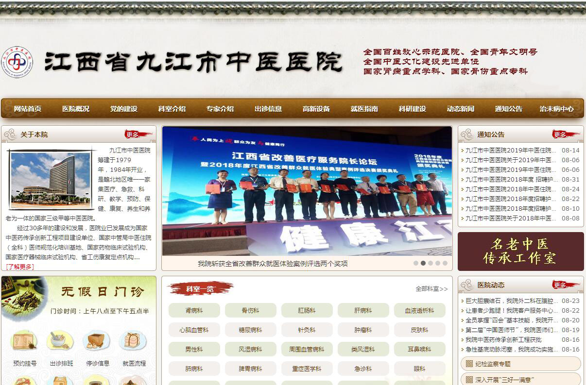 九江市中醫(yī)醫(yī)院籌建于1979年,1984年開業(yè),是贛北地區(qū)唯一一家集醫(yī)療、急救、科研、教學(xué)、預(yù)防、保健、康復(fù)、養(yǎng)生和養(yǎng)老為一體的國家三級甲等中醫(yī)醫(yī)院。經(jīng)過30多年的建設(shè)和發(fā)展,醫(yī)院業(yè)已發(fā)展成為國家中醫(yī)藥傳承創(chuàng)新工程項(xiàng)目建設(shè)單位、國家中管局中醫(yī)住院(全科)醫(yī)師規(guī)范化培訓(xùn)基地、國家藥物臨床試驗(yàn)機(jī)構(gòu)、國家醫(yī)療器械臨床試驗(yàn)機(jī)構(gòu)、省工傷康復(fù)定點(diǎn)機(jī)構(gòu)、九江區(qū)域中醫(yī)聯(lián)盟理事長單位、江西中醫(yī)藥志愿者聯(lián)合會(huì)九江分會(huì)會(huì)長單位,還是江西中醫(yī)藥大學(xué)附屬九江中醫(yī)院和九江臨床醫(yī)學(xué)院、上海中醫(yī)藥大學(xué)附屬龍華醫(yī)院技術(shù)協(xié)作醫(yī)院、南部戰(zhàn)區(qū)總醫(yī)院軍民共建醫(yī)院、北京天壇醫(yī)院??坡?lián)盟成員單位、教育部大學(xué)生校外實(shí)踐基地、省教育廳研究生創(chuàng)新示范基地、江西熱敏灸醫(yī)院九江分院等。醫(yī)院現(xiàn)已形成“一院兩區(qū)”和一個(gè)社區(qū)服務(wù)中心的發(fā)展格局,占地面積共110余畝,醫(yī)療用房面積近12.27萬平方米。其中,2011年4月南院大樓投入使用并榮獲國家“魯班獎(jiǎng)”和省“杜鵑花獎(jiǎng)”。醫(yī)院編制床位1000張,開放床位1075張?,F(xiàn)有員工1141人。具有高級職稱120人,碩士生導(dǎo)師16人,碩士研究生學(xué)歷138人。擁有1.5T核磁共振、128層螺旋CT、DR等高精尖設(shè)備2800余臺(tái)(件)。醫(yī)院設(shè)立內(nèi)設(shè)機(jī)構(gòu)25個(gè),病區(qū)20個(gè),臨床科室29個(gè),醫(yī)技科室11個(gè),中醫(yī)專病門診43個(gè)。其中,國家臨床重點(diǎn)??疲ㄖ嗅t(yī)專業(yè))2個(gè)(腎病科、腫瘤科)、國家中醫(yī)藥管理局重點(diǎn)學(xué)科1個(gè)(腎病科)、國家中醫(yī)藥管理局重點(diǎn)???個(gè)(腎病科、骨傷科、腫瘤科、肝病科),2個(gè)重點(diǎn)專科(腎病科、骨傷科)榮登“中國最佳臨床型??啤卑瘢瑖抑嗅t(yī)藥管理局名老中醫(yī)藥傳承工作室4個(gè)(熊澤民、丁德秭、幸良詮、付義),流派傳承工作站1個(gè)(內(nèi)傷伏氣致病學(xué)術(shù)流派);治未病中心、腎病科、腫瘤科、骨傷科、肝病科、護(hù)理學(xué)、臨床藥學(xué)室分別是國家中醫(yī)藥管理局“治未病”預(yù)防保健服務(wù)扶優(yōu)單位和重點(diǎn)??茀f(xié)作組成員單位;此外,還擁有國家級區(qū)域中醫(yī)診療中心候選???個(gè)(腎病科、骨傷科、兒科),江西省中醫(yī)優(yōu)勢病種區(qū)域治療中心3個(gè)(腎病科、骨傷科、肝病科),江西省重點(diǎn)臨床???7個(gè),市級質(zhì)控中心2個(gè)(九江市腎臟病學(xué)專業(yè)質(zhì)量控制中心、九江市康復(fù)醫(yī)療質(zhì)量控制中心)。醫(yī)院擁有享受國務(wù)院津貼專家1人,全國名老中醫(yī)藥專家學(xué)術(shù)經(jīng)驗(yàn)繼承指導(dǎo)老師4人,全國中醫(yī)醫(yī)院職業(yè)化管理高級研修人才1人,全國第三批優(yōu)秀中醫(yī)臨床人才1人,國家中醫(yī)藥會(huì)計(jì)領(lǐng)軍人才1人,江西省中醫(yī)藥管理和健康政策高級研修人才1人,省學(xué)術(shù)與技術(shù)帶頭人3人,省名中醫(yī)8人,省中青年名中醫(yī)培養(yǎng)人5人,市突出貢獻(xiàn)人才1人,市專業(yè)技術(shù)優(yōu)秀拔尖人才4人,市委市政府直接聯(lián)系人才2人,市“雙百雙千”領(lǐng)軍人才4名,市名醫(yī)13名。國際級學(xué)會(huì)常務(wù)理事1人、理事4人;國家級專業(yè)學(xué)會(huì)副主任委員、副會(huì)長3人,常務(wù)委員、常務(wù)理事6人,委員18人;省級專業(yè)學(xué)會(huì)副主任委員、副會(huì)長6人,常務(wù)委員、常務(wù)理事17人,委員66人。醫(yī)院始終堅(jiān)持中醫(yī)藥辦院方向,充分發(fā)揮中醫(yī)藥特色優(yōu)勢,借助九江區(qū)域中醫(yī)聯(lián)盟、九江中醫(yī)藥志愿者聯(lián)合會(huì)等平臺(tái),廣泛開展中醫(yī)藥“五進(jìn)”“冬病夏治”“冬令進(jìn)補(bǔ)”等活動(dòng)。在南院大樓設(shè)計(jì)理念中,融入中醫(yī)陰陽太極,并興建了杏林文化博物館;在建筑物命名上,使用華佗樓、扁鵲樓等。在臨床工作中,遴選專業(yè)優(yōu)勢病種,實(shí)施并優(yōu)化臨床路徑,突出運(yùn)用中醫(yī)理論和中藥外敷內(nèi)用以及非藥物療法開展診療活動(dòng),每個(gè)病區(qū)還設(shè)立了中醫(yī)綜合治療區(qū)。醫(yī)院傳統(tǒng)和現(xiàn)代中藥品種齊全、藥材道地,首選使用醫(yī)院制劑、協(xié)定處方等。積極主辦“杏林大講堂”“黃帝內(nèi)經(jīng)”和聯(lián)合舉辦“名醫(yī)在身邊”電視欄目等,廣泛普及推廣中醫(yī)藥知識(shí),醫(yī)院還常年免費(fèi)提供中藥養(yǎng)生保健茶和組織練習(xí)“八段錦”等,較好滿足了不同層次中醫(yī)藥健康需求。近五年,醫(yī)院省科技廳科研課題立項(xiàng)1項(xiàng),成果鑒定1項(xiàng),廳級科研課題立項(xiàng)62項(xiàng),結(jié)題37項(xiàng),市級科研課題立項(xiàng)31項(xiàng),結(jié)題22項(xiàng)。其中,腎病科省科技廳科研項(xiàng)目《養(yǎng)血祛瘀泄?jié)岱ㄑ泳徛阅I衰竭進(jìn)展技術(shù)的創(chuàng)建與應(yīng)用》科研項(xiàng)目,榮獲2017年度江