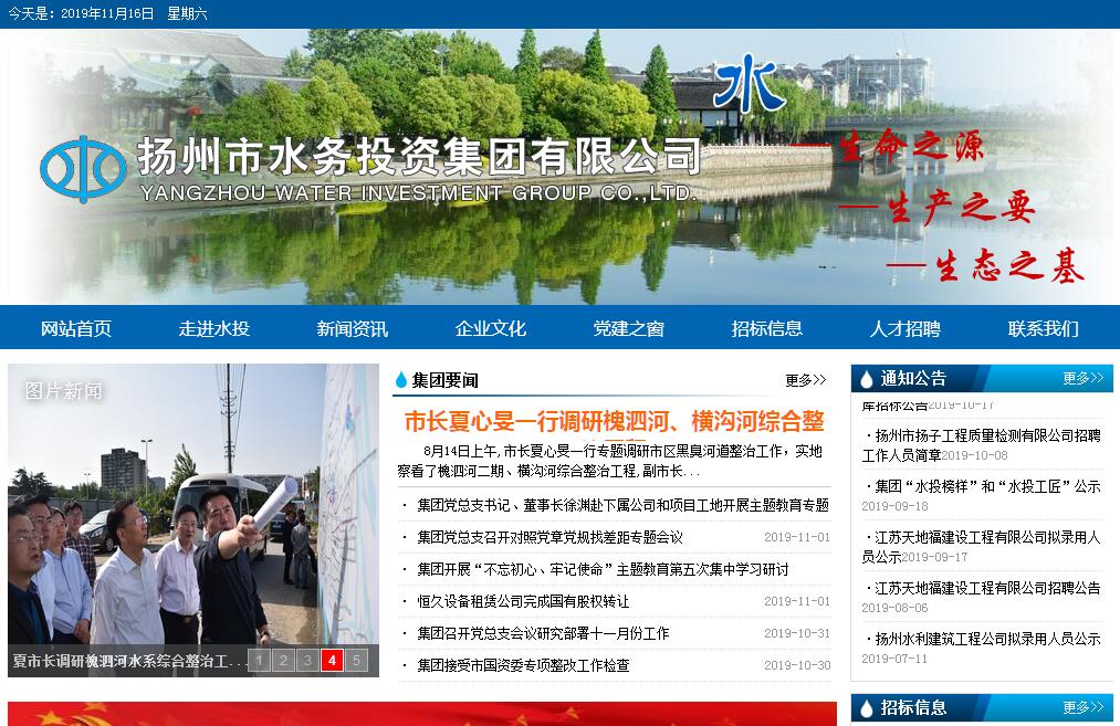 揚(yáng)州市水務(wù)投資集團(tuán)有限公司組建于2013年8月,是由揚(yáng)州市人民政府出資設(shè)立的國有獨(dú)資公司,集團(tuán)總資產(chǎn)13.5億元,注冊資本4.53億元。集團(tuán)專業(yè)從事水務(wù)投融資、水利工程建設(shè)、水生態(tài)治理、農(nóng)業(yè)綜合開發(fā)和設(shè)備租賃等業(yè)務(wù),是推進(jìn)城市水生態(tài)文明建設(shè)以及涉水工程項(xiàng)目的投融資平臺和建設(shè)主體。集團(tuán)內(nèi)設(shè)7部2室,分別為辦公室、黨群工作部(人力資源部)、監(jiān)察室、投資發(fā)展部、工程管理部(安全監(jiān)督部)、財務(wù)審計(jì)部(企業(yè)管理部)。現(xiàn)有全資及控股公司3家,分別為江蘇天地福建設(shè)工程有限公司、江蘇天地潤生態(tài)科技股份有限公司、揚(yáng)州恒久設(shè)備租賃有限公司;參股公司為揚(yáng)州市揚(yáng)子工程質(zhì)量檢測有限公司。集團(tuán)秉承為生態(tài)文明擔(dān)起使命的核心價值理念,踐行“艱苦創(chuàng)業(yè)、自強(qiáng)不息”的企業(yè)精神,聚焦聚力水生態(tài)文明建設(shè)主業(yè),堅(jiān)持“投資融資、資產(chǎn)經(jīng)營、工程建設(shè)、實(shí)體經(jīng)濟(jì)”四輪驅(qū)動,著力打造集水務(wù)投融資、涉水工程建設(shè)、涉水產(chǎn)業(yè)及項(xiàng)目開發(fā)于一體的企業(yè)集團(tuán)。