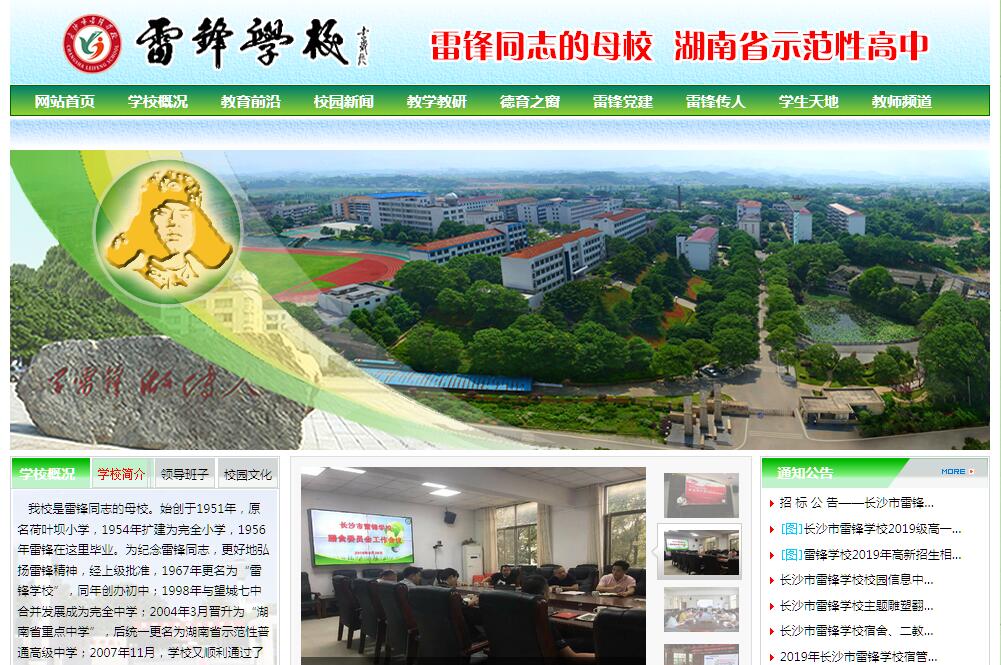 | 網(wǎng)站簡(jiǎn)介: 我校是雷鋒同志的母校。始創(chuàng)于1951年,原名荷葉壩小學(xué),1954年擴(kuò)建為完全小學(xué),1956年雷鋒在這里畢業(yè)。為紀(jì)念雷鋒同志,更好地弘揚(yáng)雷鋒精神,經(jīng)上級(jí)批準(zhǔn),1967年更名為“雷鋒學(xué)校”,同年創(chuàng)辦初中;1998年與望城七中合并發(fā)展成為完全中學(xué);2004年3月晉升為“湖南省重點(diǎn)中學(xué)”,后統(tǒng)一更名為湖南省示范性普通高級(jí)中學(xué);2007年11月,學(xué)校又順利通過(guò)了省示范性普通高中督導(dǎo)評(píng)估。我校堅(jiān)持“用雷鋒精神興校育人”的辦學(xué)理念,以“學(xué)雷鋒,做傳人”為校訓(xùn),以辦人民滿意的學(xué)校為價(jià)值追求,不斷積淀以雷鋒精神為主題的校園文化,逐步形成了“奮力拼搏,追求卓越”的校園精神,努力朝著“高質(zhì)量,有特色的三湘名?!鞭k學(xué)目標(biāo)邁進(jìn)。長(zhǎng)期以來(lái),英雄母校的建設(shè)與發(fā)展得到了各級(jí)領(lǐng)導(dǎo)的親切關(guān)懷和社會(huì)各界的高度關(guān)注。1991年12月17日,時(shí)任中共中央政治局委員、國(guó)務(wù)委員兼國(guó)家教委主任的李鐵映同志專程來(lái)校視察,對(duì)英雄母校的后續(xù)發(fā)展做出了重要指示并寄予厚望。在此之后,國(guó)家教委副主任何東昌、教育部副部長(zhǎng)王湛、省委副書(shū)記文選德、省委常委梅克保、副省長(zhǎng)潘貴玉、唐之享、許云昭、長(zhǎng)沙市委副書(shū)記吳志雄、副市長(zhǎng)曹亞等多次來(lái)校視察并指導(dǎo)工作。許云昭副省長(zhǎng)還將我校作為他的工作聯(lián)系點(diǎn)。近年來(lái),在各級(jí)領(lǐng)導(dǎo)和社會(huì)各界的關(guān)懷和支持下,全體“雷鋒人”搶抓機(jī)遇、開(kāi)拓進(jìn)取、勵(lì)精圖治、艱苦創(chuàng)業(yè),使學(xué)校獲得穩(wěn)步快速的發(fā)展,辦學(xué)規(guī)模不斷擴(kuò)大,辦學(xué)條件日臻完善。學(xué)校由1998年僅有的75畝校園面積、8000平方米建設(shè)面積、1500名師生發(fā)展為目前的212畝校園面積、近80000平方米建設(shè)面積、4000余名師生的省級(jí)示范性高級(jí)中學(xué),并已創(chuàng)建為“湖南省現(xiàn)代教育技術(shù)實(shí)驗(yàn)學(xué)?!薄ⅰ昂鲜@林式單位”。在抓好基礎(chǔ)設(shè)施建設(shè)的同時(shí),我們更是以科學(xué)、嚴(yán)謹(jǐn)、務(wù)實(shí)、細(xì)致、積極的態(tài)度不斷推進(jìn)素質(zhì)教育。首先,學(xué)校致力于“內(nèi)強(qiáng)素質(zhì),外樹(shù)形象”,著力打造一支師德高尚、業(yè)務(wù)精良、結(jié)構(gòu)科學(xué)的教師隊(duì)伍。教師學(xué)歷合格率達(dá)100%,高學(xué)歷(研究生學(xué)歷)教師達(dá)15%,高級(jí)職稱教師達(dá)35%,中級(jí)職稱教師達(dá)50%,現(xiàn)有國(guó)家、省、市級(jí)骨干教師30多人,造就了一支學(xué)歷合格、結(jié)構(gòu)合理、理念先進(jìn)的現(xiàn)代化教師隊(duì)伍。同時(shí)我們堅(jiān)持用雷鋒精神育人,著力提高學(xué)生的思想道德素質(zhì)。特別注重德育文化建設(shè),建好了學(xué)雷鋒展室、雷鋒教室、學(xué)雷鋒成果室等為主體的校內(nèi)德育基地,學(xué)雷鋒活動(dòng)制度化、經(jīng)?;?、系列化,并常學(xué)常新,不斷深化;此外,還致力于學(xué)雷鋒理論研究,承擔(dān)的省級(jí)課題“構(gòu)建系統(tǒng)工程,求實(shí)創(chuàng)新學(xué)雷鋒”獲省市獎(jiǎng)勵(lì),并與省雷鋒精神研究會(huì)一起主編了《當(dāng)代雷鋒》。2002年12月,湖南省德育工作年會(huì)暨現(xiàn)場(chǎng)經(jīng)驗(yàn)交流會(huì)在我校舉行。2003年11月,我校承辦的全國(guó)軍民第八次學(xué)雷鋒經(jīng)驗(yàn)交流會(huì)受到與會(huì)領(lǐng)導(dǎo)和代表們的高度評(píng)價(jià)。學(xué)校先后被評(píng)為全國(guó)“學(xué)雷鋒先進(jìn)集體”、湖南省“學(xué)雷鋒教育基地”、“文明衛(wèi)生單位”、長(zhǎng)沙市“文明標(biāo)兵單位”、“先進(jìn)基層黨組織”、“學(xué)雷鋒最佳集體”、“禮儀教育先進(jìn)單位”、“法制教育先進(jìn)單位”等。在抓好學(xué)生思想道德建設(shè)的同時(shí),我們緊緊抓住課堂教學(xué)這一素質(zhì)教育的主陣地,堅(jiān)持教學(xué)中心地位,致力于提高學(xué)生的文化素養(yǎng)。學(xué)校在教育改革的浪潮中不斷端正辦學(xué)思想,落實(shí)課程方案,優(yōu)化課堂教學(xué),堅(jiān)持科研興校,學(xué)校的教育教學(xué)質(zhì)量得到穩(wěn)步提升,高考質(zhì)量更是不斷攀升。2001年,首屆學(xué)生參加高考即有128人二本以上一次性上線; 2003年,學(xué)校二本以上一次性上線人數(shù)達(dá)220人;2005年二本以上一次性上線更是達(dá)到246人;2008年,二本以上一次性上線人數(shù)達(dá)241人,再創(chuàng)歷史新高。其中2002年,謝巍同學(xué)以望城縣理科狀元身份進(jìn)入清華大學(xué);2004年,有謝卓同學(xué)又摘取了望城縣理科狀元的桂冠也被清華大學(xué)錄取。2005年,有石雄同學(xué)以優(yōu)異成績(jī)考入南方航空飛行學(xué)院。2007年有唐帝、謝舟兩位同學(xué)考入北京航空航天大學(xué)飛行學(xué)院,2008年何亞同學(xué)以優(yōu)異成績(jī)考入空軍航空學(xué)院,嚴(yán)帥同學(xué)以全省體育考生文化分?jǐn)?shù)(553分)第一的成績(jī)被北京體育