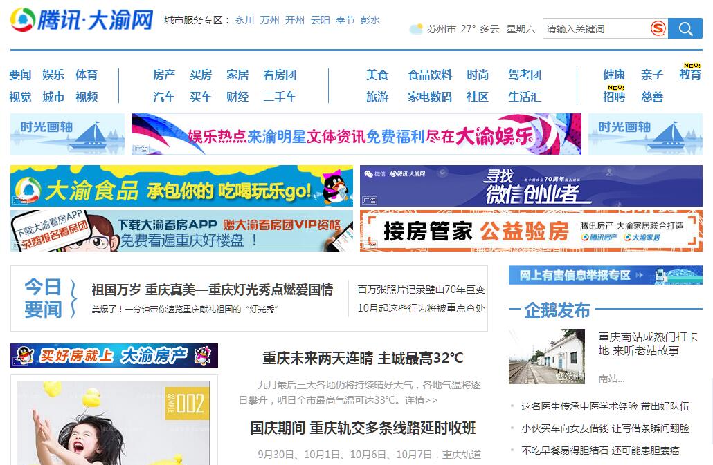 | 網(wǎng)站簡介: 騰訊·大渝網(wǎng)是騰訊(Tencent)和重慶日?qǐng)?bào)報(bào)業(yè)集團(tuán)(重慶商報(bào))聯(lián)合打造的地方綜合門戶型網(wǎng)絡(luò)媒體,是重慶人獲取本地新聞資訊和生活信息最有效的網(wǎng)絡(luò)平臺(tái)。 |
