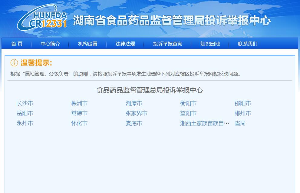 湖南省食品藥品監(jiān)督管理局投訴舉報(bào)中心于2012年9月25日經(jīng)湖南省編制委員會(huì)批準(zhǔn)設(shè)立,為湖南省食品藥品監(jiān)督管理局直屬事業(yè)單位(正處級(jí))?,F(xiàn)有工作人員10名,其中主任1名,副主任1名,下設(shè)綜合室、受理室和信息室。其主要職責(zé)是:一、接收全省范圍內(nèi)的走訪、信件、電話(12331)、網(wǎng)絡(luò)四大渠道的食品(含保健食品)、藥品、化妝品及醫(yī)療器械的違法違規(guī)行為的舉報(bào)、咨詢和投訴信息及國(guó)家總局中心交辦的事項(xiàng),對(duì)接收事項(xiàng)進(jìn)行整理、分類(lèi)、分流、督辦、審核、回訪等工作。二、負(fù)責(zé)全省市縣投訴舉報(bào)工作的指導(dǎo)、考核和協(xié)調(diào),負(fù)責(zé)全省投訴舉報(bào)工作的統(tǒng)計(jì)、分析和上報(bào)。三、負(fù)責(zé)全省12331系統(tǒng)平臺(tái)的維護(hù)。四、承擔(dān)省局具體信訪事項(xiàng)的處理及其他交辦工作。