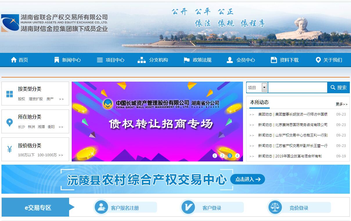 湖南省聯(lián)合產權交易所有限公司(簡稱湖南聯(lián)交所)系省人民政府批準,于2003年成立的湖南省唯一省級產權交易平臺,注冊資本7000萬元。湖南聯(lián)交所是省財政廳、省國資委等主管部門指定的相關業(yè)務交易機構,是長江流域產權交易共同市場副理事長單位、中國企業(yè)國有產權交易機構協(xié)會常務理事單位、湖南省工商局指定的產權經紀人培訓機構和省紀委確認的湖南省防治商業(yè)賄賂長效機制建設的六個試點單位之一。湖南聯(lián)交所是湖南財信金融控股集團有限公司控股子公司及集團交易板塊的運營主體,自成立以來,始終秉承“陽光交易、價值發(fā)現(xiàn)”執(zhí)業(yè)理念,不斷加強平臺和制度建設,著力拓展業(yè)務領域,從單一要素品種交易逐步發(fā)展為多個要素品種交易,發(fā)起設立了湖南股權交易所、湖南股權登記管理中心、湖南金融資產交易中心、沅陵縣農村綜合產權交易中心,形成了企業(yè)國有資產、行政事業(yè)單位國有資產、金融企業(yè)國有資產、農村綜合產權、企業(yè)貨物和服務采購、中小企業(yè)股權掛牌孵化融資、非上市公司股權登記托管、金融資產交易“八平臺”的業(yè)務格局。截至2017年年底,湖南聯(lián)交所已累計完成各類產權交易項目7948宗,成交金額546億元,確立了湖南省區(qū)域產權交易市場的行業(yè)龍頭地位,為建設富饒、美麗、幸福新湖南做出了積極貢獻。