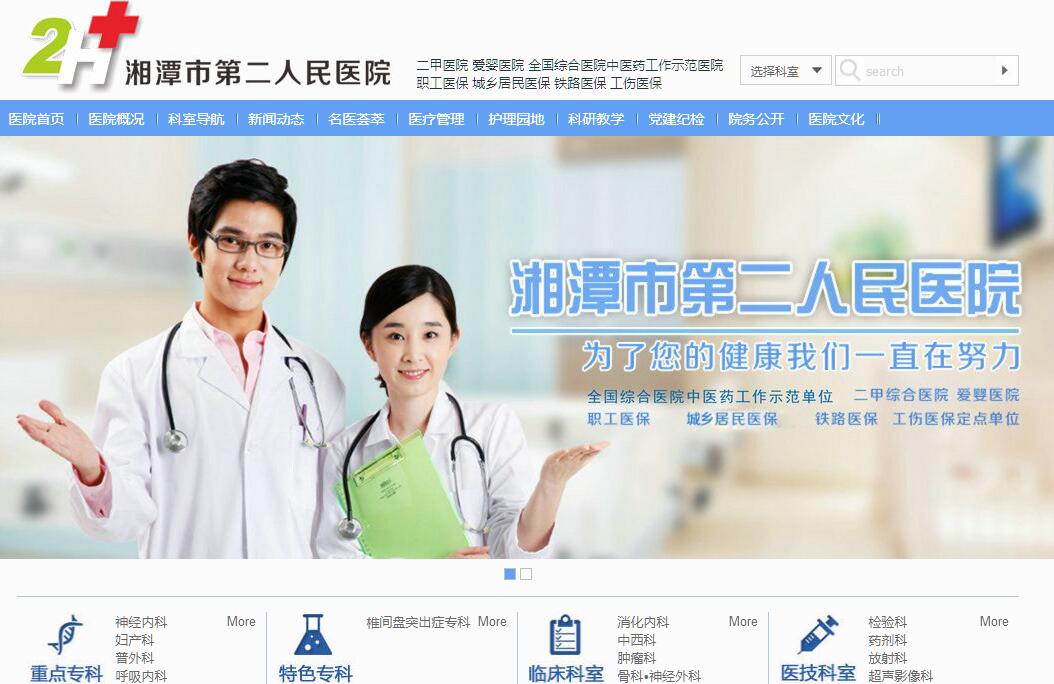 湘潭市第二人民醫(yī)院始建于1946年,是一家擁有70多年歷史,集醫(yī)療、科研、教學(xué)、預(yù)防、保健、康復(fù)為一體的全市規(guī)模最大的“二級甲等”綜合醫(yī)院、愛嬰醫(yī)院、全國綜合醫(yī)院中醫(yī)藥工作示范單位、湖南省文明衛(wèi)生單位、百姓放心醫(yī)院。醫(yī)院位于雨湖區(qū)大湖北路38號,毗鄰白石公園齊白石紀(jì)念館,占地面積29.8畝?,F(xiàn)有在職職工700余人,其中高級職稱100余人,市醫(yī)衛(wèi)名家、市優(yōu)秀專家、市專業(yè)技術(shù)骨干、市名中醫(yī)8人。開設(shè)病床540張,有25個臨床科室和7個醫(yī)技科室。擁有神經(jīng)內(nèi)科、心血管內(nèi)科、呼吸內(nèi)科、普外科、婦產(chǎn)科5個市級臨床重點???,1個市級中醫(yī)重點專科和臨床特色??浦嗅t(yī)科,1個省級癌痛規(guī)范化治療示范病房腫瘤科。湘潭市第二人民醫(yī)院始終秉承為人民健康服務(wù)的辦院宗旨,遵循博愛、濟世、踐信、崇德的院訓(xùn),牢記救死扶傷,服務(wù)人民健康,追求卓越,實現(xiàn)人生價值的使命,全心全意為人民的健康保駕護航。