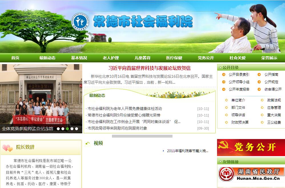 常德市社會福利院始建于1950年,是一所集收養(yǎng)、托養(yǎng)、撫孤、醫(yī)療、康復(fù)、服務(wù)于一體的綜合性省一級社會福利院,主要從事市城區(qū)“三無”孤寡老人和全市孤殘兒童的收養(yǎng)與安置,同時開展社會托老、醫(yī)療以及殘疾兒童康復(fù)服務(wù)。這里交通便利,坐落在常德市人民西路3588號,西臨建設(shè)中的三橋,東臨新河渠,有1、3、7、42路公交車停靠站。院班子成員6人,其中院長、書記各1名,副院長3名,紀(jì)檢員1名。內(nèi)設(shè)部門有辦公室、監(jiān)察室、財務(wù)部、兒童福利指導(dǎo)中心、兒童服務(wù)部、老人服務(wù)部、殘疾人托管部、后勤服務(wù)部和醫(yī)療服務(wù)部9個部室。目前擁有床位500張,占地面積4.5萬平方米,約71畝。綠化面積2.3萬平方米,建筑面積2.4萬平方米。院落布局合理,各項服務(wù)功能及配套設(shè)施齊全,綠樹成蔭,花草鮮美,環(huán)境怡人,院內(nèi)綠樹成蔭,花草鮮美,環(huán)境怡人,綠化面積達到2.3萬平方米,總建筑面積達2.06萬平方米,有三個健身休閑廣場和包括門球廠在內(nèi)的各類球廠,是老人、兒童生活的樂園。老人房間設(shè)有衛(wèi)生間、冷熱水、緊急呼叫系統(tǒng),數(shù)字電視和電話,惠民醫(yī)院科室齊全,能滿足各類醫(yī)療康復(fù)需求,醫(yī)務(wù)人員定期開展體檢、巡診和保健康復(fù)指導(dǎo)。開辦有 “相信自己”特教學(xué)校,長期對學(xué)齡前殘疾兒童進行啟蒙教育。建院以來,我院共收養(yǎng)“三無老人”1500多人,社會遺棄孤殘兒童1400多人。為了孤殘兒童早日回歸家庭,融入社會。我院先后與美國、加拿大、西班牙、挪威、比利時、冰島、丹麥、荷蘭、瑞典、瑞士等多個國家建立了棄嬰兒童領(lǐng)養(yǎng)關(guān)系,有1188名兒童被領(lǐng)養(yǎng),找到了真正屬于自己的家。每年都有國外家庭帶孩子來院尋根回訪。我院無論是對孤殘兒童的養(yǎng)育,還是對老年人的護理,都始終秉承家庭化、人性化、親情化、規(guī)范化的服務(wù)理念和“愛心永存關(guān)愛老幼服務(wù)社會真誠奉獻”的服務(wù)宗旨,堅持以人為本,不斷解放思想、開拓創(chuàng)新,積極探索新形勢下實現(xiàn)福利事業(yè)科學(xué)發(fā)展的新路子,各項工作取得可喜成績。2005年成功通過了ISO9001:2000國際質(zhì)量管理體系的認(rèn)證,成為了湖南省第二家獲得該體系認(rèn)證的福利院。近幾年,我院先后獲得“全國敬老文明號”、“全國最佳養(yǎng)老機構(gòu)”“省級文明單位”“省級園林式單位”、“檔案規(guī)范化管理省特級單位”、“省級巾幗文明崗”、“全省福利院(福利中心)管理服務(wù)先進單位”、、“湖南省孝親敬老模范單位”、湖南省民政系統(tǒng)先進集體”、“湖南省示范性福利機構(gòu)”、“涉外送養(yǎng)工作先進福利機構(gòu)”、“市檔案工作先進單位”、“市級模范職工之家”、“市直機關(guān)先進基層黨組織”、“市人民滿意先進單位”等榮譽稱號。