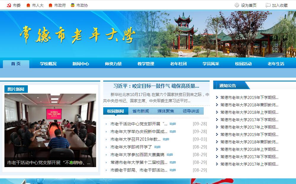 常德市老年大學位于常德市武陵區(qū)體育路20號。學校始建于1990年10月,1996年9月搬遷至現(xiàn)址。與市老干部活動中心實行兩塊牌子、一套班子的管理模式,為參照公務(wù)員管理的副處級全額撥款事業(yè)單位,歸口市委老干局管理,下設(shè)綜合科、教務(wù)科、活動科和教研室等4個科室。常德市老年大學院落占地面積53畝(其中水面面積35畝),擁有教學和活動兩幢主樓,建筑面積11000余平方米(其中活動樓5820平方米,教學樓5470平方米,分別于1996年和2010年建成投入使用)?;顒訕窃O(shè)有健身房、書畫展廳、排練廳、報告廳、棋牌室、圖書閱覽室、乒乓球室等活動場所。教學樓設(shè)有通用教室6間、多媒體教室2間,電腦、電鋼琴、電子琴、古箏等專業(yè)教室4間,舞蹈拳劍教室6間、會議室2間。市老年大學成立20多年來,順應(yīng)銀色浪潮,從創(chuàng)辦之初的3個專業(yè)百來人科發(fā)展到如今的擁有在校學員近10000人科,各專業(yè)教師77人(其中6人為省級優(yōu)秀教師),開設(shè)聲樂、器樂、戲曲、舞蹈、體育健身、文化藝術(shù)等6個系38個專業(yè)152個教學班的大型老年教育載體。作為全市最大的老年教育載體,常德市老年大學一直秉承“德行天下、樂學尚為”的校訓,始終堅持“政治建校、文化立校、活動興校、質(zhì)量強校”的辦學原則和“增長知識、陶冶情操、豐富生活、服務(wù)社會”的辦學宗旨,在市委市政府的重視關(guān)心下,在各有關(guān)部門的大力支持下,全體教職員工齊心協(xié)力,不斷加強思想政治引領(lǐng),大力推進黨組織建設(shè),充分發(fā)揮正能量作用,通過成立社團、創(chuàng)辦??⒊霭嫖募?、舉辦校園藝術(shù)節(jié)、開展惠民演出等多種校園文化活動,為廣大師生搭建起充分展示才藝的平臺,并取得了豐碩的辦學成果,學校先后被評為 “全省優(yōu)秀老年大學”、“湖南省老年大學示范?!?、 “全國示范老年大學”、“全國老年大學校園文化建設(shè)先進單位”,學?!叭椭驹阜?wù)”被評為全市十大優(yōu)秀志愿服務(wù)項目、學校黨支部被評為市直十佳“先進基層黨組織”,并與市委老干部局一起,被省文明委授予“省級文明標兵單位”榮譽稱號。