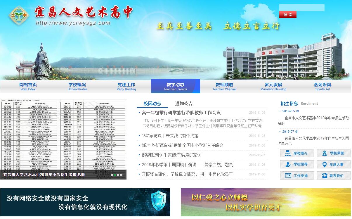 宜昌市人文藝術(shù)高中是2017年由原宜昌市第二中學(xué)和宜昌市三峽藝術(shù)高中合并而成的一所人文藝術(shù)特色高中(掛宜昌市第二中學(xué)牌子),辦學(xué)規(guī)模為每個年級13個班560人,其中普通文化班8個360人,藝術(shù)特色班5個200人。目前,分原宜昌市第二中學(xué)與宜昌市三峽藝術(shù)高中兩個校區(qū)辦學(xué)。學(xué)校正抓緊建設(shè),擬將宜昌市三峽藝術(shù)高中校區(qū)學(xué)生整體遷入宜昌市第二中學(xué)現(xiàn)址,完成學(xué)校整合。變的是名稱,不變的是堅守。宜昌市人文藝術(shù)高中是宜昌市第二中學(xué)和宜昌市三峽藝術(shù)高中的傳承者、弘揚(yáng)者。宜昌市第二中學(xué)創(chuàng)辦于1954年,其前身為譽(yù)滿湖北的“宜昌二高”。在60多年的辦學(xué)歷程中,形成了深厚的文化底蘊(yùn),以“至真、至善、至美,立德、立言、立行”的校訓(xùn)激勵師生,養(yǎng)成了“嚴(yán)謹(jǐn)、奮進(jìn)、追求卓越”的良好教風(fēng)學(xué)風(fēng),培養(yǎng)出一支教育理念先進(jìn)、專業(yè)功底深厚、教學(xué)技藝精湛、教學(xué)效果顯著的教師隊伍,為國家培養(yǎng)了大批杰出人才和合格建設(shè)者、接班人。學(xué)校先后獲得“全國管理名?!?、“全國中小學(xué)德育工作先進(jìn)集體”、“全國中學(xué)生文學(xué)社團(tuán)活動示范單位”、“湖北省安全文明校園”、“湖北省教研教改先進(jìn)單位”等榮譽(yù)稱號,被市教育局授予市“示范高中”和“市名牌學(xué)?!薄3闪⒂?004年的宜昌市三峽藝術(shù)高中堅定走藝術(shù)特色辦學(xué)之路,形成了與藝術(shù)特長教育相適應(yīng)的辦學(xué)條件和師資隊伍保障體系、音樂(舞蹈)美術(shù)專業(yè)教學(xué)和文化課教學(xué)比翼齊飛的課程保障體系及特色學(xué)校管理體系,努力促進(jìn)學(xué)生個性發(fā)展,不斷開辟藝術(shù)教育新境界,畢業(yè)生升入一本院校比例近60%,升入本科院校比例達(dá)95%以上,一大批學(xué)生升入清華大學(xué)、中國人民大學(xué)、中央戲劇學(xué)院、中國戲曲學(xué)院、中央美術(shù)學(xué)院、中國音樂學(xué)院、中國美術(shù)學(xué)院、中國傳媒大學(xué)、北京電影學(xué)院、上海音樂學(xué)院等知名高校,辦學(xué)成就蜚聲省內(nèi)外,是教育部命名表彰的“全國學(xué)校藝術(shù)教育工作先進(jìn)單位”、“全國特色學(xué)?!?。學(xué)校現(xiàn)有教職員工220多名,擁有全國、省市級拔尖人才多名,特級教師1名,省級骨干教師、優(yōu)秀教師10多名,宜昌名師6名,市級學(xué)科帶頭人及優(yōu)秀教師30余名。目前學(xué)校正以打造“全國知名、具有國際影響”的特色高中學(xué)校為目標(biāo),整合優(yōu)化兩校資源,繼承發(fā)揚(yáng)兩校榮光,主動適應(yīng)時代發(fā)展對人才培養(yǎng)的新要求、教育改革發(fā)展的新形勢,以更加昂揚(yáng)的奮斗姿態(tài),創(chuàng)造學(xué)校更加輝煌的未來。