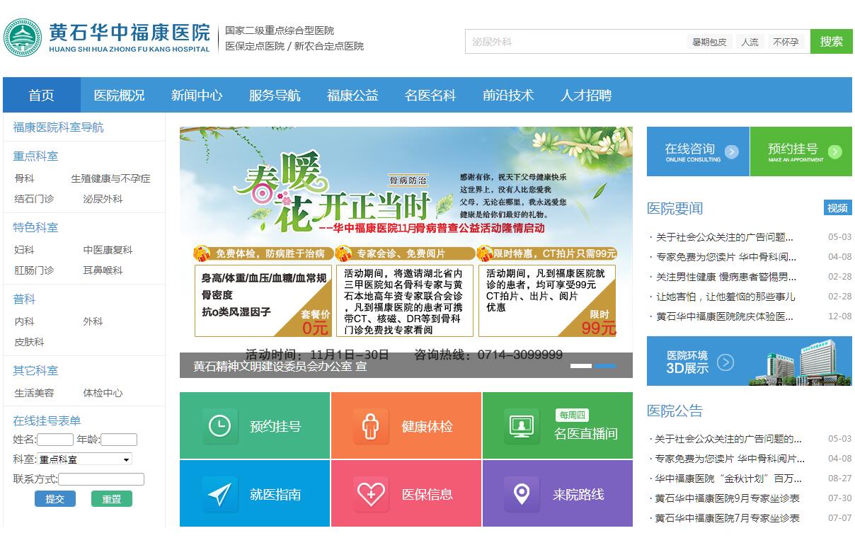 黃石華中??滇t(yī)院始建于2002年6月,位于黃石大道上窯,前身是由黃石市衛(wèi)生行政管理部門批準成立的一所??漆t(yī)院.2007年通過評審由??漆t(yī)院提升為綜合醫(yī)院。2011年隨著國家“十二五”計劃的開局,為更好的滿足黃石人民的醫(yī)療保健需求,在市委、市政府招商引資的支持下,黃石??滇t(yī)院跨越升級為專家型二級綜合醫(yī)院,正式更名為“黃石華中??滇t(yī)院”。 13年來,經(jīng)過長期不斷的發(fā)展,華中??滇t(yī)院已成為一所集臨床、教學、科研、預(yù)防、保健、康復(fù)為一體的現(xiàn)代化綜合性醫(yī)院,設(shè)有急診科、內(nèi)科、外科、婦科、不孕不育科、耳鼻咽喉科、皮膚科、中醫(yī)科、骨傷科、康復(fù)科、手外科、肛腸科、胃腸科、結(jié)石科、疼痛科、針灸推拿科、醫(yī)學美容科、泌尿外科、體檢科、醫(yī)學影像科、檢驗科等50多個臨床醫(yī)技科室。全新打造升級后的華中??滇t(yī)院使用面積將達25800平方米,將開放病床350余張?,F(xiàn)有員工350余人,其中衛(wèi)生專業(yè)技術(shù)人員260余名,高級技術(shù)職稱人員56名,醫(yī)學博士、碩士研究生8人,其中150余人曾在三甲醫(yī)院執(zhí)業(yè)。擁有磁共振(MRI)、C型臂X光機、DR成像系統(tǒng)、宮腔鏡、腹腔鏡、椎間孔鏡、汽化電切鏡、經(jīng)皮腎鏡、鼻竇內(nèi)窺鏡,北醫(yī)大診斷型數(shù)碼陰道鏡、全自動生化分析儀等高精尖診療設(shè)備。同時,是黃石地區(qū)及鄂州、浠水、蘄春等醫(yī)保、新農(nóng)合定點單位,以及黃石工傷醫(yī)療定點醫(yī)院。醫(yī)院重視學科建設(shè)。微創(chuàng)骨科是華中??滇t(yī)院重點學科之一,以椎間孔鏡下的腰椎間盤微創(chuàng)手術(shù)為重要臨床治療手段和研究方向??剖叶啻纬晒εe辦華中地區(qū)骨科醫(yī)學論壇,并與全國知名骨科醫(yī)院保持密切的交流與合作,提升業(yè)務(wù)水平。 不孕不育科室是醫(yī)院品牌科室,擁有經(jīng)驗豐富的醫(yī)學專家和技術(shù)人員,并與“北京大學第一醫(yī)院,武漢同濟協(xié)和醫(yī)院、長沙湘雅醫(yī)院、中南醫(yī)院”等技術(shù)協(xié)作、資源共享,使華中福康醫(yī)院不孕不育診療水平再上新臺階。泌尿外科、微創(chuàng)婦科是醫(yī)院優(yōu)勢學科,擁有汽化電切鏡、經(jīng)皮腎鏡,德國wolf膀胱鏡,宮腹腔鏡、北醫(yī)大診斷型電子陰道鏡等先進設(shè)備,在同級醫(yī)院中處領(lǐng)先地位。醫(yī)院重視文化建設(shè)。廣開思路,不斷進行模式創(chuàng)新,營造了內(nèi)涵濃厚的醫(yī)院文化氛圍。醫(yī)院通過進行患者滿意度調(diào)查,實行出院患者全員電話回訪等制度,極大地增強了醫(yī)護人員的使命感和責任感,有效地提高了醫(yī)療服務(wù)質(zhì)量。2011年,醫(yī)院引進3H(Home家、Hotel賓館、Hospital醫(yī)院)全新醫(yī)療服務(wù)理念,讓患者在家庭式的環(huán)境中,享受賓館式的服務(wù),接受專業(yè)化的治療。如今的黃石華中福康醫(yī)院無論在規(guī)模、醫(yī)技水平,還是在服務(wù)水平等方面都有了顯著的躍升和提高。醫(yī)院將以“專家立院,技術(shù)興院;致專致強,百年??怠睘槟繕?,以引進高級專業(yè)技術(shù)人才為堅定不移的長期戰(zhàn)略思想,攜手北京、長沙、武漢及本土資深專家,以高尚的醫(yī)德、精湛的醫(yī)術(shù),低廉的價格誠摯為各界朋友提供熱情周到的服務(wù),開啟新形勢下立院為民、情系蒼生的新篇章。