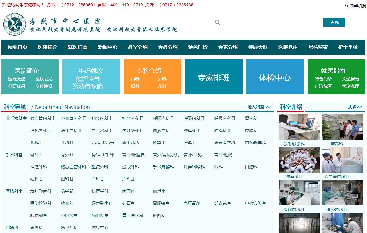 孝感市中心醫(yī)院是武漢科技大學附屬醫(yī)院,始建于1862年,其前身為英國傳教士楊格菲·約翰博士在孝感創(chuàng)建的一所小診所。歷經(jīng)一個半世紀的風雨洗禮,現(xiàn)已發(fā)展成為一所集醫(yī)療、教學、科研、保健、康復于一體的國家“三級甲等”大型綜合醫(yī)院,國際愛嬰醫(yī)院、亞洲國際緊急救護中心網(wǎng)絡醫(yī)院;是國家衛(wèi)計委腦卒中篩查與防治基地、國家和湖北省“高級卒中中心”、“中國標準胸痛中心”、全國綜合醫(yī)院中醫(yī)藥工作示范單位、“湖北省法治建設示范醫(yī)院”;也是國家住院醫(yī)師規(guī)范化培訓基地及國家全科醫(yī)師培養(yǎng)基地。醫(yī)療輻射鄂東地區(qū)及毗鄰地區(qū),擔負著孝感市530萬人民的醫(yī)療保健和衛(wèi)生服務任務。醫(yī)院本部位于孝感市廣場路6號,占地面積115畝,建筑總面積18萬平方米,擁有19層外科樓、16層門診樓、8層內科樓、12層醫(yī)技樓、5層急診樓、10層教學樓、10層仁濟院區(qū)大樓。即將峻工的占地5萬平方米的內科綜合樓,將于2019年投入使用。醫(yī)院擁有固定總資產(chǎn)9.5億多元,擁有GE公司動態(tài)500排寶石CT、德國西門子3.0T核磁共振、平板式全數(shù)字化X光機(DSA)、數(shù)字化平板乳腺機、數(shù)字平板血管機、德國西門子直線加速器、單光子發(fā)射型計算機斷層儀(ECT)、DR、CR、彩色多普勒超聲診斷儀、各種類型內窺鏡及自動藥房系統(tǒng)等一大批先進醫(yī)療設備,總值近4億元。醫(yī)院核定床位2000張,開放床位1850張;學科門類齊全,專業(yè)設置精細,設有59 個臨床科室、10個醫(yī)技科室 、29個行政職能科室;擁有輸血科、內分泌科、放射影像科、呼吸內科、兒科、新生兒科、心血管內科、皮膚科、核醫(yī)學科等9個省級重點專科及普外科等35個市級重點??颇?。年出院6.9萬余人次、年均門診量105萬余人次、年手術2.8萬余臺次。醫(yī)院擁有一支強大的人才隊伍,全院現(xiàn)有員工2032人,其中衛(wèi)生專業(yè)技術人員1755人,衛(wèi)生高級專業(yè)技術人員350人;國家二級崗位3名、三級崗位19名,享受國務院及省政府津貼專家9人、湖北省有突出貢獻中青年專家1人、孝感市有突出貢獻專家7人、孝感市優(yōu)秀人才1人、孝感市知名中醫(yī)1人、市“121”培養(yǎng)對象14人、碩士生導師36人;醫(yī)學碩士、博士386名。2011年以來,醫(yī)院共開展新技術項目752項,以微創(chuàng)技術、介入治療技術、干細胞、骨髓移植技術和分子診斷技術為支撐,逐步形成了一批具有社會影響力的??破放?。如神經(jīng)內科的急性腦血管病動靜脈溶栓與介入取栓、心血管內科的急診PCI與主動脈覆膜支架開窗置入術治療Ⅰ型主動脈夾層、呼吸內科開展的氣管內粒子支架植入術、腎內科的開展超聲引導下動靜脈內瘺球囊擴張術、婦科一病區(qū)在省內率先開展盆底重建術、康復科開展的超聲介導藥物靶向遞送技術等都在省內處于領先水平。2011年以來,醫(yī)院有52項科研成果通過鑒定,其中有50項獲國內領先水平,11項獲孝感市科技進步獎。承擔吳階平基金會立項科研2項、國家衛(wèi)計委立項科研2項,省級科研立項38項,市級27項,獲國家發(fā)明專利4項,實用新型專利155項;發(fā)表中國科技論文統(tǒng)計源期刊論文1409篇, 其中SCI論文17篇;出版專著128部?!笆濉逼陂g,醫(yī)院制定了“夯基、品牌、飛躍”三步走的中長期戰(zhàn)略規(guī)劃,確定了“做行業(yè)典范,建一流名院”戰(zhàn)略發(fā)展目標,奠定了“一主四翼”的發(fā)展格局。圍繞戰(zhàn)略發(fā)展目標,不斷優(yōu)化醫(yī)院管理的頂層設計,持續(xù)推進“落實標準、依規(guī)治院”管理理念,始終堅持“文化建院、人才強院、科教興院、質量立院”四大方針,積極推進學科建設、科技創(chuàng)新和“微孝”優(yōu)質服務“三項工作”,全面加強醫(yī)院黨的建設和精神文明建設,通過創(chuàng)新驅動、轉型升級、提質增效提升核心競爭力;通過人才培養(yǎng)、絕活破局、科研教學培育拳頭產(chǎn)品;通過攜手共建、合作共贏、開放共享,推動醫(yī)聯(lián)體發(fā)展。堅持以病人為中心,實施“大醫(yī)院,細管理”,建立和完善科學、規(guī)范、高效、合理的醫(yī)院質量考評體系與績效分配制度,通過管理精細化、手術微創(chuàng)化、內科手術化、醫(yī)技精準化的“四化”管理手段,落實醫(yī)院“安全運行五級管理”制度,致力醫(yī)療質量的持續(xù)改進, 傾情推行“微孝服務”,努力改善患者就醫(yī)體驗。在學科發(fā)展、人才培養(yǎng)、醫(yī)療服務、科研教學等方面不斷進行管理改革創(chuàng)新。多次獲得“湖北省衛(wèi)生系統(tǒng)先進單位”、“孝感市文明單位”、“百姓放心醫(yī)院”、“行風建設先進單位”等榮譽稱號。