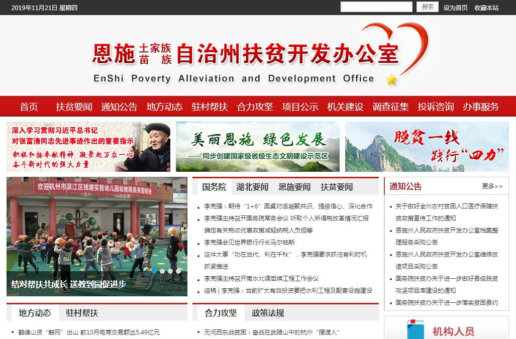 恩施土家族苗族自治州人民政府扶貧開發(fā)辦公室,為州政府工作部門。其主要職責(zé)是:(一)貫徹落實(shí)《湖北省農(nóng)村扶貧條例》和《湖北省扶持老區(qū)建設(shè)條例》;擬訂全州扶貧開發(fā)和老區(qū)建設(shè)中長期規(guī)劃;擬訂全州扶貧開發(fā)和老區(qū)建設(shè)工作的政策、措施,制定各類專項(xiàng)規(guī)劃和年度計(jì)劃,并組織實(shí)施和監(jiān)督檢查。(二)指導(dǎo)全州扶貧開發(fā)和老區(qū)建設(shè)工作,協(xié)調(diào)和推動(dòng)解決扶貧開發(fā)和老區(qū)建設(shè)工作中的重大問題。(三)根據(jù)國家和省關(guān)于各類扶貧資金的使用辦法和相關(guān)規(guī)定,會(huì)同有關(guān)部門審核、報(bào)批扶貧信貸項(xiàng)目;負(fù)責(zé)對(duì)財(cái)政扶貧資金、老區(qū)建設(shè)資金使用及項(xiàng)目實(shí)施情況進(jìn)行跟蹤檢查和督辦落實(shí),評(píng)估扶貧資金使用效率,并組織年度績效考評(píng);負(fù)責(zé)扶貧開發(fā)項(xiàng)目庫的建立。(四)負(fù)責(zé)全州各縣市黨政領(lǐng)導(dǎo)干部扶貧工作責(zé)任制考核;負(fù)責(zé)組織整村推進(jìn)、產(chǎn)業(yè)扶貧、“雨露計(jì)劃”、扶貧搬遷、老區(qū)建設(shè)等重點(diǎn)工作和脫貧奔小康試點(diǎn)工作的實(shí)施和檢查驗(yàn)收。(五)組織動(dòng)員全社會(huì)開展扶貧濟(jì)困活動(dòng);指導(dǎo)各級(jí)黨政機(jī)關(guān)組織開展定點(diǎn)扶貧;聯(lián)系州老區(qū)建設(shè)促進(jìn)會(huì)等社會(huì)團(tuán)體參與扶貧濟(jì)困活動(dòng)。(六)負(fù)責(zé)農(nóng)村貧困勞動(dòng)力轉(zhuǎn)移技能、農(nóng)業(yè)實(shí)用技術(shù)培訓(xùn)的“雨露計(jì)劃”工作;參與實(shí)施貧困地區(qū)人才扶貧計(jì)劃。(七)負(fù)責(zé)全州貧困狀況監(jiān)測和統(tǒng)計(jì)分析;組織實(shí)施對(duì)貧困人口建檔立卡工作;負(fù)責(zé)扶貧開發(fā)政策與農(nóng)村低保等制度的銜接工作。(八)承擔(dān)州扶貧開發(fā)領(lǐng)導(dǎo)小組、州扶持革命老區(qū)建設(shè)委員會(huì)、州脫貧奔小康試點(diǎn)縣工作領(lǐng)導(dǎo)小組的日常工作。(九)承辦上級(jí)交辦的其他事項(xiàng)。