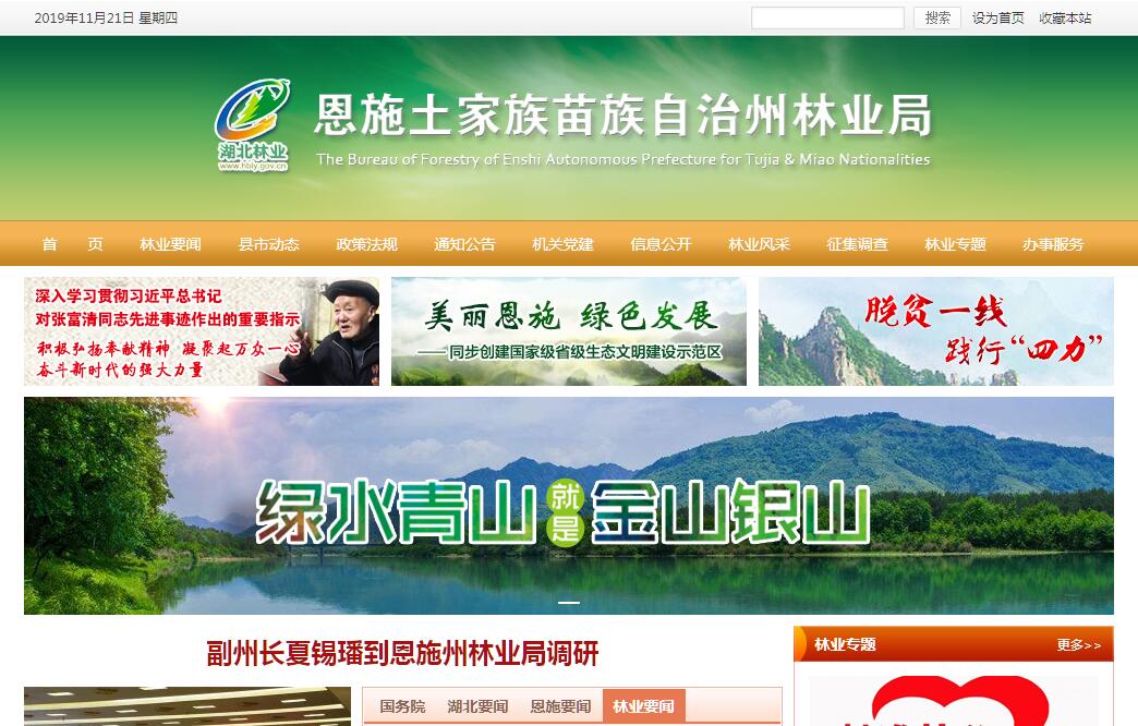 恩施土家族苗族自治州林業(yè)局主要職責(zé):(1)貫徹執(zhí)行中央和省森林資源保護(hù)和國土綠化的法律法規(guī)和方針政策,組織擬訂全州林業(yè)行政規(guī)范性文件并指導(dǎo)實施。(2)指導(dǎo)全州林業(yè)及其生態(tài)建設(shè)的監(jiān)督管理。擬訂全州林業(yè)及其生態(tài)建設(shè)的發(fā)展戰(zhàn)略、中長期規(guī)劃并組織、監(jiān)督實施。組織開展全州森林資源、陸生野生動植物資源、濕地和荒漠化的調(diào)查、動態(tài)監(jiān)測和評估,并統(tǒng)一發(fā)布相關(guān)信息。承擔(dān)林業(yè)生態(tài)文明建設(shè)的有關(guān)工作。組織、指導(dǎo)、監(jiān)督天然林保護(hù)、退耕還林等林業(yè)重點(diǎn)工程建設(shè)。(3)組織、協(xié)調(diào)、指導(dǎo)和監(jiān)督全州造林綠化工作。制定全州造林綠化的指導(dǎo)性計劃,按照相關(guān)標(biāo)準(zhǔn)和規(guī)程組織實施并監(jiān)督執(zhí)行。指導(dǎo)各類公益林、商品林的培育,組織、指導(dǎo)全州林木種苗、花卉的培育和管理。指導(dǎo)植樹造林、封山育林和植樹種草等生物措施防治水土流失工作。組織、指導(dǎo)全州荒漠化治理工作。指導(dǎo)、監(jiān)督全民義務(wù)植樹、造林綠化工作。組織指導(dǎo)全州古樹名木保護(hù)管理工作。指導(dǎo)全州林業(yè)綜合開發(fā)和低產(chǎn)林改造。承擔(dān)林業(yè)應(yīng)對氣候變化的相關(guān)工作。承擔(dān)州綠化委員會的具體工作。(4)承擔(dān)森林資源保護(hù)發(fā)展監(jiān)督管理的責(zé)任。組織、指導(dǎo)全州森林資源的管理。組織全州森林資源調(diào)查、動態(tài)監(jiān)測和統(tǒng)計。組織編制全州森林采伐限額,經(jīng)州政府批準(zhǔn)后監(jiān)督實施。監(jiān)督檢查林木憑證采伐、經(jīng)營、加工和運(yùn)輸。組織、指導(dǎo)林地、林權(quán)管理,組織實施林權(quán)登記、發(fā)證工作。擬訂林地保護(hù)利用規(guī)劃并指導(dǎo)實施,依法承擔(dān)林地征用、占用的審核審批工作。(5)組織、協(xié)調(diào)、指導(dǎo)和監(jiān)督全州濕地保護(hù)工作。擬訂全州區(qū)域性濕地保護(hù)規(guī)劃,擬訂濕地保護(hù)的有關(guān)規(guī)定。組織實施建立全州濕地保護(hù)區(qū)、濕地公園等保護(hù)管理工作。監(jiān)督濕地的合理利用。組織、協(xié)調(diào)有關(guān)國際濕地公約的履約工作。(6)組織、指導(dǎo)全州陸生野生動植物資源的保護(hù)和合理開發(fā)利用。擬訂及調(diào)整州重點(diǎn)保護(hù)的陸生野生動、植物名錄,報州政府批準(zhǔn)后發(fā)布。依法組織、指導(dǎo)陸生野生動植物的救護(hù)繁育、棲息地恢復(fù)發(fā)展、疫源疫病監(jiān)測。監(jiān)督管理全州陸生野生動植物獵捕或采集、馴養(yǎng)繁殖或培植、經(jīng)營利用,監(jiān)督管理野生動植物進(jìn)出口。承擔(dān)瀕危物種進(jìn)出口和國家保護(hù)的野生動物、珍稀樹種、珍稀野生植物及其產(chǎn)品出口的審核申報工作。(7) 指導(dǎo)林業(yè)自然保護(hù)區(qū)的監(jiān)督管理。在國家、省、州自然保護(hù)區(qū)(小區(qū)、點(diǎn))區(qū)劃、規(guī)劃原則指導(dǎo)下,依法指導(dǎo)森林、濕地、荒漠化和陸生野生動植物類型自然保護(hù)區(qū)(小區(qū)、點(diǎn))的建設(shè)和管理。監(jiān)督管理林業(yè)生物種質(zhì)資源、轉(zhuǎn)基因生物安全、植物新品種保護(hù)。組織、協(xié)調(diào)有關(guān)國際公約的履約工作。按分工承擔(dān)生物多樣性保護(hù)的有關(guān)工作。承擔(dān)進(jìn)入自然保護(hù)區(qū)緩沖區(qū)開展教學(xué)科研審批的職責(zé)。(8)承擔(dān)推進(jìn)林業(yè)改革,維護(hù)農(nóng)民經(jīng)營林業(yè)合法權(quán)益的責(zé)任。擬訂集體林權(quán)制度、國有林場等重大林業(yè)改革意見并指導(dǎo)監(jiān)督實施。擬訂農(nóng)村林業(yè)發(fā)展、維護(hù)農(nóng)民經(jīng)營林業(yè)合法權(quán)益的政策措施。指導(dǎo)、監(jiān)督農(nóng)村林地承包經(jīng)營和林權(quán)流轉(zhuǎn),指導(dǎo)林權(quán)糾紛調(diào)處和林地承包合同糾紛仲裁。指導(dǎo)國有林場(苗圃)、森林公園和基層林業(yè)工作機(jī)構(gòu)的建設(shè)和管理。(9)擬訂全州林業(yè)產(chǎn)業(yè)發(fā)展規(guī)劃,指導(dǎo)林業(yè)產(chǎn)業(yè)結(jié)構(gòu)調(diào)整。制定林業(yè)資源優(yōu)化配置政策。監(jiān)督檢查各產(chǎn)業(yè)對森林、濕地、荒漠和陸生野生動植物資源的開發(fā)利用。研究并提出林業(yè)產(chǎn)業(yè)化經(jīng)營的方針、政策并組織實施。按照國家、省有關(guān)規(guī)定,組織指導(dǎo)林產(chǎn)品質(zhì)量監(jiān)督工作。對全州各種經(jīng)濟(jì)成份的林業(yè)企業(yè)實行宏觀管理和指導(dǎo),規(guī)范全州林業(yè)企業(yè)行為,加強(qiáng)林業(yè)產(chǎn)業(yè)行業(yè)管理。組織、指導(dǎo)、協(xié)調(diào)涉林企業(yè)項目的爭取、審核和申報,指導(dǎo)全州林業(yè)產(chǎn)業(yè)化工作。(10)參與擬訂林業(yè)及其生態(tài)建設(shè)的財政、金融、價格、貿(mào)易等經(jīng)濟(jì)調(diào)節(jié)政策,組織、指導(dǎo)林業(yè)及其生態(tài)建設(shè)的生態(tài)補(bǔ)償制度的建立和實施。編制部門預(yù)算并組織實施,提出州財政林業(