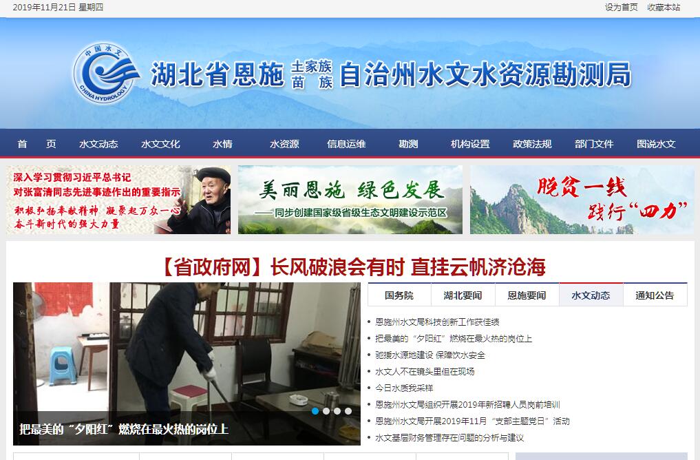 恩施州水文水資源勘測局始建于1933年,原名“恩施地區(qū)水文分站”,隸屬于湖北省水文水資源局,為省垂直管理的全額撥款事業(yè)單位。主要工作職責是負責全州水文站網(wǎng)規(guī)劃與建設(shè),水文監(jiān)測與預(yù)報,水資源調(diào)查與評價,水文監(jiān)測資料匯交、保管與使用,水文設(shè)施與水文監(jiān)測環(huán)境的保護,水文監(jiān)督管理等。在服務(wù)防汛抗旱、水資源管理、水環(huán)境保護、生態(tài)建設(shè)、水工程建設(shè)和國民經(jīng)濟建設(shè)等方面肩負著重要使命。單位內(nèi)設(shè)綜合辦公室、勘測科、水情科(內(nèi)含國家防汛抗旱指揮系統(tǒng)恩施水情分中心)、信息科、水資源科、財務(wù)科 6個職能科室,下設(shè)咸豐縣水文局、恩施市水文局2個縣級局。現(xiàn)有在職職工82人,退休職工53人,合計135人。在職職工中,專業(yè)技術(shù)人員占比81.7%,大專及以上學(xué)歷占比89%。機關(guān)內(nèi)設(shè)6個職能科室,下設(shè)2個縣級水文局、9個國家基本水文站,現(xiàn)擁有各類水文站點543處。承擔向國家防總、省防辦、長江水利委員會、重慶市、湖南省、三峽工程、清江梯級開發(fā)及恩施州防辦、各縣市防辦等單位的報汛任務(wù)。單位加掛湖北省水資源水環(huán)境監(jiān)測中心恩施分中心牌子。該分中心為國家計量認證合格單位,擁有雄厚的技術(shù)力量和豐富的儀器設(shè)備,在地表水、地下水、生活飲用水、污水、大氣降水五大類中,具備向社會提供公正檢測數(shù)據(jù)成果的能力。單位擁有“水文、水資源調(diào)查評價”資質(zhì)和“建設(shè)項目水資源論證”資質(zhì),具備提供水文水資源社會咨詢服務(wù)的資格和能力。開展了大量的水文分析計算、編制防洪調(diào)度方案、提供水文情報預(yù)報服務(wù)、水資源調(diào)查評價、水資源論征、防洪影響評價、水環(huán)境監(jiān)測等服務(wù)工作。多年來,認真履行行業(yè)職責,積極主動為地方經(jīng)濟社會發(fā)展提供水文服務(wù),積極開展黨建及文明創(chuàng)建工作,得到了各級黨委政府和主管部門的充分肯定。