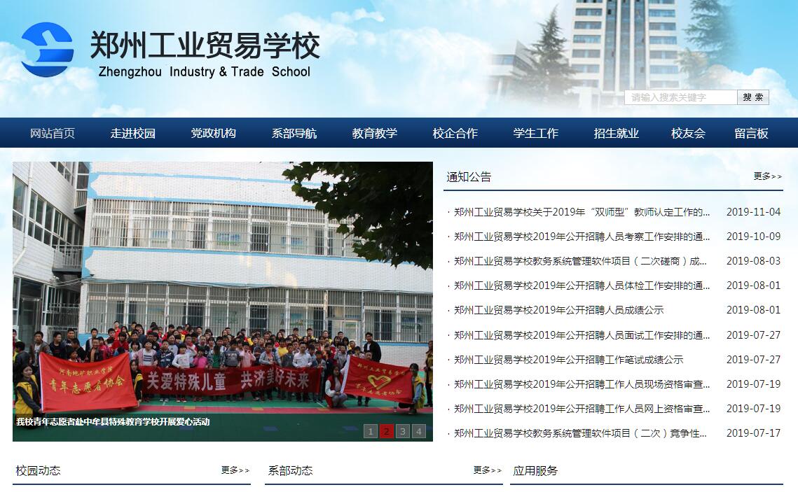 鄭州工業(yè)貿(mào)易學(xué)校,始建于1956年,是原國家地質(zhì)部創(chuàng)辦的鄭州地質(zhì)學(xué)校,1995年改名為鄭州工業(yè)貿(mào)易學(xué)校,2000年劃歸河南省教育廳管理,學(xué)校已有63年的辦學(xué)歷史。學(xué)校是國家級重點(diǎn)中專、全國職業(yè)教育先進(jìn)單位、首批河南省職業(yè)教育品牌示范學(xué)校、河南省文明標(biāo)兵學(xué)校、河南省學(xué)校行風(fēng)建設(shè)先進(jìn)單位、河南省中等職業(yè)學(xué)校管理強(qiáng)校、中等職業(yè)學(xué)校校園文化建設(shè)示范學(xué)校、河南省普通大中專畢業(yè)生就業(yè)工作先進(jìn)集體,河南省數(shù)字化校園建設(shè)項(xiàng)目試點(diǎn)學(xué)校。學(xué)校占地面積85畝,建筑面積5.5萬平方米。其中登封實(shí)習(xí)基地占地10畝,建筑面積1萬平方米。學(xué)校館藏圖書10.8萬冊,教學(xué)科研儀器設(shè)備總值2500萬元;學(xué)校地質(zhì)陳列館擁有各類礦物、巖石、化石標(biāo)本和珍貴大型恐龍化石近萬種;校外登封實(shí)習(xí)基地能同時滿足千名學(xué)生的學(xué)習(xí)、生活和地質(zhì)類專業(yè)野外實(shí)習(xí)實(shí)訓(xùn)要求;校內(nèi)有中央財(cái)政支持的地質(zhì)類實(shí)訓(xùn)基地、國家計(jì)算機(jī)技能型緊缺人才培訓(xùn)基地、中德合作汽車機(jī)電一體化專業(yè)項(xiàng)目實(shí)訓(xùn)室、河南省水工專業(yè)技能名師工作室、河南省會計(jì)專業(yè)技能名師工作室、河南省計(jì)算機(jī)平面技能名師工作室。學(xué)校專任教師165人,雙師型教師121人。其中省級教育教學(xué)專家3人,省級教學(xué)名師3人,省級學(xué)術(shù)及專業(yè)帶頭人41人,高級職務(wù)42人(教授3人),中級職務(wù)80人。學(xué)校各類學(xué)生9481人,全日制在校生6012人,63年來,學(xué)校已為國家輸送43139名合格畢業(yè)生。學(xué)校開設(shè)專業(yè)涵蓋資源勘查類(河南省品牌示范專業(yè))、測繪地理信息類、環(huán)境保護(hù)類、計(jì)算機(jī)電子信息類、珠寶玉石首飾類(河南省特色專業(yè))、建筑施工管理類、汽車維修類、會計(jì)電商物流旅游管理類、藝術(shù)設(shè)計(jì)與學(xué)前教育類等。學(xué)校緊跟科技發(fā)展步伐,在許多專業(yè)中應(yīng)用無人機(jī)和3D打印等最先進(jìn)的科學(xué)技術(shù)。學(xué)校堅(jiān)持多層次辦學(xué)。全日制普通中專教育招收初中和高中畢業(yè)生,初高中畢業(yè)生學(xué)習(xí)2年和1年后,學(xué)校安排到相關(guān)專業(yè)的單位就業(yè)。如愿意繼續(xù)提高學(xué)歷,學(xué)校組織針對性的學(xué)習(xí)提高后,可直接考取或取得本、??茖W(xué)歷,到本科或?qū)?聘咝@^續(xù)學(xué)習(xí)。