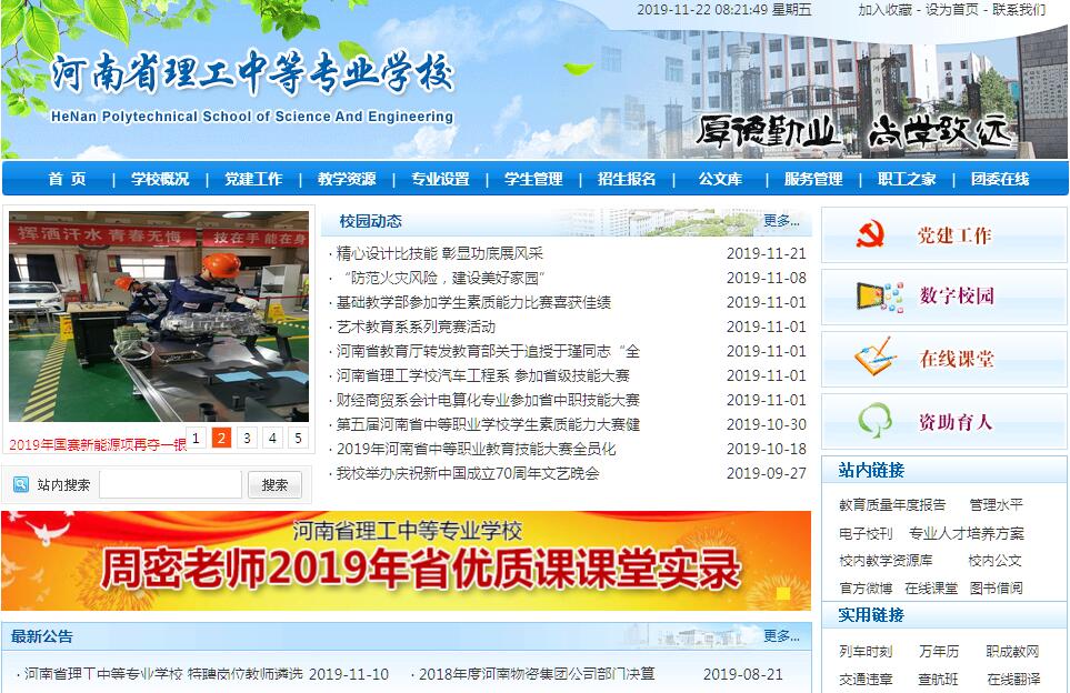 河南省理工學(xué)校(原河南省物資學(xué)校),是一所經(jīng)河南省人民政府批準(zhǔn)并在教育部備案的擁有多類別多專業(yè)的公辦全日制普通中專。學(xué)校創(chuàng)建于1984年,位于鄭州市東風(fēng)渠畔,茂花路6號(hào),交通便利,環(huán)境優(yōu)雅。學(xué)校占地面積110余畝,建筑面積8.2萬平方米?,F(xiàn)有教職工215名,其中高級(jí)職稱52名,中級(jí)職稱81名,在校學(xué)生4800余人。近年來,我校先后被評(píng)為“國家級(jí)重點(diǎn)中?!薄ⅰ笆〖?jí)文明單位”、“全國職業(yè)技術(shù)學(xué)校職業(yè)指導(dǎo)工作先進(jìn)學(xué)校”、“省職業(yè)指導(dǎo)與就業(yè)服務(wù)示范單位”、“河南省職業(yè)教育先進(jìn)集體”、 “省級(jí)文明學(xué)?!?、“河南省教育教學(xué)研究工作先進(jìn)單位”、“河南省最具影響力的十佳職業(yè)學(xué)?!薄ⅰ笆着幽鲜≌\信規(guī)范招生示范院?!?、“河南省職業(yè)教育品牌示范學(xué)?!?。設(shè)施:學(xué)校各類設(shè)施齊全,教學(xué)條件優(yōu)越。建有校園網(wǎng)、多媒體、計(jì)算機(jī)中心等先進(jìn)的現(xiàn)代化教學(xué)系統(tǒng),有汽車維修、現(xiàn)代物流實(shí)訓(xùn)中心,有機(jī)床(車、銑、刨及數(shù)控)加工、焊接、鉗工、服裝制作等實(shí)習(xí)車間。有電工電子、PLC、電機(jī)控制、計(jì)算機(jī)網(wǎng)絡(luò)、電子商務(wù)、會(huì)計(jì)、服裝設(shè)計(jì)、語音室、形體訓(xùn)練房、琴房等30多個(gè)專業(yè)實(shí)驗(yàn)實(shí)訓(xùn)室。擁有運(yùn)動(dòng)場和現(xiàn)代化的大禮堂。圖書館藏書16萬余冊,設(shè)有教師閱覽室、學(xué)生閱覽室和電子閱覽室。管理:為了更好地培養(yǎng)和教育學(xué)生,我校在教學(xué)、學(xué)生管理和學(xué)生生活等方面都有比較嚴(yán)格的規(guī)定,采取了一系列加強(qiáng)管理的措施。建立專職班主任和教師兼職班主任相結(jié)合的方式。學(xué)校對學(xué)生實(shí)行半封閉式管理,嚴(yán)禁學(xué)生外出(周末除外)、外宿,并配套有嚴(yán)格的全天考勤制度。學(xué)校不許學(xué)生抽煙、渴酒、鋪張浪費(fèi);要求學(xué)生舉止文明,講究衛(wèi)生。所有這些都為學(xué)生創(chuàng)造了良好的學(xué)習(xí)和生活環(huán)境。教學(xué):學(xué)校擁有一支省級(jí)教育專家、省級(jí)和校級(jí)學(xué)科帶頭人和骨干教師組成的具有豐富教學(xué)經(jīng)驗(yàn)、實(shí)踐經(jīng)驗(yàn)和較高學(xué)術(shù)造詣的教師隊(duì)伍。始終以就業(yè)為導(dǎo)向,注重學(xué)生實(shí)際動(dòng)手能力和技能培養(yǎng),使學(xué)生熟練掌握一門技能。我校是國家教育部、交通部等部委認(rèn)定的承擔(dān)汽車運(yùn)用與維修專業(yè)技能型緊缺人才培養(yǎng)的院校之一,是全省中等職業(yè)學(xué)校物流及電子商務(wù)類專業(yè)教研中心,汽車運(yùn)用與維修、計(jì)算機(jī)應(yīng)用專業(yè)為省重點(diǎn)專業(yè);現(xiàn)代物流管理、計(jì)算機(jī)財(cái)務(wù)會(huì)計(jì)等專業(yè)為我校傳統(tǒng)優(yōu)勢專業(yè)。學(xué)校特別要求學(xué)生在校期間必須取得汽車維修、計(jì)算機(jī)操作、電子商務(wù)、會(huì)計(jì)電算化、維修電工等相應(yīng)專業(yè)的職業(yè)技能資格證書。在河南省教育廳舉辦的歷屆全省職業(yè)學(xué)校學(xué)生技能大賽上,我校參賽者均取得優(yōu)異成績。就業(yè):我校為國家計(jì)劃內(nèi)招生,學(xué)生畢業(yè)后由省教育廳頒發(fā)國家承認(rèn)的學(xué)歷證書和就業(yè)報(bào)到證。學(xué)校一直高度重視畢業(yè)生就業(yè)工作,具有完善高效的就業(yè)指導(dǎo)與就業(yè)服務(wù)體系。1999年,河南省人事廳批準(zhǔn)在我校成立了我省唯一的“河南中等專業(yè)人才市場”。多年來,在為我校畢業(yè)生提供優(yōu)質(zhì)的就業(yè)服務(wù)的同時(shí),現(xiàn)已成為河南省具有廣泛影響力的中等專業(yè)人才輸出基地。同時(shí)我校與省人民政府駐上海、廣州等辦事處聯(lián)合,與上海英業(yè)達(dá)、達(dá)豐電子、日立電器、河南安飛、環(huán)宇集團(tuán)等省內(nèi)外知名企業(yè)聯(lián)系設(shè)立長期合作就業(yè)基地。學(xué)生入學(xué)后均可與學(xué)校簽訂就業(yè)協(xié)議保證充分就業(yè)。多年來,學(xué)校畢業(yè)生就業(yè)率均達(dá)98.7%以上。
