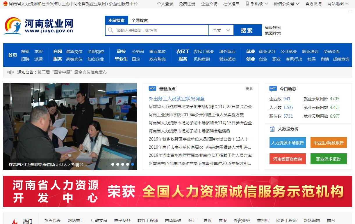 河南就業(yè)網(wǎng)是河南省人力資源和社會(huì)保障廳主辦的的唯一省級(jí)官方網(wǎng)站。是省內(nèi)第一家上實(shí)現(xiàn)就業(yè)云服務(wù)的政府網(wǎng)站,是承擔(dān)國(guó)有企業(yè)、事業(yè)單位、公務(wù)員招聘招聘唯一指定公開(kāi)發(fā)布的平臺(tái),是河南省人力資源服務(wù)進(jìn)行互聯(lián)網(wǎng)+轉(zhuǎn)型的重要標(biāo)志。