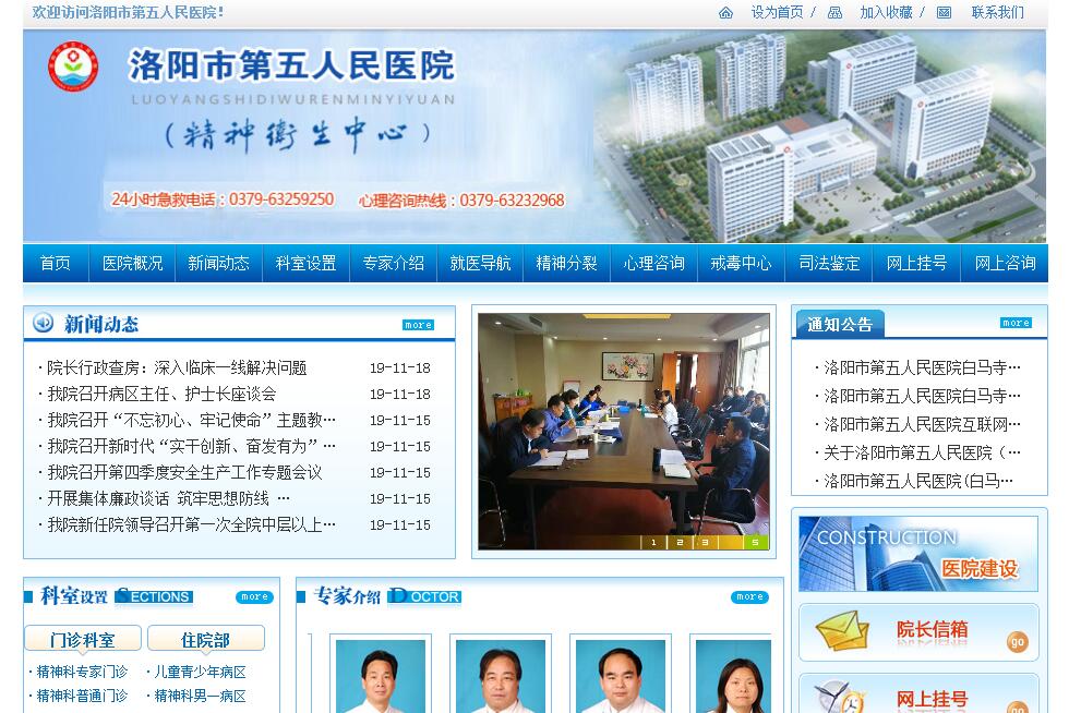洛陽市第五人民醫(yī)院(洛陽市精神衛(wèi)生中心、河南科技大學(xué)第五附屬醫(yī)院)是一所集醫(yī)療、康復(fù)、教學(xué)、科研、預(yù)防為一體的國家三級(jí)精神病??漆t(yī)院;是省精神疾病診療網(wǎng)絡(luò)分中心,市精神病康復(fù)技術(shù)指導(dǎo)中心,市心理咨詢中心,市精(智)殘鑒定指定醫(yī)院,市涉案精神病人委托管理機(jī)構(gòu)、市心理危機(jī)干預(yù)中心;是華中科技大學(xué)同濟(jì)醫(yī)學(xué)院教學(xué)醫(yī)院,新鄉(xiāng)醫(yī)學(xué)院教學(xué)醫(yī)院,中美精神科住院醫(yī)師規(guī)范化培訓(xùn)基地;是市級(jí)醫(yī)保定點(diǎn)醫(yī)院、新農(nóng)合定點(diǎn)醫(yī)院、城鄉(xiāng)困難群眾補(bǔ)充醫(yī)療救助定點(diǎn)醫(yī)院、鄭鐵職工定點(diǎn)醫(yī)院、醫(yī)院由太康路院區(qū)和白馬寺院區(qū)組成。太康路院區(qū)為原洛陽市第五人民醫(yī)院,成立于1958年,地處洛龍區(qū)太康東路,占地103畝;白馬寺院區(qū)為原洛陽市精神衛(wèi)生中心,成立于1972年,地處洛陽白馬寺西500米,占地73畝。醫(yī)院設(shè)有精神科、心理科、老年科、睡眠障礙科、物質(zhì)依賴病區(qū)、兒童青少年精神病區(qū)、抑郁癥病區(qū),以及內(nèi)科、外科、婦產(chǎn)科、兒科等。擁有編制床位2000張。擁有1.5T核磁共振、16排螺旋CT、四維彩超、全自動(dòng)生化分析儀、心理CT、MECT、DEM-2000眼動(dòng)檢測(cè)系統(tǒng)、多參數(shù)生物反饋儀、重復(fù)經(jīng)顱磁刺激治療儀等先進(jìn)醫(yī)療設(shè)備。醫(yī)院圍繞打造“全國知名,省內(nèi)一流”精神??浦放频脑妇?,積極推動(dòng)“大專科、精綜合”建設(shè),以精神科、心理科為拳頭,積極探索對(duì)同時(shí)患有軀體疾病和精神疾病患者進(jìn)行身心雙重調(diào)節(jié)與治療的新手段,著力發(fā)展重癥精神疾病管理、睡眠障礙、成癮、兒童青少年心理、老年精神疾病防治、精神病學(xué)前沿學(xué)科和精神司法鑒定等,促進(jìn)醫(yī)療服務(wù)從以治病為中心轉(zhuǎn)到為以人民健康為中心,進(jìn)一步落實(shí)大衛(wèi)生、大健康理念和預(yù)防為主方針,為廣大人民群眾提供全生命周期的醫(yī)療衛(wèi)生服務(wù),在打造中原城市群副中心城市、譜寫濃墨重彩的洛陽新篇章中努力開創(chuàng)精神衛(wèi)生工作新局面。醫(yī)院先后榮獲“全國衛(wèi)生系統(tǒng)思想政治工作先進(jìn)集體”,“省級(jí)文明單位”、“省廉醫(yī)、誠信、為民醫(yī)院”,“省行風(fēng)建設(shè)先進(jìn)醫(yī)院”,“省醫(yī)療質(zhì)量萬里行活動(dòng)先進(jìn)單位”,“2015-2016年河南省滿意醫(yī)院”等榮譽(yù)稱號(hào)。