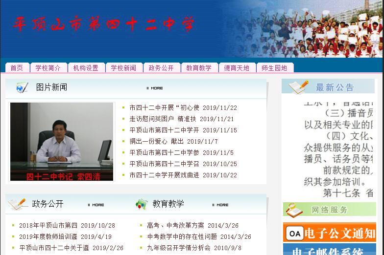 平頂山市第四十二中學是市教育局直屬的全日制全封閉公辦寄宿制學校,始建于1974年,人文底蘊深厚,是國家級綠色學校、省級文明學校、市首批示范性學校、市級文明單位、市級安全文明校園、市初中教學質量先進學校。學校位于平頂山市體育路北段,占地45畝,校園布局合理,綠樹蔥蘢,鮮花馥郁,四季常青,是一座環(huán)境幽雅的花園式學校,是莘莘學子求學成長的理想場所。學?,F有22個教學班,在校生1200多人,教職工116人,師資力量雄厚,有高級教師48人,一級教師41人,省部級優(yōu)秀教師4人,國家級骨干教師2人,省市級骨干教師12人,省市級優(yōu)質課教師35人。教學設施先進,每個班都配備了最先進的多媒體教學設備和有線電視?,F代化的理、化、生實驗室和微機室配置規(guī)范;全市最先進的學生公寓寬敞舒適;舞蹈教室、美術教室、音樂教室設施先進;現代化的運動場地整飾一新;圖書室、閱覽室藏書4萬余冊。平頂山市四十二中全面貫徹黨的教育方針,積極實施素質教育。以“追求卓越,腳踏實地”為學校精神,以“良知、責任、榮譽、夢想”為校訓,以“以人主動全面發(fā)展為本,面向世界面向未來育人”為辦學理念,以“狠抓良好習慣養(yǎng)成,讓每個學生都成人;積極實施愛的教育,讓每個學生都成才”為育人理念,以“民主科學,嚴格高效”為管理理念,著力打造“主動高效,樂學善學”的學風、“敬業(yè)愛生,樂學善教”的教風和“文明守紀,團結進取”的校風,對學生進行四會五有(學會做人、學會求知、學會處事、學會生活;有健全的人格、有健康的身心、有淵博的知識、有自己的特長、有較強的能力)教育,使每個學生都能得到全面發(fā)展,學有所長。學校堅持“一個圍繞、兩個堅持、三個發(fā)展和四個目標”的辦學思路。緊緊圍繞“做學生喜歡的老師,辦社會滿意的學?!边@一中心;堅持遵循教育教學規(guī)律,堅持遵循學生的身心發(fā)展規(guī)律和認知規(guī)律;注重教師的發(fā)展,注重學生的發(fā)展,注重學校的發(fā)展;力求學校成名,教師成家,學生成才,讓學校成為師生快樂健康成長的家園。進一步深化教學改革,不斷探索先進的教學模式,全力實施“五四三”教學管理模式和“四環(huán)節(jié)”課堂教學模式,努力打造限時高效素質課堂,教育教學質量不斷提高。積極開辟第二課堂,開展豐富多彩的校園文化活動。加強班級文化建設,開展班班有歌聲活動和傳統(tǒng)文化進校園、進班級活動;開辟第二課堂,成立了寫作班、英語口語班、奧數班、主持班、美術班、電腦班、合唱隊、聲樂隊、籃球隊、長跑隊、乒乓球隊等社團和興趣班,促使學生全面發(fā)展,學有所長。憶往昔,蓽路藍縷,風雨滄桑話輝煌;看今朝,桃李不言,與時俱進譜新章;展未來,揮首激昂,開拓進取創(chuàng)偉業(yè)。如今,四十二中人在以杜均珩為首的校領導班子的帶領下正高瞻遠矚,展開騰飛的雙翼,乘風破浪,譜寫著更加恢宏壯麗的新篇章。