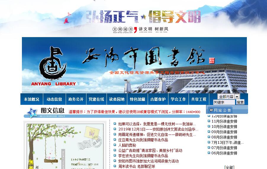 安陽市圖書館始建于1956年5月,幾經(jīng)遷移,于2008年12月25日正式對外開放。新館建筑面積16000平方米,各類型藏書40多萬冊(件),擁有高、中、初級(jí)在職職工43人,內(nèi)設(shè)采編部、圖書部、報(bào)刊部、網(wǎng)絡(luò)技術(shù)部、電子文獻(xiàn)部、歷史文獻(xiàn)部、信息部、研究輔導(dǎo)部、辦公室、財(cái)務(wù)部10個(gè)部門。新館設(shè)有現(xiàn)代化的報(bào)告廳、多功能廳、展覽廳、社會(huì)教育中心、多媒體閱覽室、視聽室、各類型書庫、閱覽室和讀者自修室,可向讀者提供館藏圖書、報(bào)刊文獻(xiàn)借閱、信息咨詢、定題服務(wù)、社會(huì)教育培訓(xùn)、圖書館學(xué)教育與業(yè)務(wù)輔導(dǎo)、展覽、網(wǎng)絡(luò)文獻(xiàn)信息、視聽資料查詢、古籍和地方文獻(xiàn)檢索、文化休閑娛樂等服務(wù)。新館內(nèi)外環(huán)境潔凈優(yōu)美,圖書館建筑設(shè)計(jì)既突出了古都安陽殷商文化的特點(diǎn)又滲透了現(xiàn)代安陽文明的特征,是全國優(yōu)秀文化精品建筑和安陽的文化標(biāo)志性建筑。館內(nèi)智能化、網(wǎng)絡(luò)化的先進(jìn)設(shè)施和豐富的數(shù)字資源,為實(shí)現(xiàn)圖書館數(shù)字化、網(wǎng)絡(luò)化服務(wù)提供了良好的條件。新館將以實(shí)現(xiàn)卓越的知識(shí)服務(wù)為工作目標(biāo),牢固樹立“以人為本”的服務(wù)理念,認(rèn)真落實(shí)科學(xué)發(fā)展觀,不斷開拓創(chuàng)新,以實(shí)現(xiàn)我市圖書館事業(yè)的新跨越、新發(fā)展。我們將通過不懈的努力,力爭把新館建成我市的文獻(xiàn)信息收藏、傳遞中心,社會(huì)教育中心,文化休閑娛樂中心,圖書館服務(wù)網(wǎng)絡(luò)中心。使之為古都安陽的歷史文化傳承和現(xiàn)代文明發(fā)展做出應(yīng)有的貢獻(xiàn)。