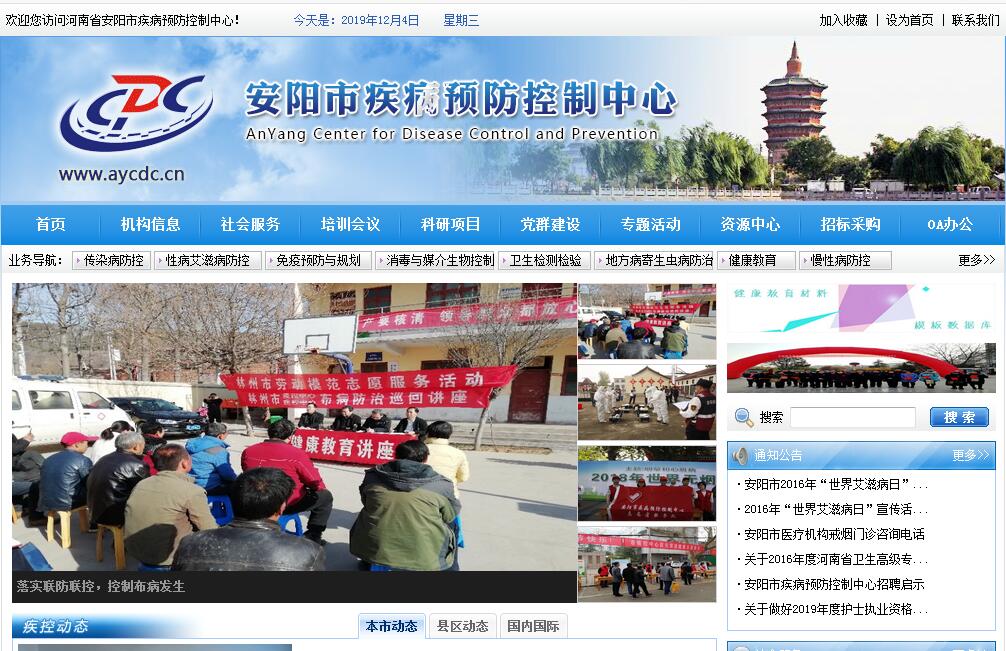 安陽(yáng)市疾病預(yù)防控制中心是根據(jù)安陽(yáng)市編委2005年4月29日批復(fù)在原安陽(yáng)市衛(wèi)生防疫站、安陽(yáng)市健康教育所和安陽(yáng)市職業(yè)防治所的基礎(chǔ)上組建成立,于2006年12月28日組建完畢。中心位于安陽(yáng)市自由路1號(hào),為正處級(jí)規(guī)格,經(jīng)費(fèi)實(shí)行全額預(yù)算管理,編制194人,占地面積5400㎡,建筑面積10400㎡,實(shí)驗(yàn)室面積3200㎡。安陽(yáng)市預(yù)防醫(yī)學(xué)會(huì)靠掛在我中心,是鄭州大學(xué)、新鄉(xiāng)醫(yī)學(xué)院、河南中醫(yī)學(xué)院的教學(xué)實(shí)習(xí)基地。中心的主要職能包括:(1)對(duì)影響人群生存環(huán)境衛(wèi)生質(zhì)量及生命質(zhì)量的危險(xiǎn)因素進(jìn)行衛(wèi)生學(xué)監(jiān)測(cè);對(duì)傳染病、地方病、寄生蟲病、慢性非傳染性疾病、公害病、學(xué)生常見病及意外傷害、中毒等發(fā)生、分布和發(fā)展的規(guī)律進(jìn)行流行病學(xué)監(jiān)測(cè),并制定預(yù)防控制對(duì)策;(2)制定并實(shí)施疾病預(yù)防控制工作方案并對(duì)實(shí)施情況進(jìn)行質(zhì)量和效果評(píng)估;(3)對(duì)傳染病的發(fā)生流行和中毒、污染事件進(jìn)行調(diào)查處理,為救災(zāi)防病和解決重大公共衛(wèi)生問題提供技術(shù)支持;(4)實(shí)施預(yù)防接種,負(fù)責(zé)預(yù)防用生物制品的使用與管理;(5)組織指導(dǎo)、考核下級(jí)疾病預(yù)防控制機(jī)構(gòu)的工作,指導(dǎo)技術(shù)規(guī)范和技術(shù)措施的實(shí)施;培訓(xùn)中、初級(jí)專業(yè)技術(shù)和管理人員;承擔(dān)愛國(guó)衛(wèi)生運(yùn)動(dòng)中與疾病預(yù)防控制與公共衛(wèi)生相關(guān)的技術(shù)指導(dǎo);(6)承擔(dān)疾病預(yù)防控制及有關(guān)公共衛(wèi)生信息的報(bào)告、管理和預(yù)測(cè)、預(yù)報(bào),為疾病控制決策提供科學(xué)依據(jù);(7)開展衛(wèi)生防病檢驗(yàn)和實(shí)驗(yàn)室質(zhì)量控制;受衛(wèi)生計(jì)生行政部門認(rèn)定,承擔(dān)衛(wèi)生監(jiān)督監(jiān)測(cè)檢驗(yàn)、預(yù)防性健康檢查、健康相關(guān)技術(shù)審核和衛(wèi)生質(zhì)量檢驗(yàn)、鑒定;(8)進(jìn)行應(yīng)用性科學(xué)研究,開發(fā)和推廣先進(jìn)技術(shù);開展對(duì)外交流與合作,引進(jìn)和推廣新技術(shù)、新方法;(9)向社會(huì)提供相關(guān)的預(yù)防保健信息、健康咨詢和預(yù)防醫(yī)學(xué)診療等專業(yè)技術(shù)服務(wù);(10)協(xié)助和配合上級(jí)開展相關(guān)工作,完成衛(wèi)生計(jì)生行政部門交付的其它任務(wù)。截止2016年底,中心現(xiàn)有在職職工182人,其中專業(yè)技術(shù)人員118人(正高15人,副高28人,中級(jí)50人),占職工總數(shù)的65%;博士1人,碩士15人,本科115人,占職工總數(shù)72%;黨員126名;離退休干部職工91人。中心內(nèi)設(shè)科室22個(gè),其中職能科室6個(gè),業(yè)務(wù)科室15個(gè)和1個(gè)科技開發(fā)辦公室。主要業(yè)務(wù)科室有健康教育宣傳科(掛安陽(yáng)市健康教育所牌子)、傳染病防治科、地方病防治科、艾滋病性病防治所、消毒與媒介生物控制科、免疫規(guī)劃科、公共衛(wèi)生科、學(xué)校與少兒衛(wèi)生科、慢性病防治科、理化檢驗(yàn)科、微生物檢驗(yàn)科、職業(yè)病防治科(掛安陽(yáng)市職業(yè)病防治所牌子)、駕駛員體檢中心、社區(qū)衛(wèi)生服務(wù)中心和門診部等。目前,中心擁有各類儀器設(shè)備1500余臺(tái)(件),包括氣相色譜-質(zhì)譜-質(zhì)譜聯(lián)用儀、氣相色譜儀、高效液相色譜儀、離子色譜儀、原子吸收分光光度計(jì)及原子熒光光度計(jì)、微波萃取儀、微波消解系統(tǒng)、全自動(dòng)固相萃取儀、BD全自動(dòng)微生物鑒定系統(tǒng)、美國(guó)伯樂實(shí)時(shí)熒光PCR儀、德國(guó)凱杰毛細(xì)管凝膠電泳儀、BD流式細(xì)胞儀、東芝全自動(dòng)生化分析儀、希斯美康全自動(dòng)血細(xì)胞分析儀等多臺(tái)大型現(xiàn)代化檢測(cè)設(shè)備,總價(jià)值3000余萬元,達(dá)到省內(nèi)領(lǐng)先水平。擁有省發(fā)改委和水利廳認(rèn)定的安陽(yáng)市市區(qū)農(nóng)村飲用水安全水質(zhì)檢測(cè)中心,以及食品微生物檢測(cè)實(shí)驗(yàn)室、水質(zhì)微生物檢測(cè)實(shí)驗(yàn)室、消毒效果檢測(cè)實(shí)驗(yàn)室、艾滋病確證實(shí)驗(yàn)室、PCR實(shí)驗(yàn)室、臨床檢驗(yàn)實(shí)驗(yàn)室、健康相關(guān)產(chǎn)品和消毒產(chǎn)品檢測(cè)實(shí)驗(yàn)室、全國(guó)尿碘及鹽碘質(zhì)控網(wǎng)絡(luò)合格實(shí)驗(yàn)室等多個(gè)專業(yè)實(shí)驗(yàn)室。目前承擔(dān)有國(guó)家食品安全風(fēng)險(xiǎn)監(jiān)測(cè)項(xiàng)目、河南省腸道病哨點(diǎn)監(jiān)測(cè)項(xiàng)目等多項(xiàng)國(guó)家及省級(jí)專項(xiàng)監(jiān)測(cè)項(xiàng)目,可承檢食品及其相關(guān)產(chǎn)品、生活飲用水、化妝品、公共場(chǎng)所及公共用品、消毒產(chǎn)品、學(xué)校衛(wèi)生、托幼機(jī)構(gòu)衛(wèi)生、職業(yè)危害因素等健康相關(guān)產(chǎn)品的檢測(cè)檢驗(yàn)。中心先后承擔(dān)完成多項(xiàng)市級(jí)科研項(xiàng)目,參與完成1項(xiàng)國(guó)家級(jí)科研項(xiàng)目,擁有發(fā)明專利2項(xiàng)。承擔(dān)的國(guó)家863科研項(xiàng)