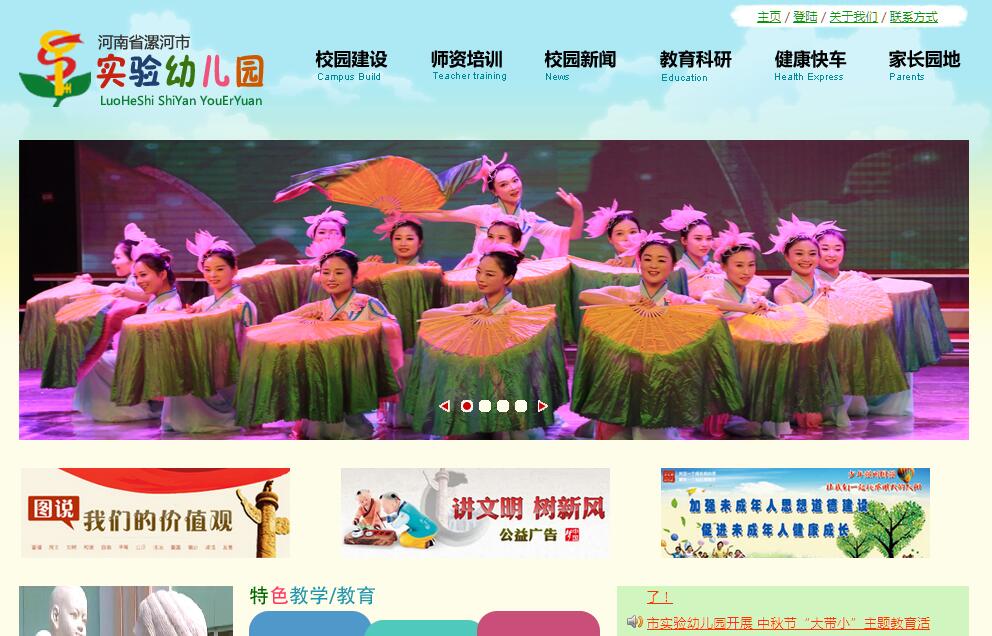 漯河市實驗幼兒園位于漯河市沙北行政區(qū),隸屬于漯河市教育局,是一所環(huán)境優(yōu)美、設施齊全的省級示范性幼兒園。漯河市實驗幼兒園創(chuàng)辦于1987年,1988年5月開始招生,現(xiàn)有23個教學班,將近800多名幼兒,教職工109名,其中專業(yè)專職教師75人,大專以上學歷90%,中學高級教師6人,小學高級教師19人,省級名師6人,省級骨干教師8人,省級文明教師1人,市級骨干教師12人。優(yōu)質(zhì)課評比獲省級以上獎勵18人次,市級以上獎勵30人次;輔導幼兒舞蹈繪畫獲獎達400多人次;教育教學論文在省級以上刊物發(fā)表50多篇,獲市級以上獎勵100多篇。幼兒園另配有保健醫(yī)3名、專業(yè)廚師、電教員、水電工等專職工作人員,以上人員均持有相關部門頒發(fā)的專業(yè)等級證書。高學歷、高能力、高素質(zhì)的教師隊伍成為孩子們探索、發(fā)現(xiàn)、學習的支持者、合作者和引導者。漯河市實驗幼兒園致力于辦園條件的改善,各類設施齊全。班級環(huán)境優(yōu)美溫馨、富于童趣;設有音樂活動室、美術活動室、繪本閱讀室、多功能廳、圖書資料室、會議室等;擁有先進的多媒體教學系統(tǒng)、校園安全監(jiān)控系統(tǒng)。園內(nèi)景色怡人、鳥語花香,是孩子們喜愛的美園、樂園、學園。多年來,實幼人憑著對幼兒教育事業(yè)的摯愛和開拓創(chuàng)新精神,以嚴格規(guī)范的制度化管理使秩序井然、實干為先;以關愛尊重的人文化管理使快樂工作,快樂生活;以質(zhì)比天大的標準精細化管理使謀定而動、有效執(zhí)行;以富于內(nèi)涵的校園文化建設,營造"和諧共進,愛意濃濃"的青春校園,漯河市實驗幼兒園在打造著一支蓬勃朝氣、有著凝聚力和向心力的和諧團隊。漯河市實驗幼兒園多次承擔過國家級、省級科研課題,取得了豐碩的成果。目前借鑒多元智能理論和蒙特梭利教育思想,不斷進行課程改革。在教育理念上,我們的追求是:開發(fā)每個孩子的天賦潛能;開發(fā)每個教師的專業(yè)潛能;開發(fā)每個家長的教育潛能。培養(yǎng)孩子的目標定位在:培養(yǎng)健康睿智、合作獨立、自信快樂的兒童。漯河市實驗幼兒園以其獨特的思考、多元化的教育探索、不斷更新的教育理念,一直走在河南幼教行列的最前端,是一所教科研并重、省內(nèi)外交流廣泛、幼教改革領先的現(xiàn)代化幼兒園,在上級關懷和市教育局的正確領導下,漯河市實驗幼兒園先后榮獲全國“三八”紅旗集體、全國優(yōu)秀家長學校、全國優(yōu)秀教育科研實驗基地、省級示范性幼兒園、省級幼教工作先進集體、省級文明單位、省級文明學校等多項殊榮。