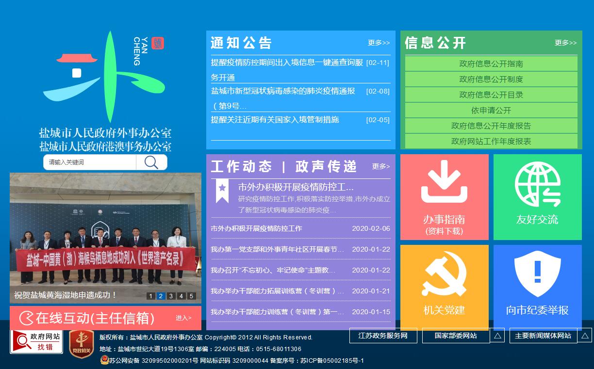 鹽城市市政府外事辦公室,為市政府工作部門,掛市政府港澳事務辦公室牌子。其主要職責是:(一)貫徹執(zhí)行我國的對外方針政策和法律法規(guī)。落實市委、市政府有關外事工作的指示和決定。歸口管理、統(tǒng)籌協(xié)調全市外事工作。起草外事工作的規(guī)范性文件、草案,擬訂相關政策規(guī)劃。(二)圍繞全市經(jīng)濟建設、社會發(fā)展和對外開放,為市委、市政府提供外事工作決策的建議。(三)貫徹執(zhí)行中央對香港、澳門的政策規(guī)定,統(tǒng)籌協(xié)調和歸口管理與香港、澳門特別行政區(qū)往來工作。(四)統(tǒng)籌安排并承辦市委、市人大、市政府和市政協(xié)領導人的出訪和國內外事活動事項。(五)接待來我市訪問的重要外賓,承辦外國有關人員來訪事宜。指導全市重要外事活動的禮賓工作。會同有關部門做好涉外參觀單位的建設工作。(六)承擔我市與外國有關領事機構的業(yè)務聯(lián)系和交涉工作。協(xié)調境內外非政府組織的有關事宜。(七)負責全市因公出國(境)工作的歸口管理、協(xié)調服務和監(jiān)督工作。在授權范圍內,審核或審批相關人員因公出國(境)事項,承辦我市因公出國(境)人員的護照、簽證、通行證申辦業(yè)務。會同有關部門落實外事紀律及保密制度。(八)承辦我市與各國交往事務,歸口管理與外國友好城市和其他單位的結好和交往事宜。指導民間對外交往工作。承擔市人民對外友好協(xié)會聯(lián)系工作。負責授予外國人榮譽稱號的審核、報批工作。(九)指導有關部門管理來我市外國人工作,依法保障來我市外國人的合法權益。會同有關部門協(xié)調處理重要涉外事件和案件。指導、協(xié)調境外我市公民和機構的安全與合法權益保護工作,指導全市對外應急事務處理工作。歸口管理外事服務工作。(十)承擔對我市外事干部和涉外人員的教育培訓工作。會同有關部門進行對外宣傳和群眾性外事教育。(十一)主管來我市采訪的外國記者和相關事務。(十二)承辦與境外有關國家和地區(qū)開展合作與交流工作。(十三)貫徹執(zhí)行僑務工作的法律、法規(guī)、規(guī)章和方針、政策,擬訂相關政策和規(guī)劃并組織實施。(十四)統(tǒng)籌協(xié)調有關部門和社會團體開展涉僑工作,指導縣(市、區(qū))僑務工作。(十五)組織開展僑務政策、理論、僑情和僑務工作重大問題的調查研究,向市委、市政府及有關部門提供僑務信息。(十六)指導全市歸僑僑眷工作,依法組織協(xié)調歸僑僑眷和華僑華人在國內的合法權益維護工作,配合有關部門研究處置涉僑突發(fā)事件,參與重大涉僑捐贈監(jiān)督工作,協(xié)助有關部門做好歸僑僑眷代表人士的人事安排工作。(十七)負責指導、開展對華僑華人及其社團的聯(lián)誼和服務工作,開展香港、澳門特別行政區(qū)僑界的聯(lián)誼活動,會同有關部門開展僑務對臺工作,承辦有關審批事項。(十八)指導、推動涉僑經(jīng)濟、科技合作與交流,協(xié)調涉僑經(jīng)濟投訴工作。(十九)指導、推動涉僑宣傳、文化交流和華文教育工作。(二十)承辦市委、市政府交辦的其他事項。