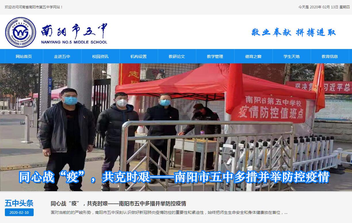 南陽市第五中學(xué)校,位于風(fēng)景秀麗的白河南岸,淯水之濱。學(xué)校前身為南陽縣第一高級中學(xué),創(chuàng)建于1980年,1994年11月南陽撤地改市后,更名為南陽市第五中學(xué)校,是市教育局直屬的省級示范性普通高中。學(xué)校在河南省率先通過了IS09001:200國際質(zhì)量體系認(rèn)證,是豫西南唯一的一所經(jīng)省教育廳批準(zhǔn)具有招收“宏志班”資格的學(xué)校。學(xué)校占地120畝,建筑面積5.69萬平方米,有綜合樓、報(bào)告廳和學(xué)生餐廳、學(xué)生公寓、博學(xué)樓、篤行樓等建筑群;有藏書十萬余冊的圖書館;有塑膠田徑場、燈光塑膠籃排球場和高標(biāo)準(zhǔn)的人工草坪足球場;有現(xiàn)代化的錄播教室、心理咨詢室和多媒體教室。校園環(huán)境優(yōu)美,文化氛圍濃厚。學(xué)?,F(xiàn)有學(xué)生9000余人,116個教學(xué)班。在崗教職工500余名,具有高級教師資格141名,研究生學(xué)歷160名,國家級骨干教師9名,省級學(xué)術(shù)技術(shù)帶頭人32名,市級以上學(xué)科帶頭人、骨干教師138名。自辦學(xué)以來,共為全國各類高校輸送三萬余名優(yōu)秀學(xué)生,每年都有一大批優(yōu)秀學(xué)子考入清華、北大等國家重點(diǎn)院校。尤其從2014年以來,四年四大步,年均增長超百人,尤其2017年一本上線1040人,二本上線2476人,升學(xué)人數(shù)又創(chuàng)新高。連續(xù)多年受到市政府記功嘉獎,并被評為教育教學(xué)先進(jìn)單位。近年來學(xué)校還獲得了“河南省文明單位”、“河南省普通高中課程改革先進(jìn)單位”、“河南省中小學(xué)師德師風(fēng)先進(jìn)單位”、“河南省教育信息化應(yīng)用示范?!薄ⅰ笆着鷩壹壗逃畔⒒圏c(diǎn)學(xué)?!薄ⅰ叭珖嗌倌晷@足球特色學(xué)?!钡纫幌盗袠s譽(yù)稱號。
