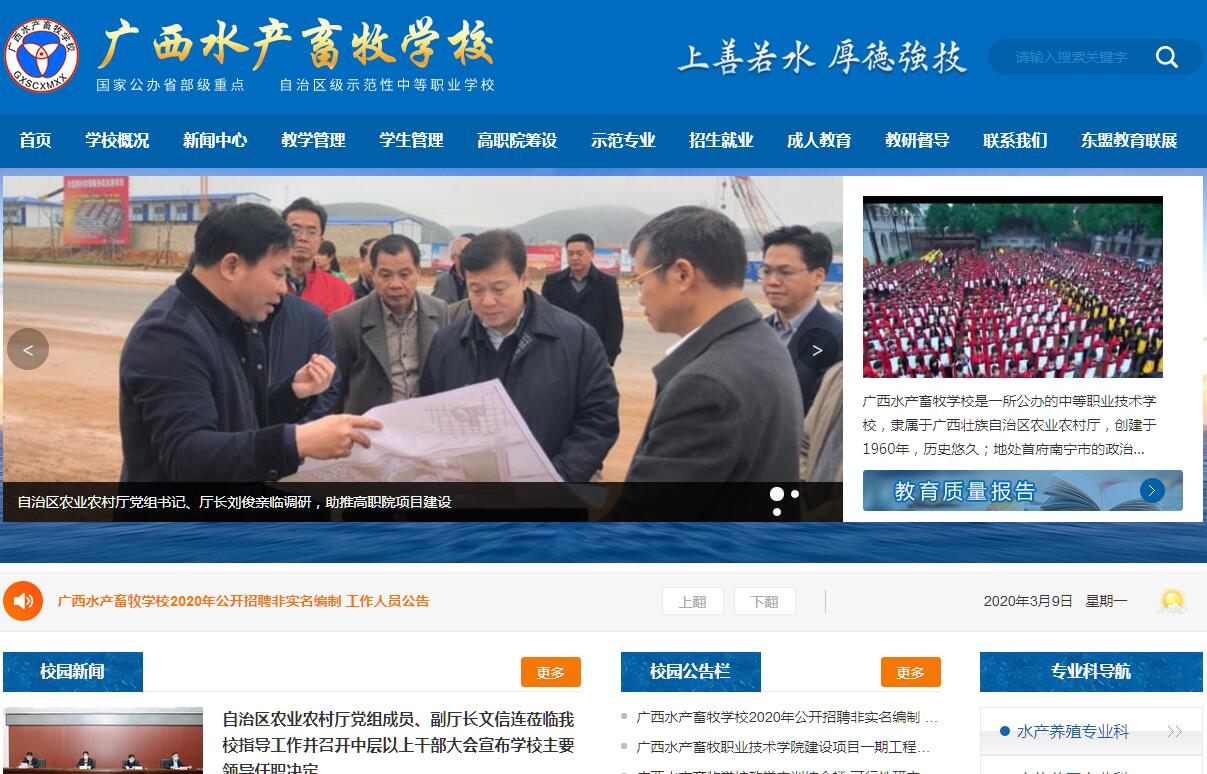 廣西水產(chǎn)畜牧學(xué)校是一所公辦的中等職業(yè)技術(shù)學(xué)校,隸屬于廣西壯族自治區(qū)農(nóng)業(yè)農(nóng)村廳,創(chuàng)建于1960年,歷史悠久;地處首府南寧市的政治、文化、商貿(mào)核心區(qū)——埌東,在青秀山腳下、南湖民歌湖之濱、毗鄰南寧國際會展中心,交通便利;占地面積1243畝,校園環(huán)境優(yōu)美;師資力量雄厚,有教師160多人,三分之一是高級職稱或研究生學(xué)歷,有全國名師七人;學(xué)校以中等職業(yè)教育為主,兼高職與成人教育;開設(shè)有水產(chǎn)畜牧、機(jī)電維修、工商財經(jīng)等三大類別學(xué)科18個專業(yè);現(xiàn)有在校生5000多人(其中全日制學(xué)生3000多人)。教學(xué)設(shè)施完善,有藏書10萬多冊,擁有100多間專業(yè)實驗室,水產(chǎn)、畜牧、汽修專業(yè)校內(nèi)綜合實訓(xùn)基地是自治區(qū)示范基地,與60多個企業(yè)合作建立校外實訓(xùn)就業(yè)基地。學(xué)校堅持以育人為本、以就業(yè)為導(dǎo)向的辦學(xué)理念,秉承“上善若水 厚德強(qiáng)技”的校訓(xùn),建設(shè)“團(tuán)結(jié) 務(wù)實 勤奮 進(jìn)取”的校風(fēng)、“愛生博學(xué) 求實 奉獻(xiàn)”的教風(fēng)和“文明 善學(xué) 精技 創(chuàng)新”的學(xué)風(fēng),勵精圖治、勇于創(chuàng)新,以水產(chǎn)畜牧為特色,以培養(yǎng)生產(chǎn)一線的技能型人才為目標(biāo),以教學(xué)做一體化、校企合作、頂崗實習(xí)為基本的教學(xué)方法,教育教學(xué)質(zhì)量居全區(qū)先進(jìn)水平,是省部級重點中專、自治區(qū)級示范性中等職業(yè)學(xué)校、自治區(qū)級文明單位、自治區(qū)衛(wèi)生優(yōu)秀學(xué)校、南寧市花園式單位,水產(chǎn)養(yǎng)殖、畜牧獸醫(yī)專業(yè)為自治區(qū)級示范性專業(yè)。目前正向高等職業(yè)技術(shù)學(xué)院邁進(jìn)!