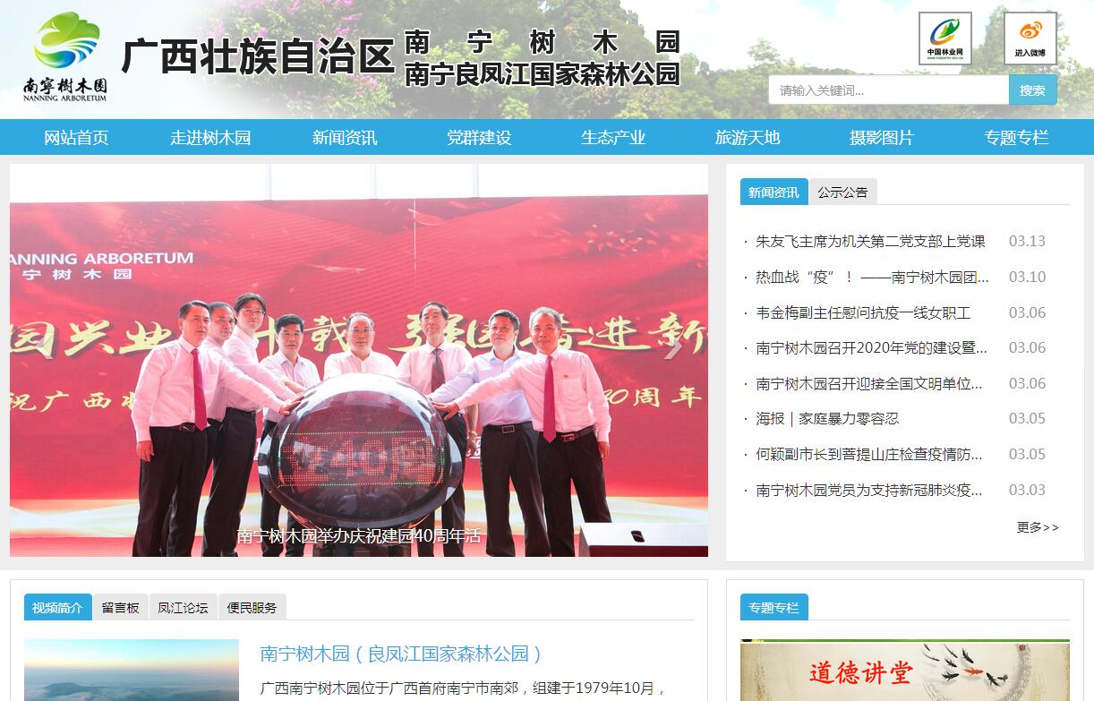 南寧樹木園位于享有“中國綠城”美譽的廣西壯族自治區(qū)首府南寧市,掛南寧良鳳江國家森林公園牌子,實行“一套人馬、兩塊牌子”管理體制,是隸屬于廣西壯族自治區(qū)林業(yè)廳直屬管理的正處級事業(yè)單位、自治區(qū)直屬大一型國有林場。南寧樹木園組建于1979年10月,由良鳳江植物園、南寧示范林場、七坡林場連山分場合并組建。1992年9月9日,原國家林業(yè)部批準成立南寧良鳳江國家森林公園;1998年5月26日,自治區(qū)機構編制委員會批準南寧樹木園更名為南寧良鳳江國家森林公園;2011年6月21日,自治區(qū)機構編制委員會批準恢復南寧樹木園名稱并作為第一名稱使用,南寧良鳳江國家森林公園作為第二名稱使用。南寧樹木園內設機關科室辦公室、計財科等11個科室,后勤服務中心等二層管理服務機構5個,新塘橋等營林管理區(qū)6個以及一些園屬獨資、控股和參股公司。截至2016年底,擁有職工和離退休人員共849人,其中在職職工450多人。截至2016年底,南寧樹木園林地經營總面積44.02萬畝,其中園內國有林地面積5.7萬多畝,園外租地造林面積39.03萬畝;活立木蓄積量173.04萬立方米,其中園內19.04萬立方米,園外154萬立方米;園內國有的5.7萬多畝林地中,生態(tài)公益林面積為2.73萬畝。南寧樹木園主要以森林資源培育為主,開展森林旅游、種苗綠化、土地開發(fā)、林下種養(yǎng)等多元產業(yè)發(fā)展。2016年,實現經營收入1.8億元,實現營業(yè)利潤2100多萬元,資產總額達到20.3億元。南寧樹木園先后榮獲全國綠化模范單位、全國科普教育基地、國家4A級旅游景區(qū)、全國十佳林場、全國農林水利系統(tǒng)勞動關系和諧企業(yè);廣西青少年科技教育基地、自治區(qū)文明單位、區(qū)直機關文明單位、廣西五一巾幗標兵崗、廣西巾幗建功先進集體等多項榮譽稱號。