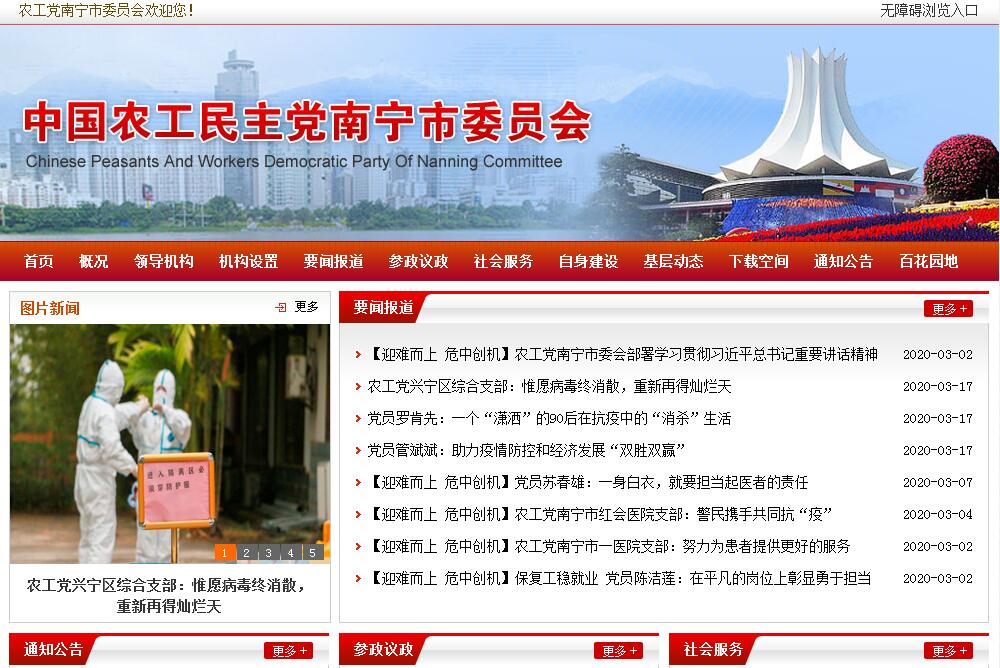 中國農(nóng)工民主黨南寧市委員會是農(nóng)工黨市級地方組織。解放前,農(nóng)工黨在南寧市沒有組織和黨員。解放后,從1951年12月開始在南寧吸收黨員發(fā)展組織。1952年12月4日成立農(nóng)工黨南寧市工作委員會,辦公地址在南寧市興寧路西一里4號同仁堂樓上,同農(nóng)工黨廣西省工委合署辦公。1954年9月12日召開農(nóng)工黨南寧市第一次黨員大會,選舉產(chǎn)生農(nóng)工黨南寧市第一屆委員會。2016年5月7-8日,召開農(nóng)工黨南寧市第十二次黨員代表大會,選舉產(chǎn)生了農(nóng)工黨南寧市第十二屆委員會。農(nóng)工黨南寧市委會歷任主任委員為何自堅、張顯龍、黃道存、宋承錚、彭釗、袁曼虹,現(xiàn)任主任委員黃玉燕。至2016年12月30日,中國農(nóng)工民主黨南寧市委員會轄青秀區(qū)、興寧區(qū)、西鄉(xiāng)塘區(qū)、江南區(qū)、邕寧區(qū)、良慶區(qū)總支6個,基層支部32個。黨員人數(shù)608人(新發(fā)展黨員30人),其中,醫(yī)衛(wèi)界326人,教育界93人,財稅界42人,科技界21人,文化出版界10人,法律界8人,國有經(jīng)濟23人,非公經(jīng)濟16人,機關(guān)54人,其他14人。黨員中,本科學歷的312人,研究生以上學歷的73人(其中博士4人),具有高、中級專業(yè)技術(shù)職務(wù)任職資格426人;任農(nóng)工黨廣西區(qū)委委員4人(常委1人);自治區(qū)人大代表1人,市人大代表8人,城區(qū)(縣)級人大代表8人(副主任3人,常委1人);自治區(qū)政協(xié)委員3人(常委1人),市政協(xié)委員22人(常委4人);城區(qū)政協(xié)委員39人(副主席1人,常委6人);擔任黨委、政府部門處級實職7人、科級職級56人;受聘任自治區(qū)、南寧市、城區(qū)政府及有關(guān)單位特邀監(jiān)察員、執(zhí)法監(jiān)督員、行風評議員等9人。農(nóng)工黨南寧市委會曾獲得農(nóng)工黨中央“組織工作成績獎”、“組織工作先進集體”、“政治交接學習教育活動先進市級組織”、“開展樹立和踐行社會主義核心價值體系活動先進市級組織”、“社情民意工作先進單位”、“智力支邊扶貧先進單位”、“國際科學與和平周活動先進集體”、“中國環(huán)境與健康宣傳周先進集體”、“社會服務(wù)工作先進市級組織”等表彰。農(nóng)工黨中央機關(guān)刊物為《前進論壇》。農(nóng)工黨廣西區(qū)委和南寧市委會分別出版內(nèi)刊《廣西農(nóng)工》和《南寧農(nóng)工》。