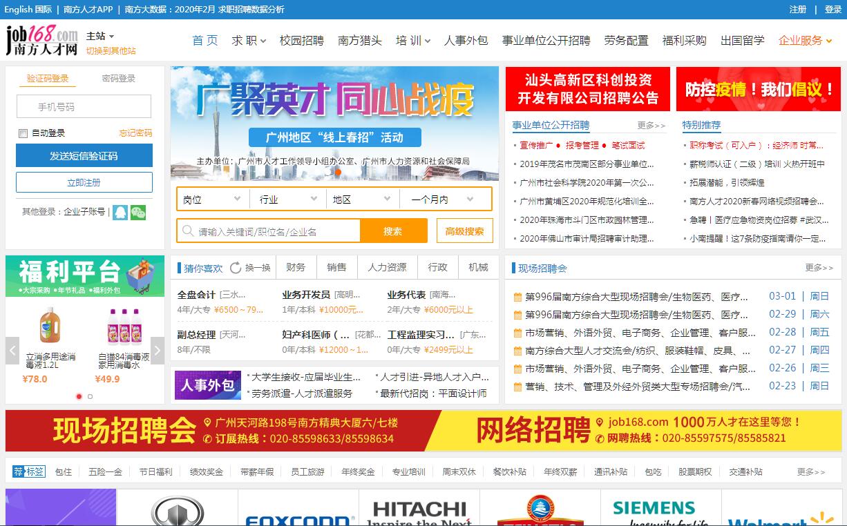 中國南方人才市場成立于1995年,是國家人力資源和社會保障部與廣州市政府聯(lián)合組建的國家級區(qū)域性人才市場,專注于人力資源服務(wù)領(lǐng)域,以企業(yè)和人才需求為導(dǎo)向,按照專業(yè)化、信息化、產(chǎn)業(yè)化、國際化發(fā)展方向,逐步發(fā)展形成了覆蓋人力資源服務(wù)全方位的完整產(chǎn)業(yè)鏈,業(yè)務(wù)涵蓋人事代理、人才租賃(派遣)、現(xiàn)場招聘會、人才網(wǎng)站、考試測評、獵頭、人才培訓(xùn)、畢業(yè)生就業(yè)服務(wù)、國際人才交流、管理咨詢等各個環(huán)節(jié)。是廣州地區(qū)引進和服務(wù)人才的主要窗口,也是華南地區(qū)人才交流的主渠道,服務(wù)水平和業(yè)務(wù)規(guī)模在全國人才市場同行中處于領(lǐng)先地位。南方人才配置中心(廣州南方人才資訊科技有限公司)是中國南方人才市場下屬的人力資源服務(wù)機構(gòu),提供包括現(xiàn)場招聘、網(wǎng)絡(luò)招聘、南方獵頭、職業(yè)培訓(xùn)、政企服務(wù)、人事外包、招聘外包、福利平臺、HR俱樂部等在內(nèi)的全方位人力資源服務(wù)。本著“服務(wù)社會,服務(wù)人才”的宗旨,以“現(xiàn)場+網(wǎng)站+移動互聯(lián)網(wǎng)”全方位服務(wù)模式,開啟了國內(nèi)O2O立體化招聘模式先河,打造了華南地區(qū)最成熟、最具綜合實力的招聘主平臺,為廣大用人單位和人才提供超一流的專業(yè)人力資源服務(wù)。地址:廣州市天河區(qū)天河路198號(8層)。南方人才現(xiàn)場招聘會是中國南方人才市場旗下的人力資源服務(wù)平臺,擁有超過20年成功辦會經(jīng)驗。每年舉辦近300場招聘會,進場單位達(dá)5萬家次,求職人數(shù)超過100萬人次。2017年初啟用招聘會電子海報系統(tǒng),首創(chuàng)無紙化招聘求職模式,求職者可掃碼入場并投遞電子簡歷,令傳統(tǒng)招聘會煥發(fā)新的生機。多年來,堅持以優(yōu)質(zhì)的專業(yè)服務(wù)為中心,強大的技術(shù)研發(fā)為支撐,豐富的客戶資源為基礎(chǔ),打造成為了南中國人才現(xiàn)場交流的主平臺。Job168.com南方人才網(wǎng)是中國南方人才市場旗下官方人力資源服務(wù)網(wǎng)站,利用強大的技術(shù)手段和人性化、完備的功能服務(wù),全方位、多渠道提供招聘求職體驗,成為眾多用戶的選擇。截至目前,會員企業(yè)逾100萬家,個人注冊簡歷量超過1000萬份,每月發(fā)布職位信息高達(dá)150萬條,網(wǎng)站日均頁面瀏覽量超過2000萬,是華南地區(qū)最具影響力的專業(yè)人力資源網(wǎng)站。