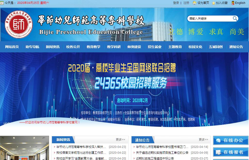 畢節(jié)幼兒師范高等??茖W(xué)校是經(jīng)教育部批準設(shè)置的一所全日制普通高等學(xué)校,是畢節(jié)市唯一一所師范類高等??茖W(xué)校。學(xué)校始建于1916年的織金師范講習(xí)所,歷經(jīng)國民教育師資訓(xùn)練班、簡易師范、織金師范、耕讀師范、織金縣師范學(xué)校、貴州省織金師范學(xué)校、畢節(jié)地區(qū)幼兒師范學(xué)校等時期。2015年3月18日,經(jīng)教育部批準在原畢節(jié)市幼兒師范學(xué)校基礎(chǔ)上設(shè)立畢節(jié)幼兒師范高等??茖W(xué)校。學(xué)校占地面積530.24畝,規(guī)劃建筑面積25.61萬平方米,已建成14.23萬平方米。建有圖書館、多功能學(xué)術(shù)報告廳、體育館、標準化的體育場、蒙臺梭利實訓(xùn)室、奧爾夫音樂實訓(xùn)室、科學(xué)實訓(xùn)室、舞蹈實訓(xùn)室、音樂排練廳、陳鶴琴教育思想研究與推廣中心、胡家勛大師工作室、黔西北民族民間音樂舞蹈研究所、黔西北民族民間工藝品研究所、兒童藝術(shù)教育研究中心等完善的實訓(xùn)室,校外實習(xí)基地120個。學(xué)校設(shè)有學(xué)前教育、早期教育、英語教育、小學(xué)教育、美術(shù)、藝術(shù)設(shè)計、舞蹈表演、音樂表演、環(huán)境藝術(shù)設(shè)計、廣告設(shè)計與制作等十個專業(yè),面向全國7個?。ㄗ灾螀^(qū)、直轄市)招生,現(xiàn)有在校生5300余人?,F(xiàn)有專兼職教師200余人,其中教授10人,副高以上職稱52人,碩士學(xué)位54人。有全國先進工作者1人,省級學(xué)術(shù)先鋒1人,市管專家1人,省市級優(yōu)秀教師、骨干教師等37人;國家級普通話水平測試員3人,省級普通話水平測試員8人。2019年學(xué)校遴選出專業(yè)學(xué)科帶頭人1人,專業(yè)學(xué)術(shù)帶頭人3人,學(xué)術(shù)骨干12人。學(xué)校現(xiàn)建有省級研究中心1個,省級學(xué)術(shù)先鋒核心團隊1個(團隊成員13人),省級精品課程兩門。學(xué)校堅持社會主義辦學(xué)方向,全面落實立德樹人根本任務(wù)。堅持地方性、師范性、應(yīng)用型的辦學(xué)定位,確立質(zhì)量立校、人才強校、特色興校、從嚴治校的發(fā)展戰(zhàn)略,凝練出符合高校管理的“12345”辦學(xué)思想,構(gòu)建符合教育規(guī)律的“123451”人才培養(yǎng)體系,為地方培養(yǎng)品德高尚、基礎(chǔ)扎實、藝術(shù)見長、一專多能合格的學(xué)前教育教師。學(xué)校經(jīng)過長期對幼兒健康、語言、社會、科學(xué)、藝術(shù)教育等五大領(lǐng)域的探索和積淀,秉承“立德 、博愛、求真、尚美”的校訓(xùn),以“十個一”作為學(xué)生的基本素養(yǎng)要求,形成了人文素養(yǎng)、科學(xué)素養(yǎng)、藝術(shù)素養(yǎng)、職業(yè)素養(yǎng)“四元融合”的人才培養(yǎng)模式的辦學(xué)特色。學(xué)校注重國內(nèi)外交流與合作,與廣州大學(xué)、貴州工程應(yīng)用技術(shù)學(xué)院、徐州幼兒師范高等專科學(xué)校、貴陽幼兒師范高等??茖W(xué)校等國內(nèi)高校建立了合作關(guān)系;與廣州大學(xué)、徐州幼兒師范高等??茖W(xué)校簽署了東西部幫扶戰(zhàn)略框架協(xié)議;與深圳市鹽田區(qū)教育科學(xué)院及區(qū)內(nèi)幼兒園開展“?!獔@”合作,為學(xué)生見習(xí)、跟崗、頂崗、就業(yè)、創(chuàng)業(yè)搭建平臺,提升教學(xué)水平,提高學(xué)生就業(yè)質(zhì)量;與以色列奧蘭尼教育學(xué)院簽訂戰(zhàn)略合作備忘錄,采取“引進來”“走出去”的方式開展全面合作,提升國際化辦學(xué)水平。進入新時代,學(xué)校著眼于高等教育發(fā)展的新形勢和地方經(jīng)濟社會發(fā)展的新需求,貫徹落實創(chuàng)新、協(xié)調(diào)、綠色、開放、共享新發(fā)展理念,以人才培養(yǎng)為中心,加快治理體系和治理能力現(xiàn)代化建設(shè),凝心聚力,為把學(xué)校建成特色鮮明的高水平幼兒師范高等??茖W(xué)校而努力奮斗!