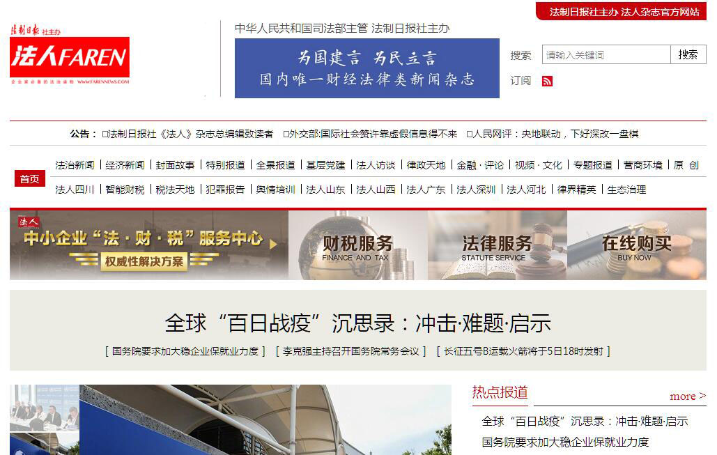 法人網(wǎng)(www.farennews.cn)是法制日?qǐng)?bào)社旗下《法人》雜志唯一的官方網(wǎng)站。《法人》雜志作為中央政法委機(jī)關(guān)報(bào)《法制日?qǐng)?bào)》的子刊,創(chuàng)刊于2004年1月,是中國(guó)唯一的財(cái)經(jīng)法律類新聞雜志。《法人》雜志自創(chuàng)刊以來始終遵循“把法治思維導(dǎo)入企業(yè)管理”的辦刊宗旨,秉持法律角度、全球視野、深度調(diào)查的理念,抵近法律和財(cái)經(jīng)事件的內(nèi)核,關(guān)注企業(yè)和企業(yè)家的發(fā)展環(huán)境以及權(quán)益保障,關(guān)注商業(yè)邏輯,關(guān)注企業(yè)家的命運(yùn)?!斗ㄈ恕冯s志依托法制日?qǐng)?bào)社,擁有得天獨(dú)厚的法律資源和眾多信息渠道,在企業(yè)界、法律界以及傳播領(lǐng)域均享有良好的口碑。法人網(wǎng)將充分發(fā)揮這一切資源價(jià)值,致力于構(gòu)建“權(quán)威性、導(dǎo)向性、互動(dòng)性和服務(wù)性”四大優(yōu)勢(shì),不僅為企業(yè)界人士提供法務(wù)參考與意見立場(chǎng),還將成為連接法律職業(yè)群體和企業(yè)法律服務(wù)需求的橋梁。