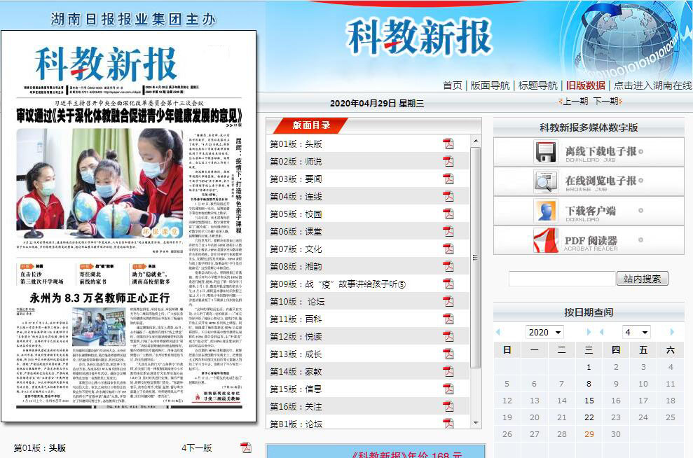科教新報(bào)電子版,科教新報(bào)多媒體數(shù)字報(bào)刊?!犊平绦聢?bào)》創(chuàng)刊于1983年,是湖南日?qǐng)?bào)報(bào)業(yè)集團(tuán)下屬的教育綜合類報(bào)紙,也是湖南省唯一一份教育專業(yè)報(bào)。由湖南日?qǐng)?bào)報(bào)業(yè)集團(tuán)主管,華聲在線股份有限公司主辦,華聲在線股份有限公司文萃傳媒分公司出版。國(guó)內(nèi)統(tǒng)一刊號(hào):CN43-0044,郵發(fā)代號(hào):41-8。4開16版,每周三出版。