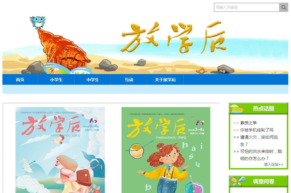 | 網(wǎng)站簡介: 放學后電子版,放學后多媒體數(shù)字報刊?!斗艑W后》是由湖南日報報業(yè)集團主管主辦的教育類專業(yè)刊物。國內統(tǒng)一刊號CN43—1518/G4,郵發(fā)代號42-398(小學生)42-399(中學生)。為少年兒童提供融知識性、趣味性于一體的課外閱讀素材,講述成長故事,交流學習收獲,服務素質教育,傳遞人文精神,陪伴青少年快樂成長。 |