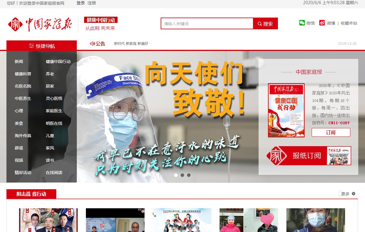 《中國家庭報》于2015年7月5日正式創(chuàng)刊。是國家衛(wèi)生健康委人口文化發(fā)展中心主管主辦,國家衛(wèi)生健康委基層衛(wèi)生健康司、人口監(jiān)測與家庭發(fā)展司和宣傳司支持聯(lián)辦的全國唯一一家聚焦家庭健康建設(shè)與家風文化傳播的綜合性行業(yè)媒體。2020年《中國家庭報》將切合當代媒體傳播特點進行全面改版,實現(xiàn)報紙與網(wǎng)絡(luò)媒體的互動融合,同時設(shè)立“健康中國行動”“中國健康達人”等專版專欄,推出“健康中國說”等報網(wǎng)融合創(chuàng)新型產(chǎn)品,全面助力健康中國行動的宣傳與推廣。
