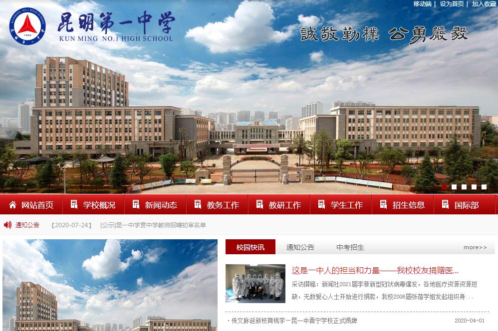 昆明市第一中學(xué)是云南省一級(jí)一等高級(jí)中學(xué)。學(xué)校創(chuàng)建于1905年,廢經(jīng)正書院改辦學(xué)堂,名為“省會(huì)中學(xué)堂”。 1909 年省學(xué)務(wù)處征調(diào)省會(huì)中學(xué)堂堂舍辦云南圖書館,將省會(huì)中學(xué)堂與師范傳習(xí)所合并成為兩級(jí)師范學(xué)堂附屬中學(xué)堂。1911 年“重九”起義后,兩級(jí)師范附屬中學(xué)堂、高等學(xué)堂(前方言學(xué)堂)、第一模范中學(xué)堂(前云南府中學(xué)堂)三校合并,于 1912 年 2 月命名“云南省立第一中學(xué)?!薄?1932年云南省立第一中學(xué)與云南省立第五中學(xué)(前私立成德中學(xué)、云南中學(xué)校)合并,改名“云南省立昆華中學(xué)”。1950年昆華中學(xué)合并龍淵中學(xué)、昆華師范附中,更名“云南省昆明第一中學(xué)”。至 1984年定名為“昆明市第一中學(xué)”。學(xué)校占地 200 余畝,校園環(huán)境優(yōu)美,教學(xué)設(shè)備先進(jìn)、教學(xué)設(shè)施齊全?,F(xiàn)有在校學(xué)生 3000 余人,有在職特級(jí)教師 10 人,正高級(jí)教師7人,高級(jí)教師113人,昆明市首席高級(jí)教師4 人,設(shè)有昆明市名的“趙燦東名校長(zhǎng)基地”,省市命名的 “孫彪名師工作室”“楊昆華名師工作室”“譚毅名師工作室”“張敏名師工作室”“李競(jìng)飛美術(shù)特色工作室”五個(gè)名師工作室。學(xué)校堅(jiān)持以教學(xué)為中心,以學(xué)生的全面發(fā)展為主線,以德育為先導(dǎo),以向高等學(xué)校輸送優(yōu)秀人才為具體目標(biāo),努力構(gòu)建具有個(gè)性化,能充分發(fā)揮學(xué)生特長(zhǎng)的具有昆一中特色的教學(xué)體系,為學(xué)生的終身發(fā)展奠基。學(xué)校形成了“好學(xué)上進(jìn)、全面發(fā)展、勇于探索、特長(zhǎng)明顯 ”的辦學(xué)特色;“愛國(guó)、求真、自信、勤奮”的校風(fēng);“樹德、修業(yè)、嚴(yán)謹(jǐn)、進(jìn)取”的教風(fēng);“ 立志、勤學(xué)、善思、踐行”的學(xué)風(fēng)。學(xué)校注重培養(yǎng)學(xué)生的創(chuàng)新精神、實(shí)踐能力和個(gè)性特長(zhǎng),堅(jiān)持開展豐富多彩的校園文化活動(dòng),讓校園成為同學(xué)們學(xué)習(xí)、成長(zhǎng),張揚(yáng)個(gè)性,發(fā)展特長(zhǎng)的樂園,努力使學(xué)生成為身心健康、基礎(chǔ)扎實(shí),思維敏捷,潛質(zhì)卓越,具有國(guó)際視野和國(guó)際素養(yǎng)的的合格高中生。從各具特色的班級(jí)才藝展示到多彩的年級(jí)文藝匯演;從課本劇、音樂劇比賽、辯論賽到“校園之春”藝術(shù)節(jié)、“五四”系列活動(dòng)、“昆華講壇”系列活動(dòng);從“春風(fēng)杯”足球賽、排球賽、籃球賽到冬季運(yùn)動(dòng)會(huì)等,豐富多彩的校園文化活動(dòng),已經(jīng)形成制度,形成系列,為學(xué)生張揚(yáng)個(gè)性、全面發(fā)展提供了廣闊的舞臺(tái)。學(xué)校重視學(xué)生社團(tuán)組織的建設(shè),注重讓學(xué)生在自己的社團(tuán)組織中培養(yǎng)能力,自我服務(wù)、自我教育,加快成長(zhǎng)。學(xué)校管樂隊(duì)、校園電視臺(tái)、校園廣播站、軍事活動(dòng)小組、新聞社、文學(xué)社、心樂琴社、動(dòng)漫社等近 30 多個(gè)學(xué)生社團(tuán)組織朝氣蓬勃,成為校園中一道亮麗的風(fēng)景線。學(xué)校堅(jiān)持以教學(xué)為中心,注重強(qiáng)化教學(xué)過程管理,堅(jiān)持向過程管理要質(zhì)量、要效益,努力提高教學(xué)質(zhì)量。 學(xué)校歷年高考上線率、優(yōu)秀率以及各類學(xué)科競(jìng)賽、文藝體育比賽等均名列省、市前茅,學(xué)校畢業(yè)生德、智、體、美全面發(fā)展,能很快適應(yīng)升學(xué)和就業(yè)的需要,具有很強(qiáng)的發(fā)展后勁,受到用人單位和高一級(jí)學(xué)校的一致好評(píng)。在云南省教育廳對(duì)一級(jí)完中的教育教學(xué)質(zhì)量綜合量化考評(píng)中, 2005至2017年連續(xù)13年被云南省教育廳評(píng)為教育教學(xué)質(zhì)量?jī)?yōu)秀學(xué)校,榮獲云南省高中教育教學(xué)質(zhì)量一等獎(jiǎng)。86%以上的學(xué)生能進(jìn)入重點(diǎn)大學(xué)。學(xué)校在奧林匹克學(xué)科競(jìng)賽、青少年科技創(chuàng)新競(jìng)賽等國(guó)際、國(guó)家、省、市組織的各類比賽中,成績(jī)突出,頻頻獲獎(jiǎng)。王翀、張揚(yáng)兩位同學(xué)在2005全國(guó)中學(xué)生奧林匹克化學(xué)競(jìng)賽中均獲金獎(jiǎng),刷新了建國(guó)以來云南省中學(xué)生國(guó)奧賽金獎(jiǎng)零的紀(jì)錄。學(xué)校以歷史悠久,文化底蘊(yùn)深厚,高質(zhì)量的教育教學(xué)質(zhì)量和學(xué)生的全面發(fā)展受到社會(huì)的廣泛認(rèn)可。近年來,學(xué)校先后被評(píng)為“全國(guó)文明單位”“全國(guó)文明校園”“全國(guó)教育系統(tǒng)先進(jìn)單位”“全國(guó)依法治校先進(jìn)單位”“全國(guó)群眾體育先進(jìn)學(xué)?!薄叭珖?guó)奧林匹克教育示范學(xué)?!薄叭珖?guó)創(chuàng)建綠色學(xué)校先進(jìn)單位””全國(guó)校園文化藝術(shù)建設(shè)先進(jìn)學(xué)?!薄叭珖?guó)首屆學(xué)校文化建設(shè)金獎(jiǎng)” “全國(guó)中小學(xué)科研興校示范基地”“云南省未成年人思想道德示范基地”等,被上級(jí)部門和社會(huì)各界譽(yù)為實(shí)施素質