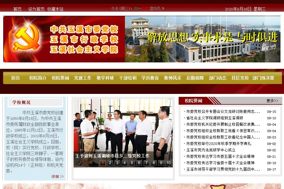 中共玉溪市委黨校創(chuàng)建于1950年9月15日,為中共玉溪市委所屬財(cái)政全額撥款事業(yè)單位。1995年12月12日,玉溪市行政學(xué)校成立。2002年6月25日,玉溪社會主義學(xué)院成立。目前,校(院)實(shí)行黨校、行政學(xué)校、社會主義學(xué)院三塊牌子、一套班子。校(院)位于玉溪市紅塔區(qū)春和街道,與九龍池風(fēng)景名勝區(qū)、飛井海水庫水源保護(hù)地相鄰,總占地面積155.83畝,校舍總建筑面積65584㎡,是一座基礎(chǔ)設(shè)施配套齊全,功能布局均勻協(xié)調(diào)的現(xiàn)代化干部教育培訓(xùn)基地。校園分為教學(xué)區(qū)、生活區(qū)、運(yùn)動區(qū)、名木古樹區(qū)、文化暢想?yún)^(qū)五大功能區(qū),建有現(xiàn)代化的綜合樓、報(bào)告廳、學(xué)員樓、餐廳、專家公寓、文體館、半地下架空停車庫等設(shè)施,能同時(shí)容納1000人學(xué)習(xí)、就餐、住宿。園內(nèi)古樹蒼郁、山水相映、景色宜人,是云南省園林單位和玉溪市五星級園林單位。校內(nèi)建有玉溪市反腐倡廉警示教育基地,是中央黨校黨建教學(xué)科研玉溪聯(lián)系點(diǎn)和玉溪市領(lǐng)導(dǎo)干部法制教育培訓(xùn)基地、玉溪市軍轉(zhuǎn)干部培訓(xùn)基地、玉溪市工會活動基地、玉溪市市直單位職工活動中心、玉溪市社科普及宣傳示范基地,被評為云南省文明單位、玉溪市食品流通監(jiān)管系統(tǒng)試點(diǎn)單位、玉溪市餐飲服務(wù)食品安全A級單位和校園改擴(kuò)建優(yōu)質(zhì)工程一等獎(jiǎng)。