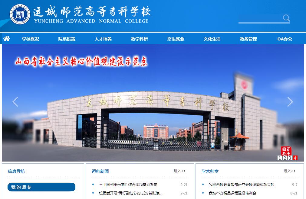運城師范高等專科學(xué)校是經(jīng)山西省人民政府和國家教育部正式批準備案的公辦全日制高等師范院校。學(xué)校位于運城市舜帝陵景區(qū)的大學(xué)城,與運城學(xué)院和運城護理職業(yè)學(xué)院毗鄰,占地450余畝,是一所高標準、現(xiàn)代化的師范??茖W(xué)校。作為其前身的運城師范學(xué)校和稷山師范學(xué)校,都曾是享譽河?xùn)|、名揚三晉的老牌名校。一個世紀以來,為國家培養(yǎng)了首任駐美大使柴澤民,原國務(wù)院副秘書長鄭思遠,全國政協(xié)常委、中國作協(xié)副主席、山西省副省長張平,原成都軍區(qū)政委上將張志堅等一批著名黨政軍干部和數(shù)以萬計的優(yōu)秀中小學(xué)教師。改革開放后,我校以質(zhì)量求生存、以管理謀發(fā)展、以科研為先導(dǎo)、以就業(yè)為導(dǎo)向、以培養(yǎng)具有創(chuàng)新精神和實踐能力的專科層次小學(xué)教師為根本,夯實高師基礎(chǔ),凸顯師范特色,深化以教學(xué)為中心的各項改革,不斷提升學(xué)校辦學(xué)水平和綜合實力,為山西向東向西經(jīng)濟發(fā)展及晉、陜、豫黃河金三角社會經(jīng)濟和地方教育事業(yè)發(fā)展與全面進步提供了強有力的人才支撐和智力支持,贏得了社會的廣泛認可,先后榮獲“全國素質(zhì)教育百面旗”、“全國藝術(shù)教育先進單位”、“全國體育工作先進單位”、“全國五四紅旗團委”、“山西省優(yōu)秀師范學(xué)?!?、“山西省文明學(xué)校”、“山西省中小學(xué)教師培養(yǎng)工作先進單位”等多項殊榮。學(xué)校環(huán)境優(yōu)美、設(shè)施先進。有教學(xué)樓、實驗樓、藝術(shù)樓、圖書館、演播大廳、體育館、辦公樓、學(xué)生公寓樓、餐廳等15棟高標準建筑。配備有微機室、校園廣播電視臺、語音室、電子圖書閱覽室、心理咨詢室、理化實驗室、塑膠操場等現(xiàn)代化教學(xué)設(shè)施,所有教室全部安裝有多媒體教學(xué)設(shè)備。學(xué)校師資力量雄厚。共有專兼職教師429人,其中博士研究生2人,碩士研究生125人,外籍教師4人,特級教師3人,全國模范教師2人,省級學(xué)科帶頭人7人,省級骨干教師8人,副教授107人,講師203人,是國家級課題研究實驗校。學(xué)校始終堅持“以人為本”的辦學(xué)思想,積極探索融合傳授知識、培養(yǎng)能力、提高素質(zhì)、發(fā)展個性為一體的新型人才培養(yǎng)方案,突出師范特色,注重學(xué)生基本功培養(yǎng)。要求每個學(xué)生都要通過國家普通話測試、簡筆畫過關(guān)測試、規(guī)范字書寫等級考核。積極組織學(xué)生參加小學(xué)教師資格證、英語四六級考試、計算機等級考試和專升本考試,每年都有一大批學(xué)生升入高一級院校繼續(xù)深造。運城高等師范??茖W(xué)校是你塑造完美人格、提高從業(yè)能力、實現(xiàn)人生價值的理想選擇。