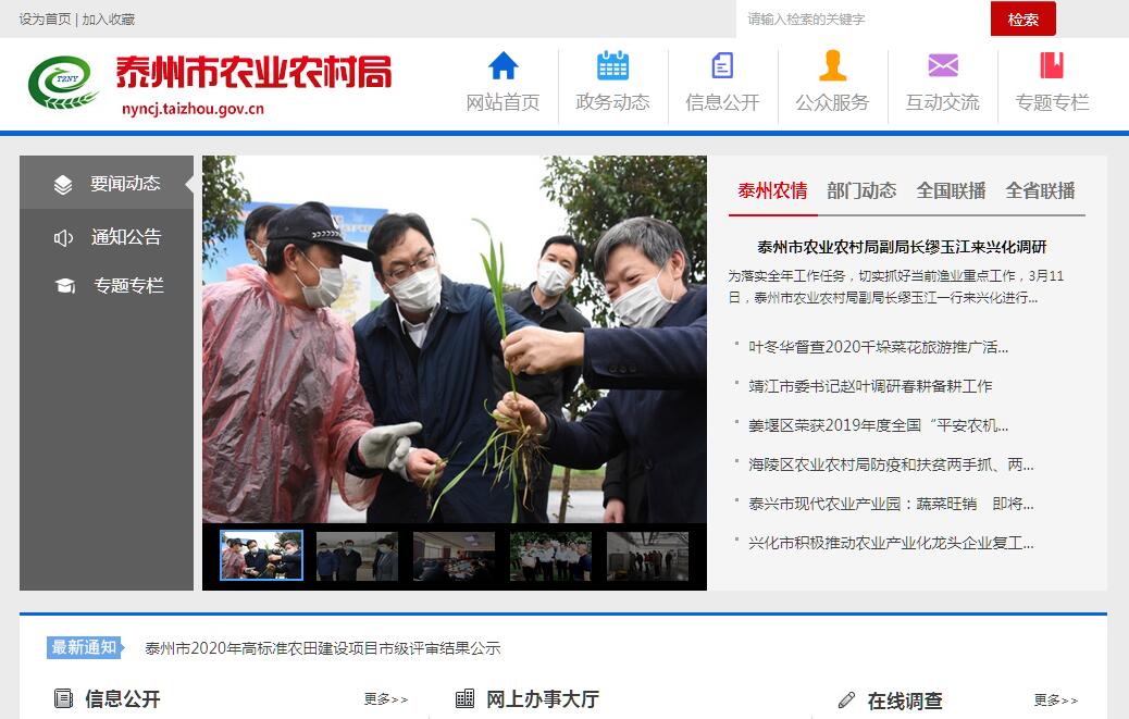 泰州市農(nóng)業(yè)農(nóng)村局負責貫徹落實中央關(guān)于“三農(nóng)”、扶貧工作的方針政策和省委、市委的決策部署,在履行職責過程中堅持和加強黨對“三農(nóng)”、扶貧工作的集中統(tǒng)一領(lǐng)導。其主要職責是:(一)貫徹落實“三農(nóng)”、扶貧工作發(fā)展戰(zhàn)略,統(tǒng)籌研究和組織實施全市“三農(nóng)”、扶貧工作發(fā)展戰(zhàn)略、中長期規(guī)劃、重大政策。依法參與起草相關(guān)地方性法規(guī)、規(guī)章草案,指導農(nóng)業(yè)綜合執(zhí)法。參與涉農(nóng)財稅、價格、收儲、金融保險、進出口等政策制定;(二)統(tǒng)籌推動發(fā)展農(nóng)村社會事業(yè)、農(nóng)村公共服務、農(nóng)村文化、農(nóng)村基礎(chǔ)設(shè)施和鄉(xiāng)村治理。牽頭組織改善農(nóng)村人居環(huán)境。指導農(nóng)村精神文明和優(yōu)秀農(nóng)耕文化建設(shè)。指導農(nóng)業(yè)行業(yè)安全生產(chǎn)工作;(三)擬訂深化農(nóng)村經(jīng)濟體制改革和鞏固完善農(nóng)村基本經(jīng)營制度的政策。負責農(nóng)民承包地、農(nóng)村宅基地改革和管理有關(guān)工作。負責農(nóng)村集體產(chǎn)權(quán)制度改草,指導農(nóng)村集體經(jīng)濟組織發(fā)展和集體資產(chǎn)管理工作。指導農(nóng)民合作經(jīng)濟組織、農(nóng)業(yè)社會化服務體系、新型農(nóng)業(yè)經(jīng)營主體建設(shè)與發(fā)展;(四)協(xié)調(diào)擬訂財政專項扶貧資金的分配、使用方案。建立健全扶貧開發(fā)協(xié)調(diào)機制,統(tǒng)籌推進專項扶貧、行業(yè)扶貧和社會扶貧。推進落實精準扶貧精準脫貧工作長效機制,探索緩解相對貧困的有效路徑。建立健全扶貧工作責任制,制定和落實扶貧開發(fā)目標責任和考核評價辦法。負責全市扶貧開發(fā)宣傳、培訓和信息化建設(shè)等工作。指導市老區(qū)建設(shè)促進會、扶貧開發(fā)協(xié)會、扶貧基金會工作;(五)指導鄉(xiāng)村特色產(chǎn)業(yè)、農(nóng)產(chǎn)品加工業(yè)、體閑農(nóng)業(yè)發(fā)展工作。提出促進大宗農(nóng)產(chǎn)品流通建議,培育、保護農(nóng)業(yè)品牌。發(fā)布農(nóng)業(yè)農(nóng)村經(jīng)濟信息,監(jiān)測分析農(nóng)業(yè)農(nóng)村經(jīng)濟運行。承擔農(nóng)業(yè)統(tǒng)計和農(nóng)業(yè)農(nóng)村信息化有關(guān)工作;(六)負責種植業(yè)、畜牧業(yè)、漁業(yè)、農(nóng)業(yè)機械化等農(nóng)業(yè)各產(chǎn)業(yè)工作的監(jiān)督管理。指導糧食等農(nóng)產(chǎn)品生產(chǎn)。組織構(gòu)建現(xiàn)代農(nóng)業(yè)產(chǎn)業(yè)體系、生產(chǎn)體系、經(jīng)營體系,指導種植業(yè)、畜牧業(yè)、漁業(yè)、農(nóng)機標準化生產(chǎn)及建設(shè)工作。負責漁政漁港監(jiān)督管理,承擔漁業(yè)船舶檢驗和監(jiān)督管理職責;(七)負責農(nóng)產(chǎn)品質(zhì)量安全監(jiān)督管理。組織開展農(nóng)產(chǎn)品質(zhì)量安全監(jiān)測、追溯、風險評估。參與制定農(nóng)產(chǎn)品質(zhì)量安全地方標準并會同有關(guān)部門組織實施。指導農(nóng)業(yè)檢驗檢測體系建設(shè)。依法實施符合安全標準的農(nóng)產(chǎn)品認證和監(jiān)督管理;(八)組織農(nóng)業(yè)資源區(qū)劃工作。指導農(nóng)用地、漁業(yè)水域以及農(nóng)業(yè)生物物種資源的保護與管理。負責水生野生動植物保護、耕地及永久基本農(nóng)田質(zhì)量保護工作。推進農(nóng)業(yè)綠色發(fā)展,指導農(nóng)產(chǎn)品產(chǎn)地環(huán)境管理和農(nóng)業(yè)清潔生產(chǎn)及農(nóng)產(chǎn)品禁止生產(chǎn)區(qū)劃定。推廣休耕輪作提高耕地地力,促進農(nóng)業(yè)可持續(xù)發(fā)展。指導設(shè)施農(nóng)業(yè)、生態(tài)循環(huán)農(nóng)業(yè)、節(jié)水農(nóng)業(yè)發(fā)展以及農(nóng)村能源綜合開發(fā)利用、農(nóng)業(yè)生物質(zhì)產(chǎn)業(yè)發(fā)展。牽頭管理外來物種;(九)負責有關(guān)農(nóng)業(yè)生產(chǎn)資料和農(nóng)業(yè)投入品的監(jiān)督管理。組織協(xié)調(diào)農(nóng)業(yè)生產(chǎn)資料市場體系建設(shè),擬訂有關(guān)農(nóng)業(yè)生產(chǎn)資料地方標準并監(jiān)督實施。擬定獸藥質(zhì)量、獸藥殘留限量和殘留檢測方法地方標準并按規(guī)定實施。組織獸醫(yī)醫(yī)政、獸藥藥政藥檢工作,負責執(zhí)業(yè)獸醫(yī)和畜禽屠宰行業(yè)管理。依法開展農(nóng)作物種子(種苗)、種畜禽、肥料、農(nóng)藥、獸藥、飼料及飼料添加劑的相關(guān)許可與監(jiān)督管理。負責重大動物疫病應急防控工作。負責組織查處轄區(qū)內(nèi)跨區(qū)域和具有全市影響的復雜案件,監(jiān)督指導轄區(qū)內(nèi)農(nóng)業(yè)綜合行政執(zhí)法體系建設(shè)和農(nóng)業(yè)執(zhí)法工作;(十)負責農(nóng)業(yè)防災減災、農(nóng)作物重大病蟲害防治、重大動物疫病防控和協(xié)調(diào)漁業(yè)生產(chǎn)安全搜救工作。組織重大動植物疫病的防控工作,發(fā)布疫情并組織撲滅。指導動植物防疫檢疫體系建設(shè)。組織種子、農(nóng)機等救災物資儲備和調(diào)撥,提出生產(chǎn)救災資金安排建議,指導緊急救災和災后恢復生產(chǎn);(十一)負責農(nóng)業(yè)投資管理。提出農(nóng)業(yè)投融資體制機制改革建議。編制市級投資安排的農(nóng)