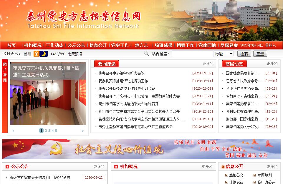 泰州市史志檔案信息網(wǎng)由泰州市史志檔案辦公室主辦。1996年11月20日,市委、市政府(泰委[1996]38號文件)研究決定,成立泰州市史志檔案辦公室(掛泰州市檔案局(館)牌子)。1997年4月11日,市編委(泰編[1997]89號)文件批復(fù),市史志檔案辦公室主管全市黨史、地方志、檔案、年鑒工作并具體負(fù)責(zé)海陵區(qū)的黨史、檔案工作;內(nèi)設(shè)10個處,具體為人秘處、檔案管理處、征集處、檔案業(yè)務(wù)指導(dǎo)一處、檔案業(yè)務(wù)指導(dǎo)二處、科教處、黨史編研一處、黨史編研二處、地方志編纂指導(dǎo)處和年鑒編輯處。1998年1月15日,市委組織部(泰組發(fā)[1998]6號)文件,確定泰州市史志檔案辦公室為參照國家公務(wù)員制度管理單位。1998年12月31日,市編委(泰編[1998]117號)文件批復(fù),同意建立泰州市檔案技術(shù)中心,主要從事檔案技術(shù)的研究與推廣應(yīng)用工作,為全民事業(yè)單位,隸屬于市史志檔案辦公室領(lǐng)導(dǎo)。2006年6月15日,市編辦(泰編辦[2006]33號)文件批復(fù),同意將黨史編研一處更名為黨史宣傳聯(lián)絡(luò)處,黨史編研二處更名為黨史編研處。2010年8月23日,中共泰州市委(泰辦發(fā)〔2010〕70號)文件批復(fù),同意將泰州市史志檔案辦公室更名為泰州市黨史方志檔案辦公室,主管全市黨史、地方志、檔案工作,為市委直屬事業(yè)單位,掛市檔案局、市檔案館牌子。設(shè)11個內(nèi)設(shè)機(jī)構(gòu),具體為綜合處、黨史宣傳聯(lián)絡(luò)處、黨史編研處、地方志編纂指導(dǎo)處、年鑒編輯處、檔案業(yè)務(wù)指導(dǎo)處、檔案法規(guī)教育處、信息技術(shù)處、征集編研處、保管利用處、現(xiàn)行文件利用處(行政許可服務(wù)處)。泰州市黨史方志檔案辦公室不再承擔(dān)海陵區(qū)的黨史、檔案工作,實行屬地管理。