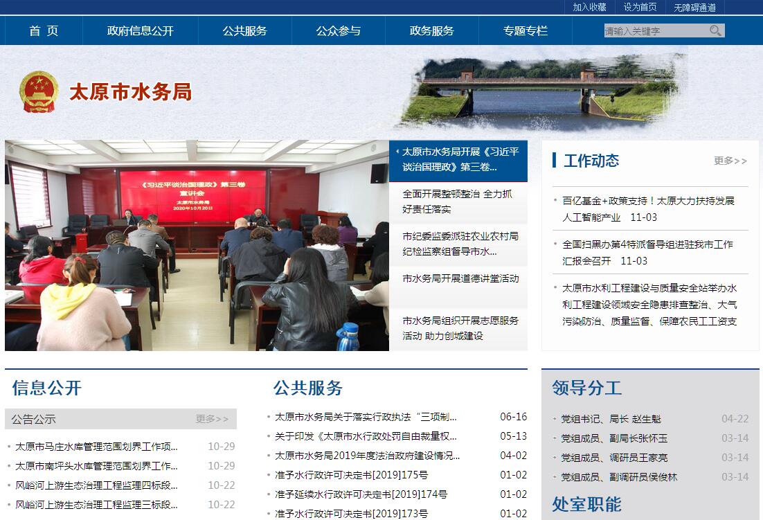 太原市水務(wù)局主要職責(zé):(一)宣傳、貫徹、執(zhí)行國家和省、市水務(wù)(水利)方面的方針、政策、法律法規(guī)。(二)擬定全市水務(wù)工作的發(fā)展戰(zhàn)略和中長期規(guī)劃,組織起草水務(wù)工作地方性法規(guī)草案、地方政府規(guī)章草案送審稿,制定規(guī)范性文件。(三)統(tǒng)一管理全市的水資源(含空中水、地表水、地下水,,組織擬定全市和跨地區(qū)水長期供求計(jì)劃、水量分配方案并監(jiān)督實(shí)施;組織全市有關(guān)國民經(jīng)濟(jì)總體規(guī)劃、城市規(guī)劃及重點(diǎn)建設(shè)項(xiàng)目的水資源開發(fā)利用的論證工作;會(huì)同有關(guān)部門組織實(shí)施取水許可制度和水資源費(fèi)征收制度;發(fā)布全市水資源公報(bào)。(四)負(fù)責(zé)全市節(jié)約用水工作,擬定全市節(jié)約用水政策,編制節(jié)約用水規(guī)劃,制定節(jié)約用水有關(guān)標(biāo)準(zhǔn)并實(shí)施指導(dǎo)監(jiān)督。(五)組織指導(dǎo)全市水政監(jiān)察和水行政執(zhí)法;協(xié)調(diào)并仲裁有關(guān)水事糾紛。(六)擬定全市水資源開發(fā)、利用、保護(hù)和治理規(guī)劃;組織水功能區(qū)的劃分、水資源的優(yōu)化配置和向飲水區(qū)等水域排污的控制;監(jiān)測河、湖、庫、塘的水量、水質(zhì);審定水域納污能力和排污口的設(shè)置,提出限量排污的意見。(七)對水務(wù)資金的使用進(jìn)行宏觀調(diào)節(jié)和管理;指導(dǎo)水務(wù)行業(yè)供水及多種經(jīng)營的開展;研究提出有關(guān)供水、水價(jià)和重點(diǎn)水利工程信貸、財(cái)務(wù)等調(diào)節(jié)意見。(八)組織編制審查全市重點(diǎn)水利基建項(xiàng)目建議書和可研報(bào)告;組織重點(diǎn)水利科學(xué)研究和技術(shù)推廣;組織擬定水務(wù)行業(yè)技術(shù)質(zhì)量標(biāo)準(zhǔn)并監(jiān)督實(shí)施;負(fù)責(zé)水務(wù)行業(yè)重點(diǎn)工程招投標(biāo)活動(dòng)的監(jiān)督執(zhí)法。(九)組織指導(dǎo)全市水利設(shè)施、水域及其岸線的管理與保護(hù);組織指導(dǎo)境內(nèi)重點(diǎn)流域、河道、泉域、湖泊、河岸灘涂和鹽堿地的治理開發(fā);組織建設(shè)和管理具有控制性或跨縣(市、區(qū))的重點(diǎn)水利工程。(十)負(fù)責(zé)并指導(dǎo)全市農(nóng)田水利基本建設(shè)、農(nóng)村人畜飲水和農(nóng)業(yè)節(jié)水灌溉工作。(十一)負(fù)責(zé)并指導(dǎo)全市水土保持工作,研究制定水土保持的工程措施規(guī)劃;組織重點(diǎn)建設(shè)項(xiàng)目水土保持方案的論證、審查和水土流失的監(jiān)測與綜合防治;對有關(guān)水土保持法律法規(guī)的執(zhí)行實(shí)施監(jiān)督。(十二)承擔(dān)市防汛抗旱指揮部的日常工作,組織、協(xié)調(diào)、監(jiān)督、指導(dǎo)全市防汛抗旱工作,對主要河道和主要水利工程實(shí)施防汛抗旱調(diào)度。(十三)負(fù)責(zé)全市水產(chǎn)漁業(yè)和漁政執(zhí)法的監(jiān)督管理工作。(十四)負(fù)責(zé)全市水務(wù)方面的科技、外事、教育工作;指導(dǎo)搞好全市水務(wù)隊(duì)伍的建設(shè)。(十五)承辦市人民政府交辦的其他事項(xiàng)。